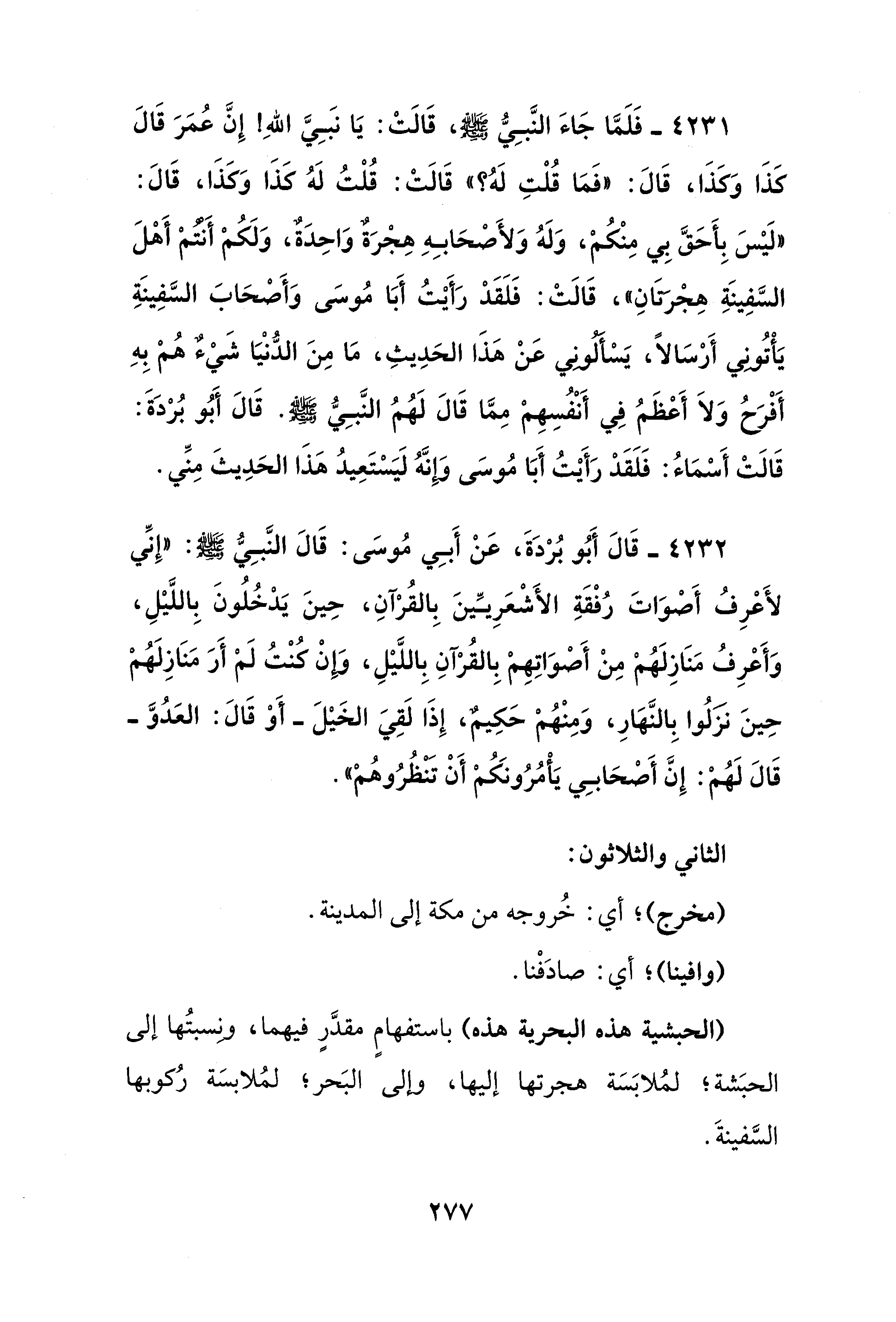 4231 - فَلَمَّا جَاءَ النَّبِيُّ - صلى الله عليه وسلم -، قَالَتْ: يَا نبَيَّ اللهِ! إِنَّ عُمَرَ قَالَ كَذَا وَكَذَا، قَالَ: "فَمَا قُلْتِ لَهُ؟ " قَالَتْ: قُلْتُ لَهُ كَذَا وَكَذَا، قَالَ: "لَيْسَ بِأَحَقَّ بِي مِنْكُمْ، وَلَهُ وَلأَصْحَابِهِ هِجْرَةٌ وَاحِدَةٌ، وَلَكُمْ أَنْتُمْ أَهْلَ السَّفِينَةِ هِجْرَتَانِ"، قَالَتْ: فَلَقَدْ رَأَيْتُ أَبَا مُوسَى وَأَصْحَابَ السَّفِينَةِ يَأْتُونِي أَرْسَالًا، يَسْأَلُونِي عَنْ هَذَا الحَدِيثِ، مَا مِنَ الدُّنْيَا شَيْءٌ هُمْ بِهِ أَفْرَحُ وَلاَ أَعْظَمُ في أَنْفُسِهِمْ مِمَّا قَالَ لَهُمُ النَّبِيُّ - صلى الله عليه وسلم -. قَالَ أَبُو بُرْدَةَ: قَالَتْ أَسْمَاءُ: فَلَقَدْ رَأَيْتُ أَبَا مُوسَى وَإِنَّهُ لَيَسْتَعِيدُ هَذَا الحَدِيثَ مِنِّي.
