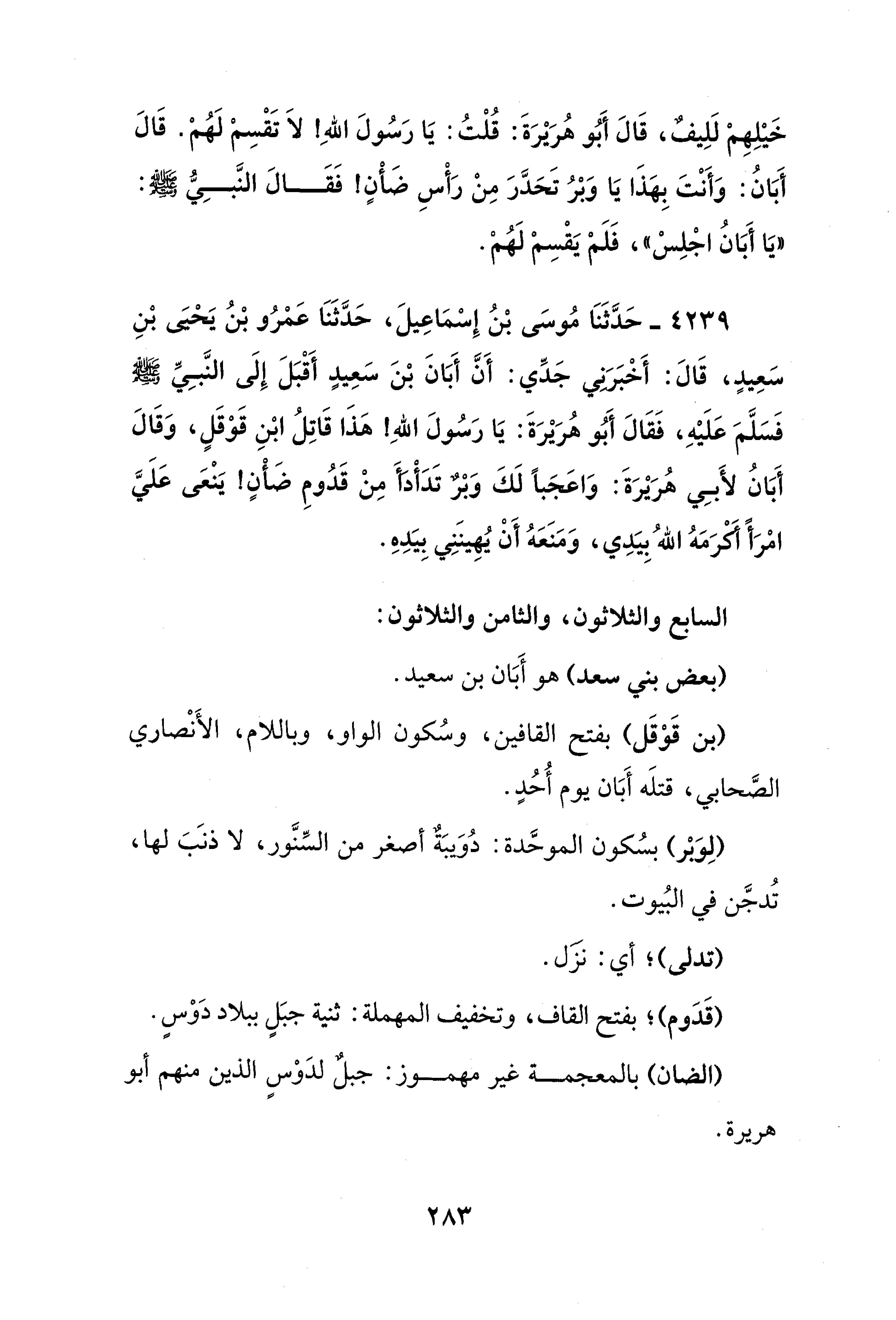 4239 - حَدَّثَنَا مُوسَى بْنُ إِسْمَاعِيلَ، حَدَّثَنَا عَمْرُو بْنُ يَحْيَى بْنِ سَعِيدٍ، قَالَ: أَخْبَرَنِي جَدِّي: أَنَّ أَبَانَ بْنَ سَعِيدٍ أَقْبَلَ إِلَى النَّبِيِّ - صلى الله عليه وسلم - فَسَلَّمَ عَلَيْهِ، فَقَالَ أَبُو هُرَيْرَةَ: يَا رَسُولَ اللهِ! هَذَا قَاتِلُ ابْنِ قَوْقَلٍ، وَقَالَ أَبَانُ لأَبِي هُرَيْرَةَ: وَاعَجَبًا لَكَ وَبْرٌ تَدَأْدَأَ مِنْ قَدُومِ ضَأْنٍ! يَنْعَى عَلَيَّ امْرَأً أَكْرَمَهُ اللهُ بِيَدِي، وَمَنَعَهُ أَنْ يُهِينَنِي بِيَدِهِ.