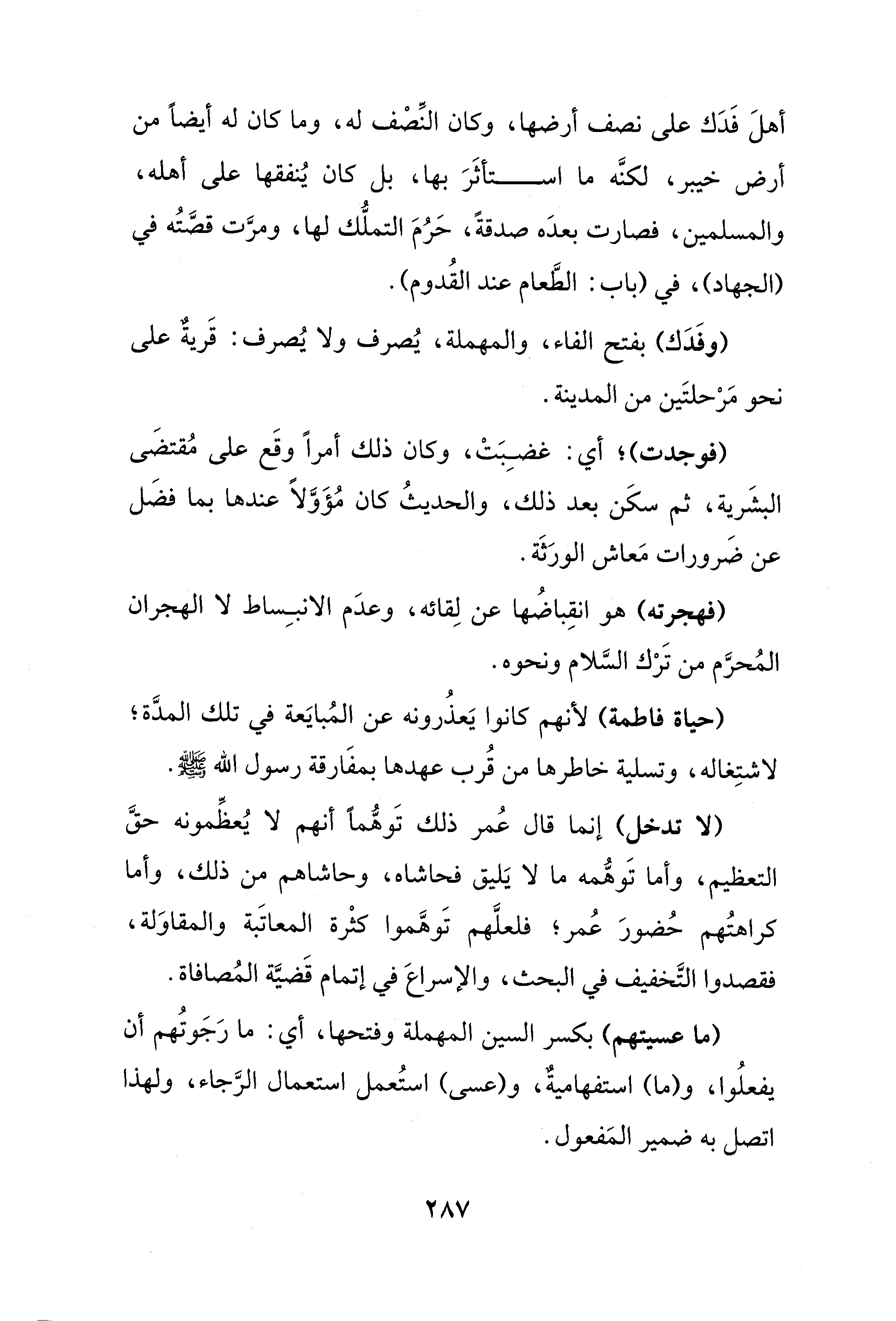 أهلَ فَدَك على نصف أرضها، وكان النِّصْف له، وما كان له أيضًا من أرض خيبر، لكنَّه ما استأثَرَ بها، بل كان يُنفقها على أهله، والمسلمين، فصارت بعدَه صدقةً، حَرُمَ التملُّك لها، ومرَّت قصَّتُه في (الجهاد)، في (باب: الطَّعام عند القُدوم).
