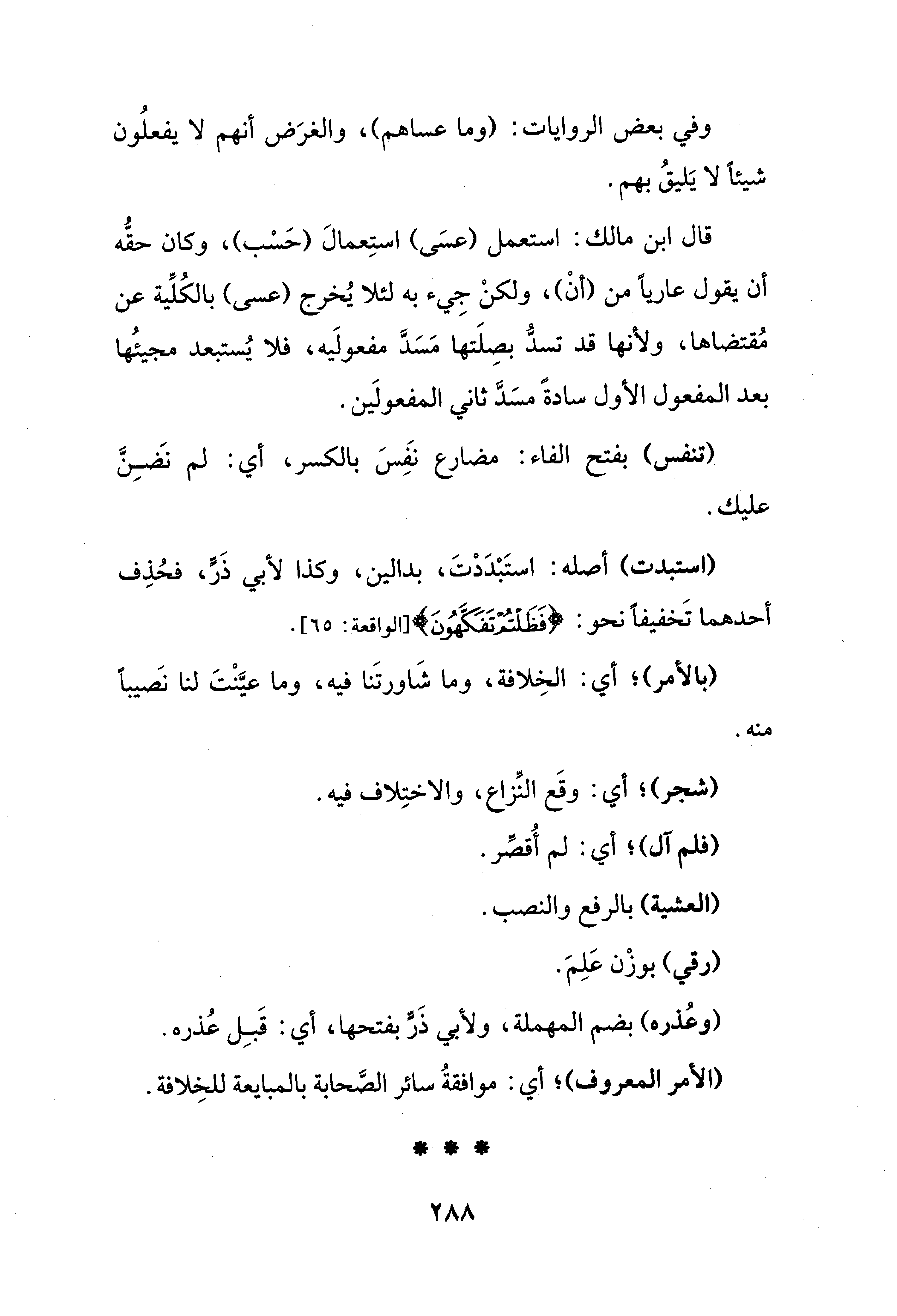 قال ابن مالك: استعمل (عسَى) استِعمالَ (حَسْب)، وكان حقُّه أن يقول عاريًا من (أنْ)، ولكنْ جِيء به لئلا يُخرج (عسى) بالكُلِّية عن مُقتضاها, ولأنها قد تسدُّ بصِلَتها مَسَدَّ مفعولَيه، فلا يُستبعد مجيئُها بعد المفعول الأول سادةً مسَدَّ ثاني المفعولَين.