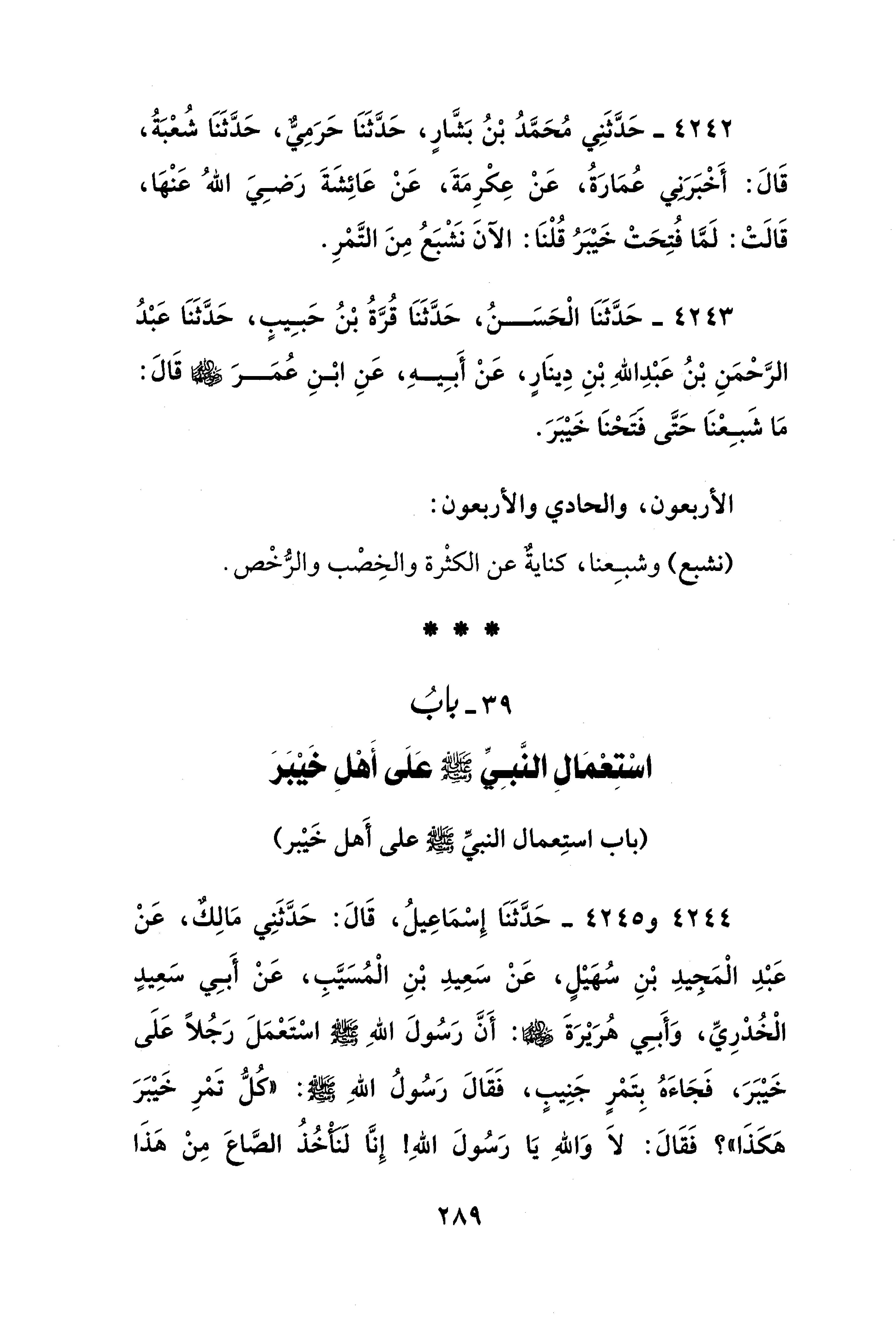 4244 - و 4245 - حَدَّثَنَا إِسْمَاعِيلُ، قَالَ: حَدَّثَنِي مَالِكٌ، عَنْ عَبْدِ الْمَجيدِ بْنِ سُهَيْلٍ، عَنْ سَعِيدِ بْنِ الْمُسَيَّبِ، عَنْ أَبِي سَعِيدٍ الْخُدْرِيِّ، وَأَبِي هُرَيْرَةَ - رضي الله عنهما -: أَنَّ رَسُولَ اللهِ - صلى الله عليه وسلم - اسْتَعْمَلَ رَجُلًا عَلَى خَيْبَرَ، فَجَاءَهُ بِتَمْرٍ جَنِيبٍ، فَقَالَ رَسُولُ اللهِ - صلى الله عليه وسلم -: "كُلُّ تَمْرِ خَيْبَرَ هَكَذَا"؟ فَقَالَ: لاَ وَاللهِ يَا رَسُولَ اللهِ! إِنَّا لَنَأْخُذُ الصَّاعَ مِنْ هَذَا