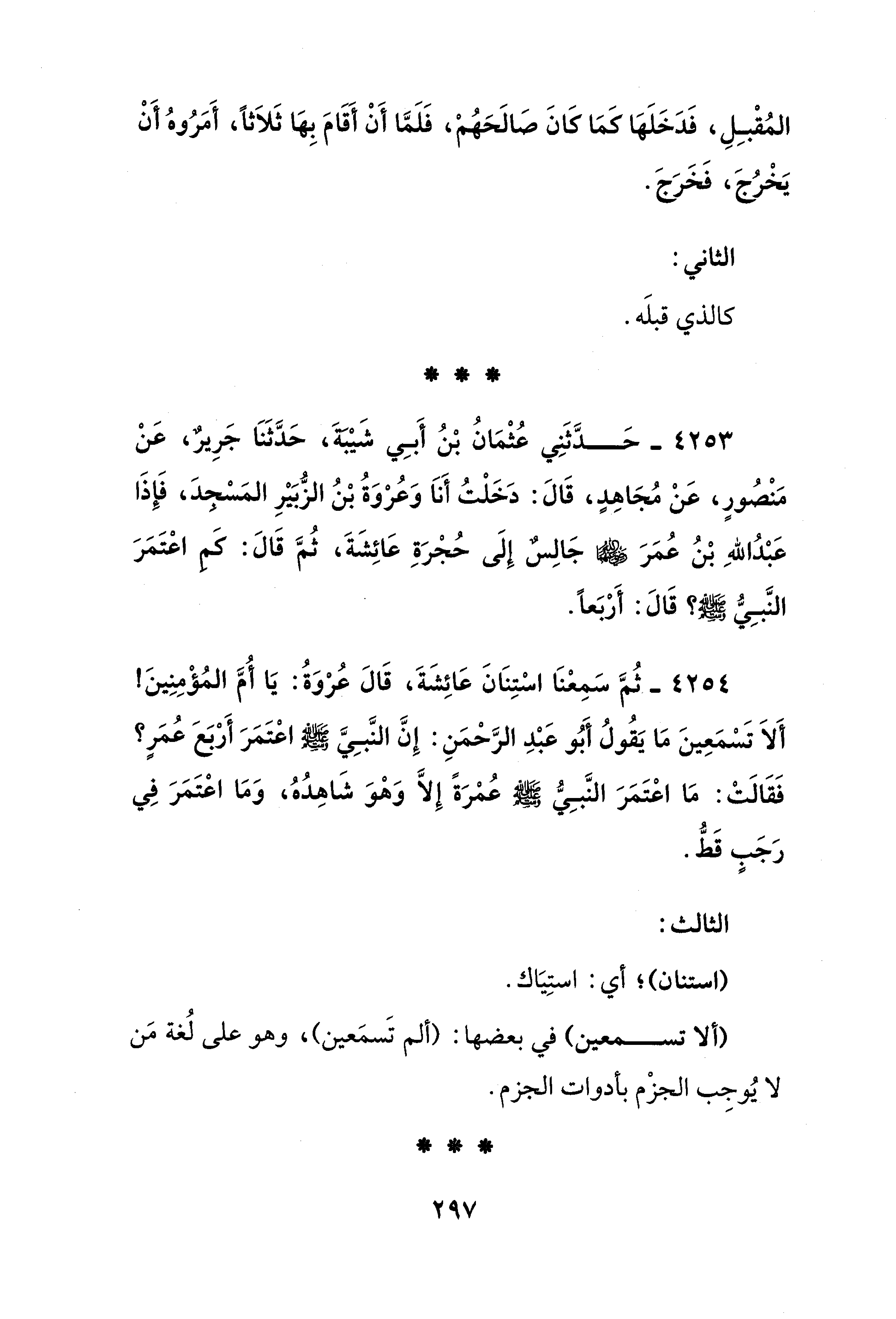 4253 - حَدَّثَنِي عُثْمَانُ بْنُ أَبِي شَيْبَةَ، حَدَّثَنَا جَرِيرٌ، عَنْ مَنْصُورٍ، عَنْ مُجَاهِدٍ، قَالَ: دَخَلْتُ أَنَا وَعُرْوَةُ بْنُ الزُّبَيْرِ المَسْجدَ، فَإِذَا عَبْدُ اللهِ بْنُ عُمَرَ - رضي الله عنهما - جَالِسٌ إِلَى حُجْرَةِ عَائِشَةَ، ثُمَّ قَالَ: كَمِ اعْتَمَرَ النَّبِيُّ - صلى الله عليه وسلم -؟ قَالَ: أَرْبَعًا.
