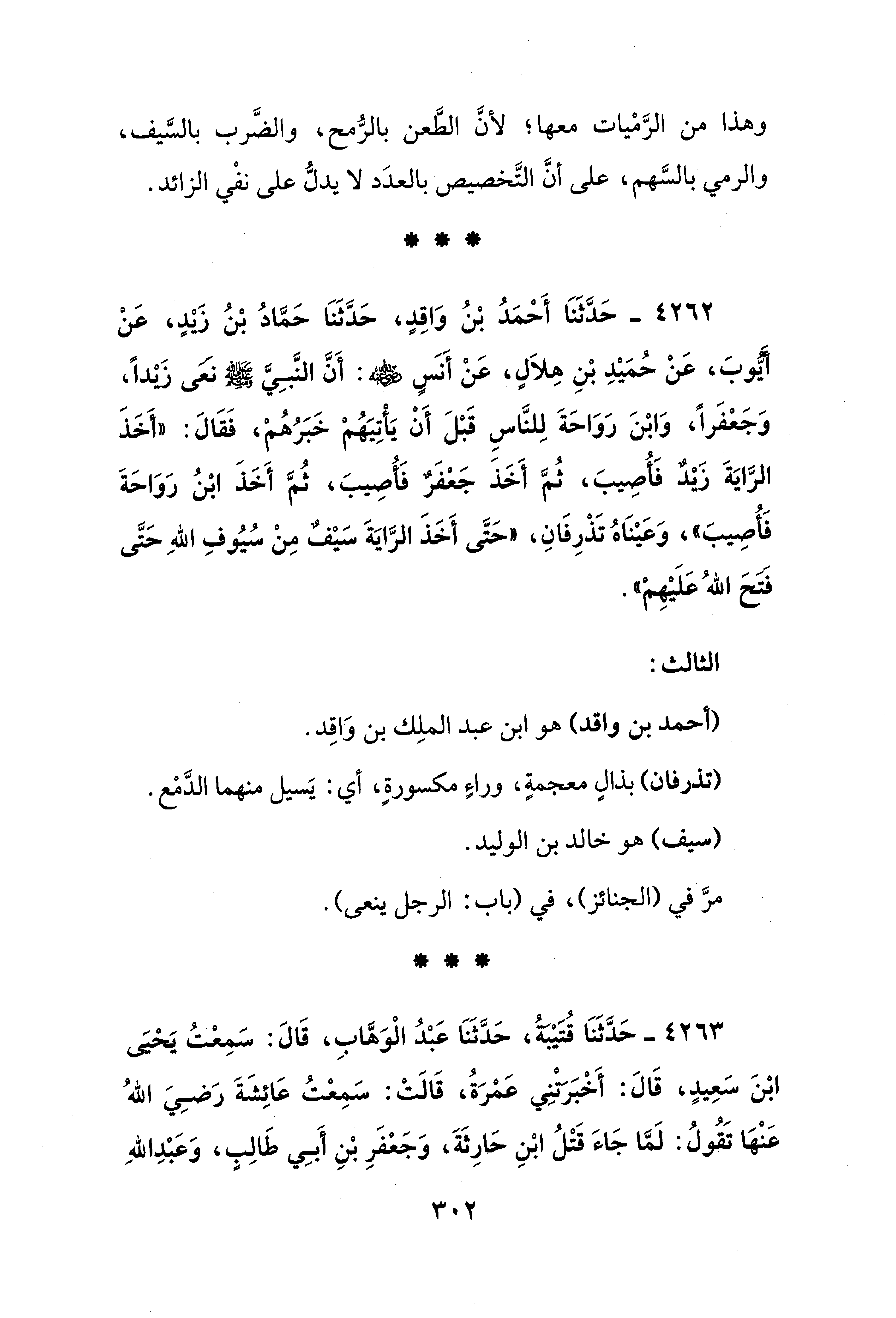 4262 - حَدَّثَنَا أَحْمَدُ بْنُ وَاقِدٍ، حَدَّثَنَا حَمَّادُ بْنُ زَيْدٍ، عَنْ أَيُّوبَ، عَنْ حُمَيْدِ بْنِ هِلاَلٍ، عَنْ أَنس - رضي الله عنه -: أَنَّ النَّبِيَّ - صلى الله عليه وسلم - نَعَى زَيْدًا، وَجَعْفَرًا، وَابْنَ رَوَاحَةَ لِلنَّاسِ قَبْلَ أَنْ يَأْتِيَهُمْ خَبَرُهُمْ، فَقَالَ: "أَخَذَ الرَّايَةَ زَيْدٌ فَأُصِيبَ، ثُمَّ أَخَذَ جَعْفَرٌ فَأُصِيبَ، ثُمَّ أَخَذَ ابْنُ رَوَاحَةَ فَأُصِيبَ"، وَعَيْنَاهُ تَذْرِفَانِ، "حَتَّى أَخَذَ الرَّايَةَ سَيْفٌ مِنْ سُيُوفِ اللهِ حَتَّى فتحَ اللهُ عَلَيْهِمْ".