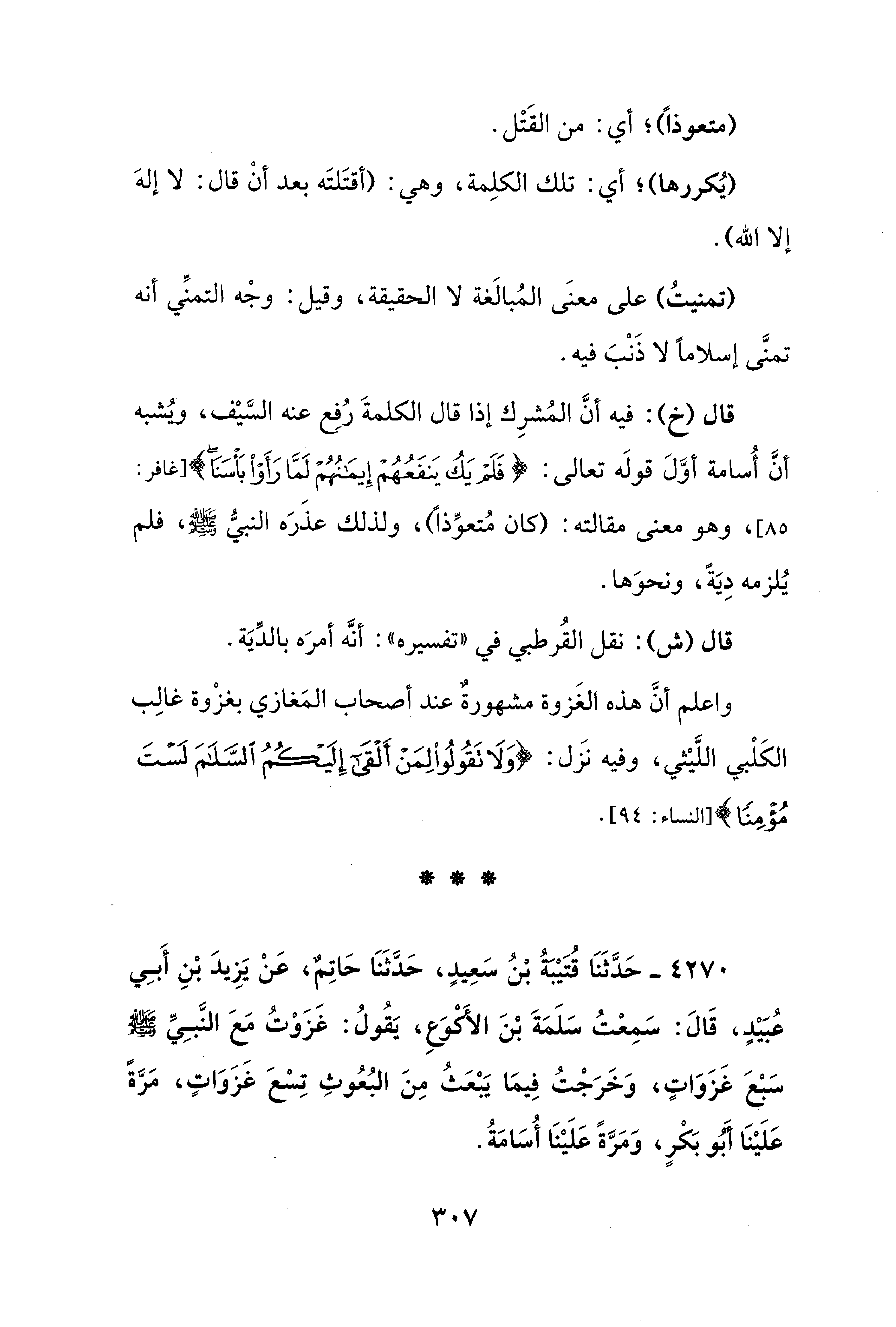 قال (خ): فيه أنَّ المُشرِك إذا قال الكلمةَ رُفِع عنه السَّيْف، ويُشبه أنَّ أُسامة أوَّلَ قولَه تعالى: {فَلَمْ يَكُ يَنْفَعُهُمْ إِيمَانُهُمْ لَمَّا رَأَوْا بَأْسَنَا} [غافر: 85] , وهو معنى مقالته: (كان مُتعوِّذًا)، ولذلك عذَرَه النبيُّ - صلى الله عليه وسلم - , فلم يُلزمه دِيَةً، ونحوَها.
