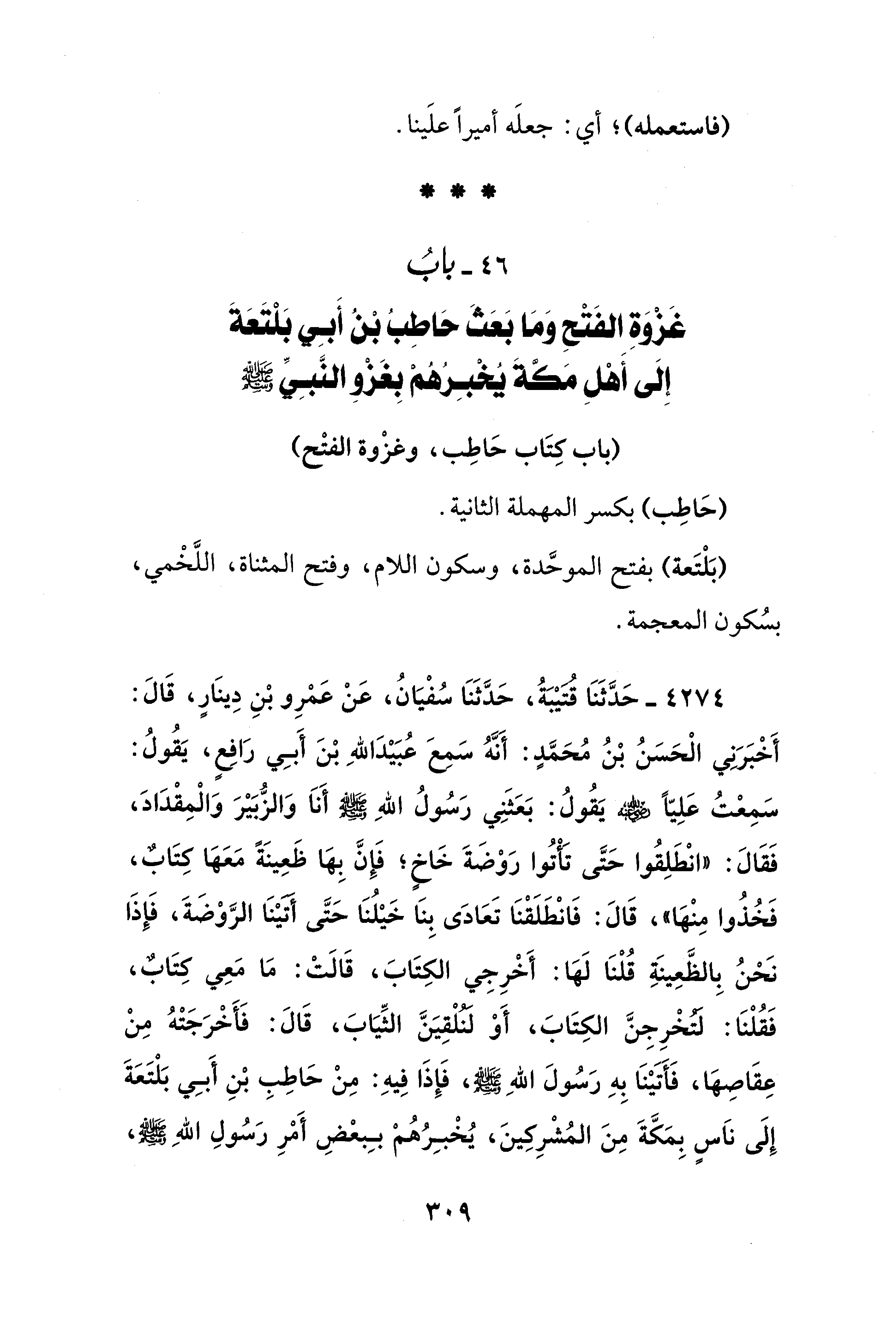 4274 - حَدَّثَنَا قُتَيْبَةُ، حَدَّثَنَا سُفْيَانُ، عَنْ عَمْرِو بْنِ دِينَارٍ، قَالَ: أَخْبَرَنِي الْحَسَنُ بْنُ مُحَمَّدٍ: أَنَّهُ سَمعَ عُبَيْدَ اللهِ بْنَ أَبِي رَافِعٍ، يَقُولُ: سَمِعْتُ عَلِيًّا - رضي الله عنه - يَقُولُ: بَعَثَنِي رَسُولُ اللهِ - صلى الله عليه وسلم - أَنَا وَالزُّبَيْرَ وَالْمِقْدَادَ، فَقَالَ: "انْطَلِقُوا حَتَّى تَأْتُوا رَوْضَةَ خَاخٍ؛ فَإِنَّ بِهَا ظَعِينَةً مَعَهَا كِتَابٌ، فَخُذُوا مِنْهَا"، قَالَ: فَانْطَلَقْنَا تَعَادَى بِنَا خَيْلُنَا حَتَّى أَتَيْنَا الرَّوْضَةَ، فَإِذَا نَحْنُ بِالظَّعِينَةِ قُلْنَا لَهَا: أَخْرِجِي الكِتَابَ، قَالَتْ: مَا مَعِي كِتَابٌ، فَقُلْنَا: لَتُخْرِجِنَّ الكِتَابَ، أَوْ لَنُلْقِيَنَّ الثِّيَابَ، قَالَ: فَأَخْرَجَتْهُ مِنْ عِقَاصِهَا، فَأَتَيْنَا بِهِ رَسُولَ اللهِ - صلى الله عليه وسلم -، فَإِذَا فِيهِ: مِنْ حَاطِبِ بْنِ أَبِي بَلْتَعَةَ إِلَى نَاسٍ بِمَكَّةَ مِنَ المُشْرِكِينَ، يُخْبِرُهُمْ بِبعْض أَمْرِ رَسُولِ اللهِ - صلى الله عليه وسلم -،