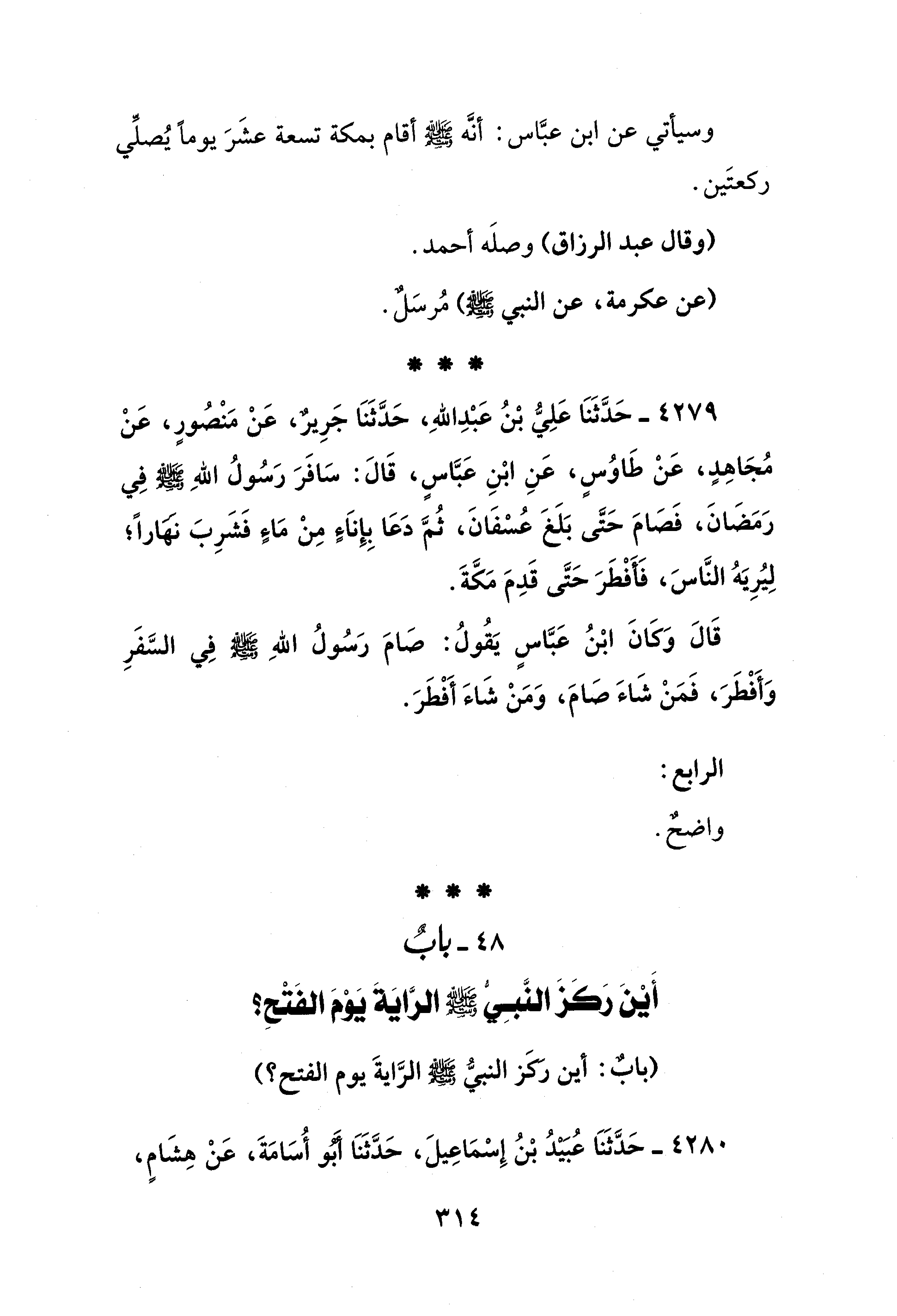 4279 - حَدَّثَنَا عَلِيُّ بْنُ عَبْدِ اللهِ، حَدَّثَنَا جَرِيرٌ، عَنْ مَنْصُورٍ، عَنْ مُجَاهِدٍ، عَنْ طَاوُسٍ، عَنِ ابْنِ عَبَّاسٍ، قَالَ: سَافَرَ رَسُولُ اللهِ - صلى الله عليه وسلم - فِي رَمَضَانَ، فَصَامَ حَتَّى بَلَغَ عُسْفَانَ، ثُمَّ دَعَا بِإِنَاءٍ مِنْ مَاءٍ فَشَرِبَ نَهَارًا؛ لِيُرِيَهُ النَّاسَ، فَأَفْطَرَ حَتَّى قَدِمَ مَكَّةَ.