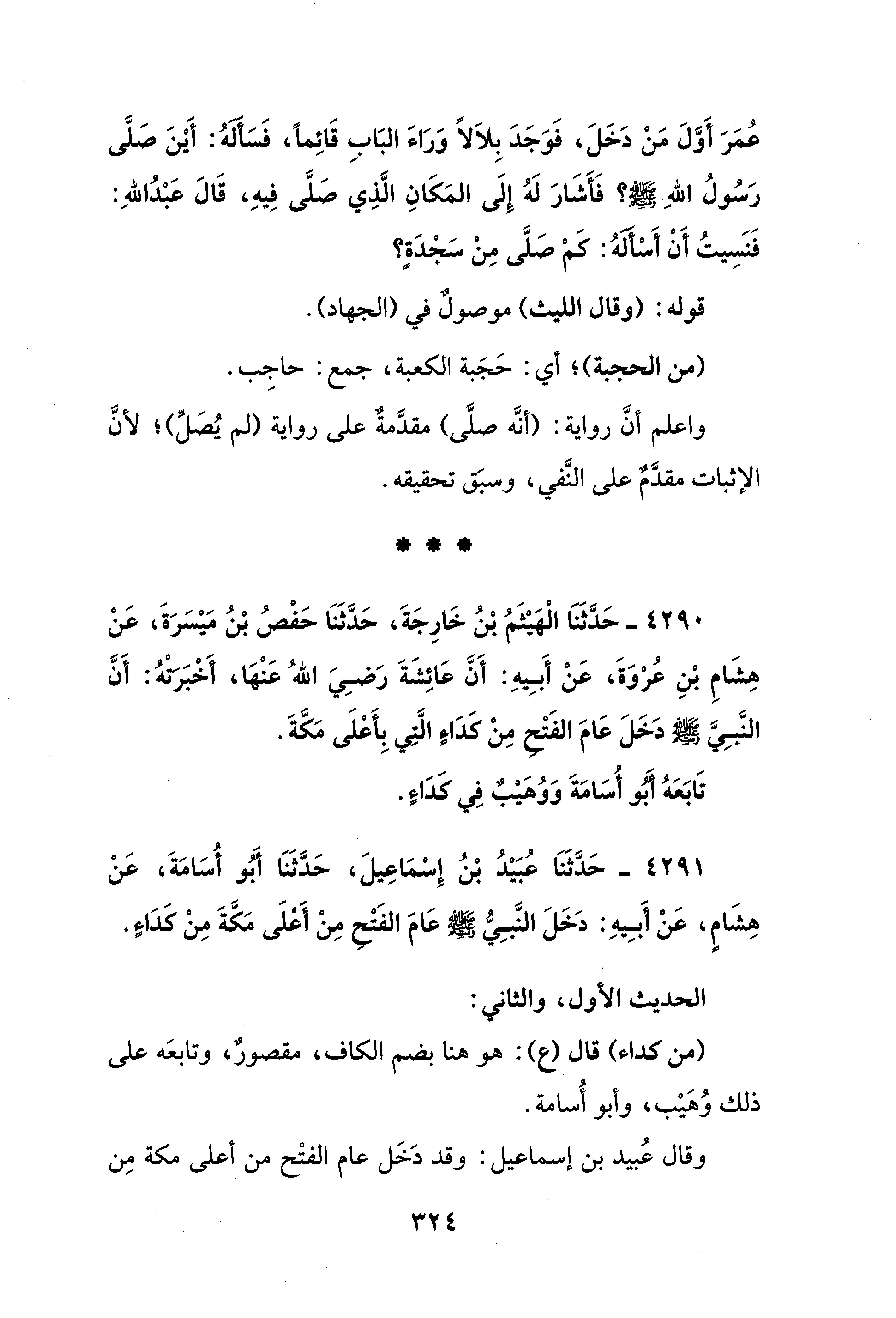 4290 - حَدَّثَنَا الْهَيْثَمُ بْنُ خَارِجَةَ، حَدَّثَنَا حَفْصُ بْنُ مَيْسَرَةَ، عَنْ هِشَامِ بْنِ عُرْوَةَ، عَنْ أَبِيهِ: أَنَّ عَائِشَةَ رَضِيَ اللهُ عَنْهَا، أَخْبَرتهُ: أَنَّ النَّبِيَّ - صلى الله عليه وسلم - دَخَلَ عَامَ الفَتْح مِنْ كَدَاءٍ الَّتِي بِأَعْلَى مَكَّةَ.
