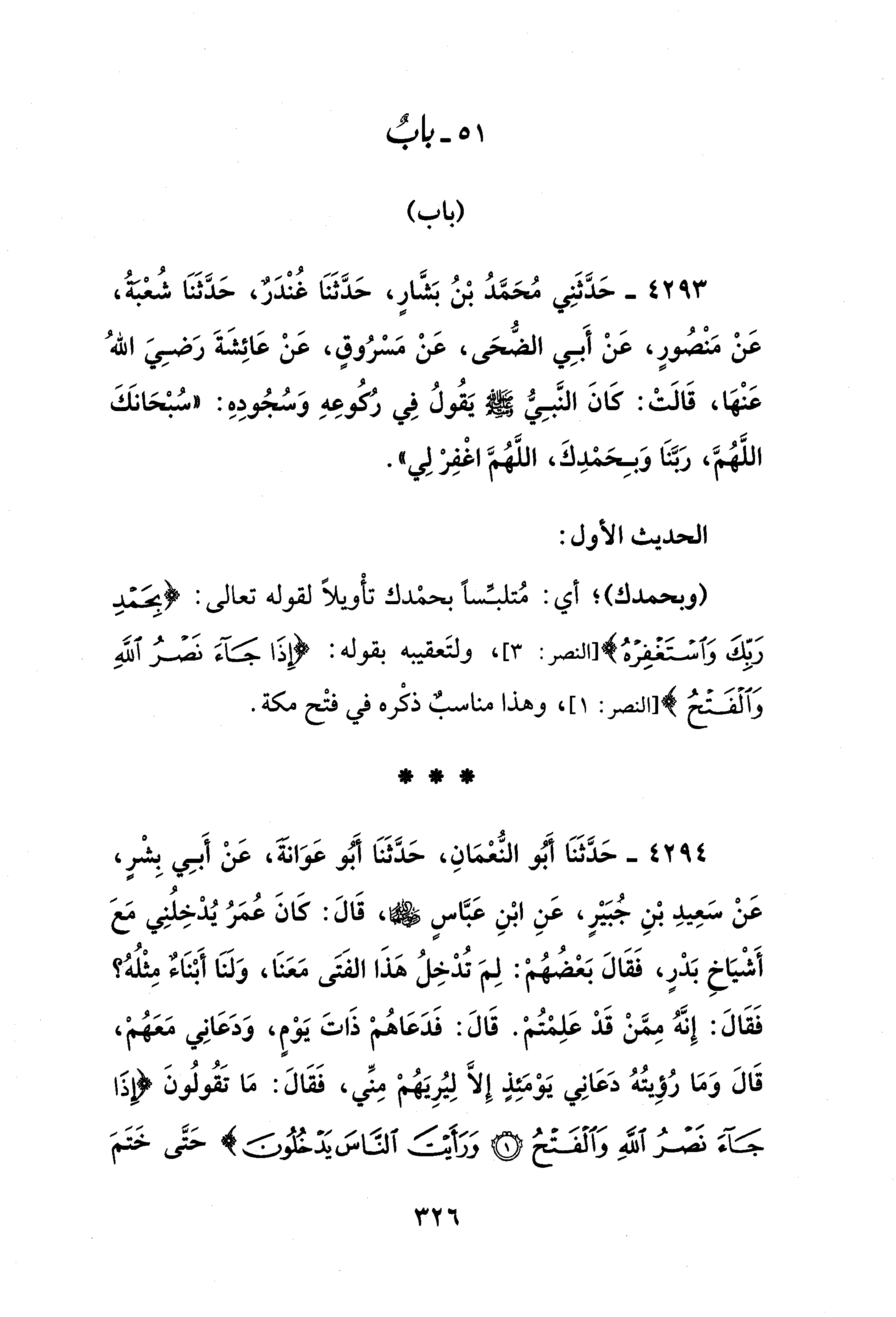 4294 - حَدَّثَنَا أَبُو النُّعْمَانِ، حَدَّثَنَا أَبُو عَوَانَةَ، عَنْ أَبِي بِشْرٍ، عَنْ سَعِيدِ بْنِ جُبَيْرٍ، عَنِ ابْنِ عَبَّاسٍ - رضي الله عنهما -، قَالَ: كانَ عُمَرُ يُدْخِلُنِي مَعَ أَشْيَاخِ بَدْرٍ، فَقَالَ بَعْضُهُمْ: لِمَ تُدْخِلُ هَذَا الفَتَى مَعَنَا، وَلَنَا أَبْنَاءٌ مِثْلُهُ؟ فَقَالَ: إِنَّهُ مِمَّنْ قَدْ عَلِمْتُمْ. قَالَ: فَدَعَاهُمْ ذَاتَ يَوْمٍ، وَدَعَانِي مَعَهُمْ، قَالَ وَمَا رُؤِيتُهُ دَعَانِي يَوْمَئِذٍ إلا لِيُرِيَهُمْ مِنِّي، فَقَالَ: مَا تَقُولُونَ {إِذَا جَاءَ نَصْرُ اللَّهِ وَالْفَتْحُ (1) وَرَأَيْتَ النَّاسَ يَدْخُلُونَ فِي دِينِ اللَّهِ أَفْوَاجًا} حَتَّى خَتَمَ
