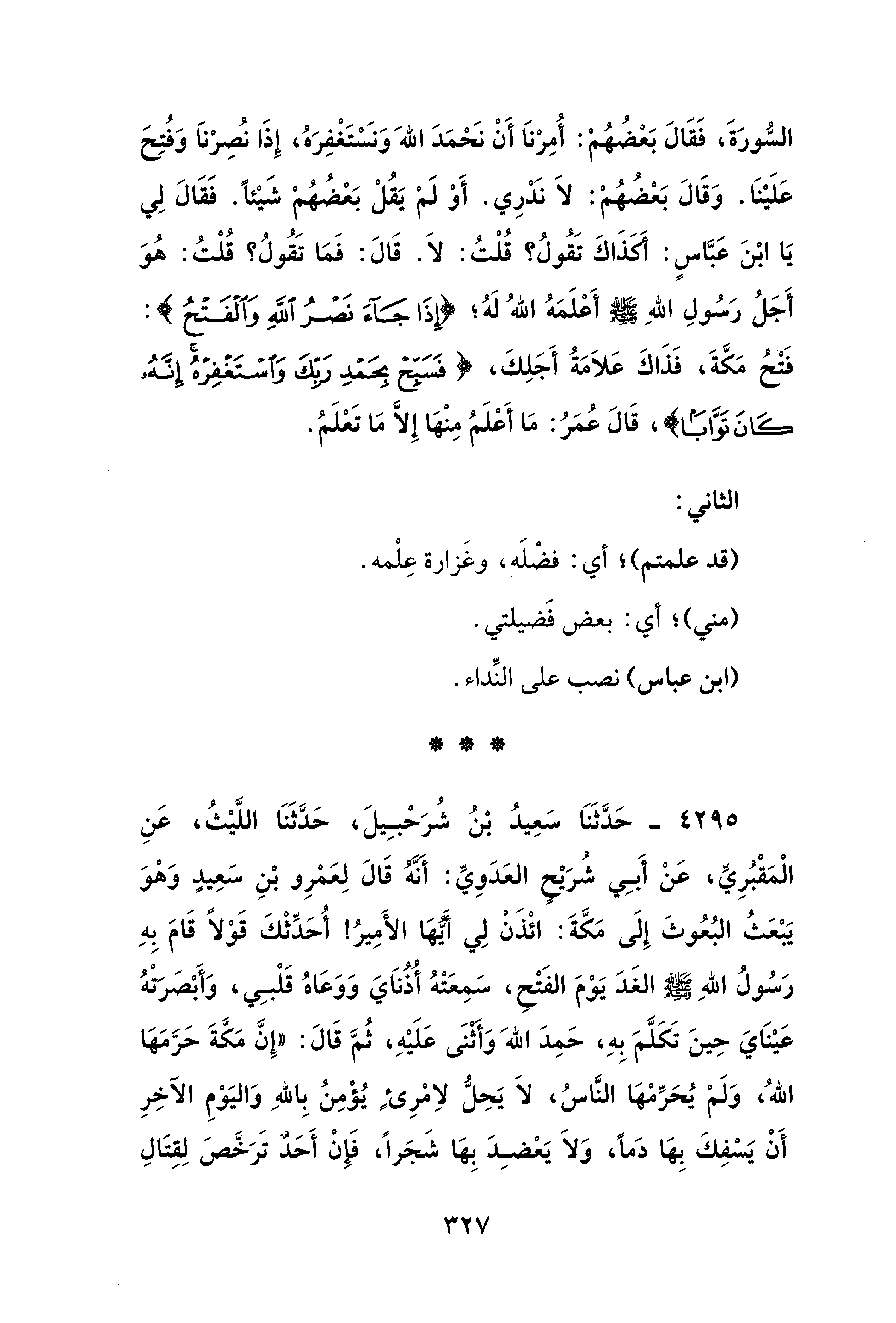 4295 - حَدَّثَنَا سَعِيدُ بْنُ شُرَحْبِيلَ، حَدَّثَنَا اللَّيْثُ، عَنِ الْمَقْبُرِيِّ، عَنْ أَبِي شُرَيْحٍ العَدَوِيِّ: أَنَّهُ قَالَ لِعَمْرِو بْنِ سَعِيدٍ وَهْوَ يَبْعَثُ البُعُوثَ إِلَى مَكَّةَ: ائْذَنْ لِي أَيُّهَا الأَمِيرُ! أُحَدِّثْكَ قَوْلًا قَامَ بِهِ رَسُولُ اللهِ - صلى الله عليه وسلم - الغَدَ يَوْمَ الفَتْح، سَمِعَتْهُ أُذُنَايَ وَوَعَاهُ قَلْبِي، وَأَبْصَرَتْهُ عَيْنَايَ حِينَ تَكَلَّمَ بِهِ، حَمِدَ الله وَأثنَى عَلَيْهِ، ثُمَّ قَالَ: "إِنَّ مَكَّةَ حَرَّمَهَا اللهُ، وَلَمْ يُحَرِّمْهَا النَّاسُ، لَا يَحِلُّ لاِمْرِيءٍ يُؤْمِنُ بِاللهِ وَاليَوْمِ الآخِرِ أَنْ يَسْفِكَ بِهَا دَمًا، وَلَا يَعْضِدَ بِهَا شَجَرًا، فَإِنْ أَحَدٌ تَرَخَّصَ لِقِتَالِ