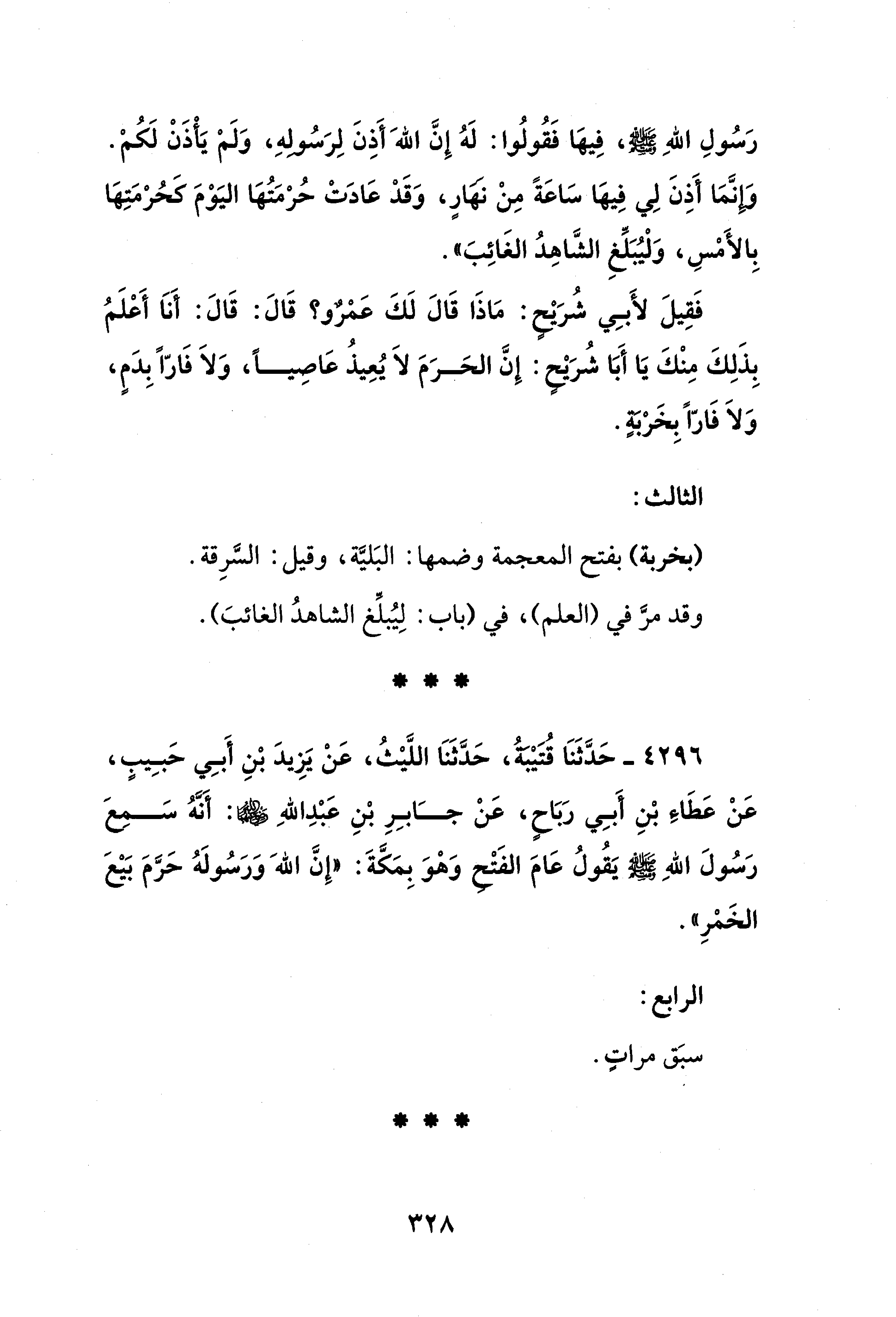 رَسُولِ اللهِ - صلى الله عليه وسلم -، فِيهَا فَقُولُوا: لَهُ إِنَّ الله أَذِنَ لِرَسُولِهِ، وَلَمْ يَأْذَنْ لَكُمْ. وَإِنَّمَا أَذِنَ لِي فِيهَا سَاعَةً مِنْ نَهَارٍ، وَقَدْ عَادَتْ حُرْمَتُهَا اليَوْمَ كَحُرْمَتِهَا بِالأَمْسِ، وَلْيُبَلِّغِ الشَّاهِدُ الغَائِبَ".