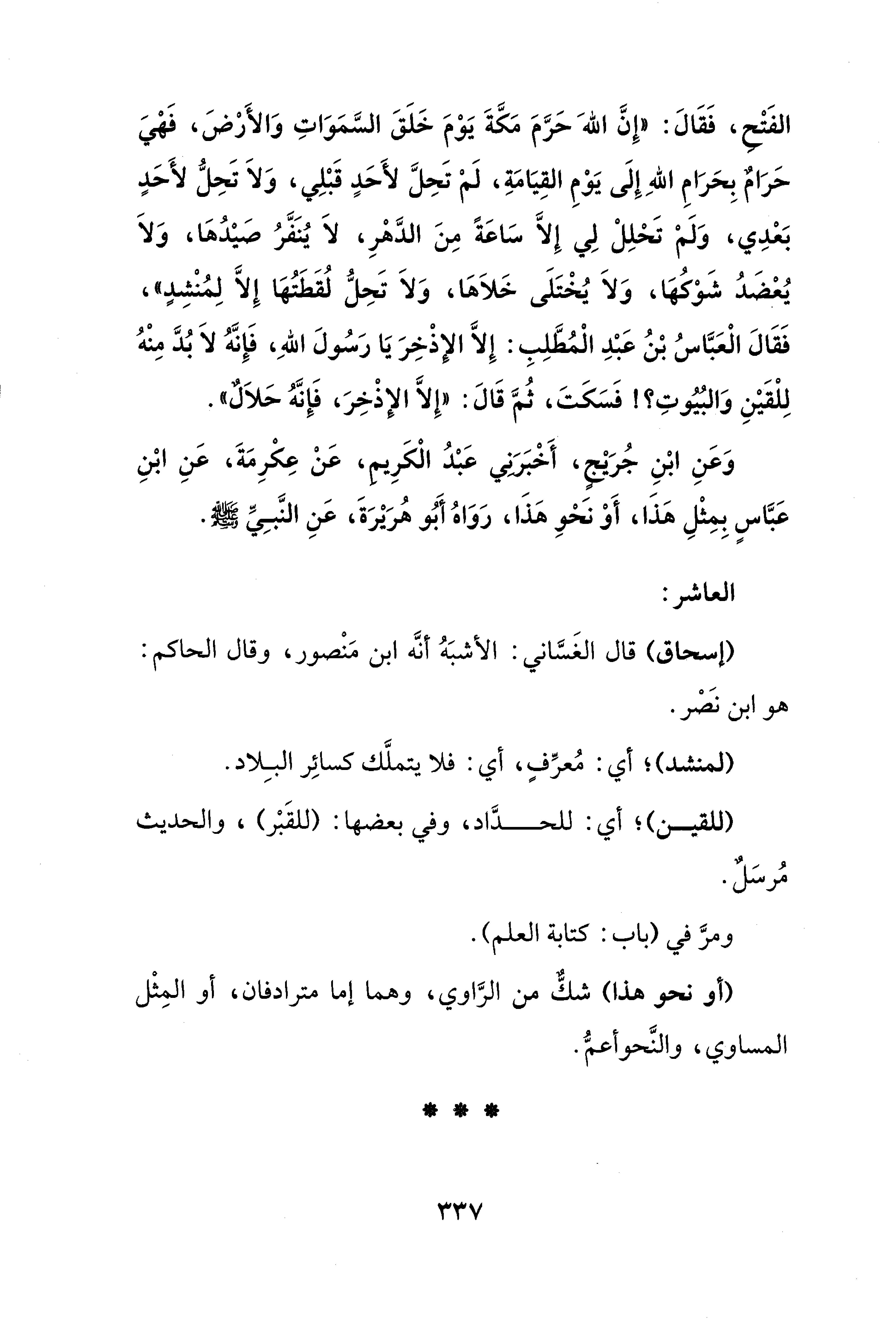 الفَتْح، فَقَالَ: "إِنَّ الله حَرَّمَ مَكَّةَ يَوْمَ خَلَقَ السَّمَوَاتِ وَالأَرْضَ، فَهْيَ حَرَامٌ بِحَرَامِ اللهِ إِلَى يَوْمِ القِيَامَةِ، لَمْ تَحِلَّ لأَحَدٍ قَبْلِي، وَلَا تَحِلُّ لأَحَدٍ بَعْدِي، وَلَمْ تَحْلِلْ لِي إلا سَاعَةً مِنَ الدَّهْرِ، لَا يُنَفَّرُ صَيْدُهَا، وَلَا يُعْضَدُ شَوْكُهَا، وَلَا يُخْتَلَى خَلَاهَا، وَلَا تَحِلُّ لُقَطَتُهَا إلا لِمُنْشِدٍ"، فَقَالَ الْعَبَّاسُ بْنُ عَبْدِ الْمُطَّلِبِ: إلا الإذْخِرَ يَا رَسُولَ اللهِ، فَإِنَّهُ لَا بُدَّ مِنْهُ لِلْقَيْنِ وَالبُيُوتِ؟! فَسَكَتَ، ثُمَّ قَالَ: "إلا الإِذْخِرَ، فَإِنَّهُ حَلَالٌ".