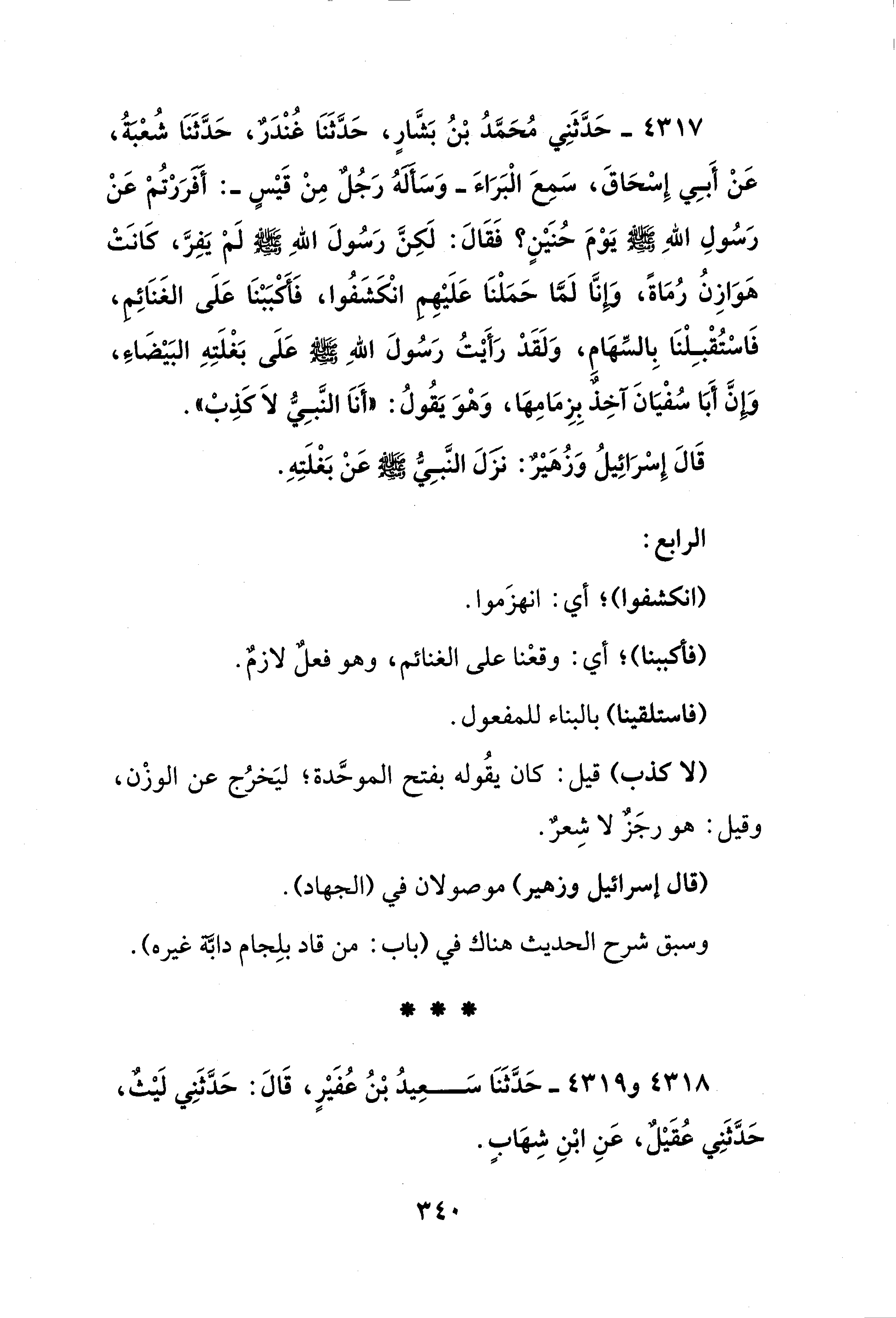 4317 - حَدَّثَنِي مُحَمَّدُ بْنُ بَشَّارٍ، حَدَّثَنَا غُنْدَرٌ، حَدَّثَنَا شُعْبَةُ، عَنْ أَبِي إِسْحَاقَ، سَمِعَ الْبَرَاءَ -وَسَألهُ رَجُلٌ مِنْ قَيْسٍ-: أفرَرْتُمْ عَنْ رَسُولِ اللهِ - صلى الله عليه وسلم - يَوْمَ حُنَيْنٍ؟ فَقَالَ: لَكِنَّ رَسُولَ اللهِ - صلى الله عليه وسلم - لَمْ يَفِرَّ، كَانَتْ هَوَازِنُ رُمَاةً، وَإنَّا لَمَّا حَمَلْنَا عَلَيْهِم انْكَشَفُوا، فَأَكْبَبْنَا عَلَى الغَنَائِمِ، فَاسْتُقْبِلْنَا بِالسِّهَامِ، وَلَقَدْ رَأَيْتُ رَسُولَ اللهِ - صلى الله عليه وسلم - عَلَى بَغْلَتِهِ البَيْضَاءِ، وَإنَّ أَبَا سُفْيَانَ آخِذٌ بِزِمَامِهَا، وَهْوَ يَقُولُ: "أَنَا النَّبِيُّ لَا كَذِبْ".
