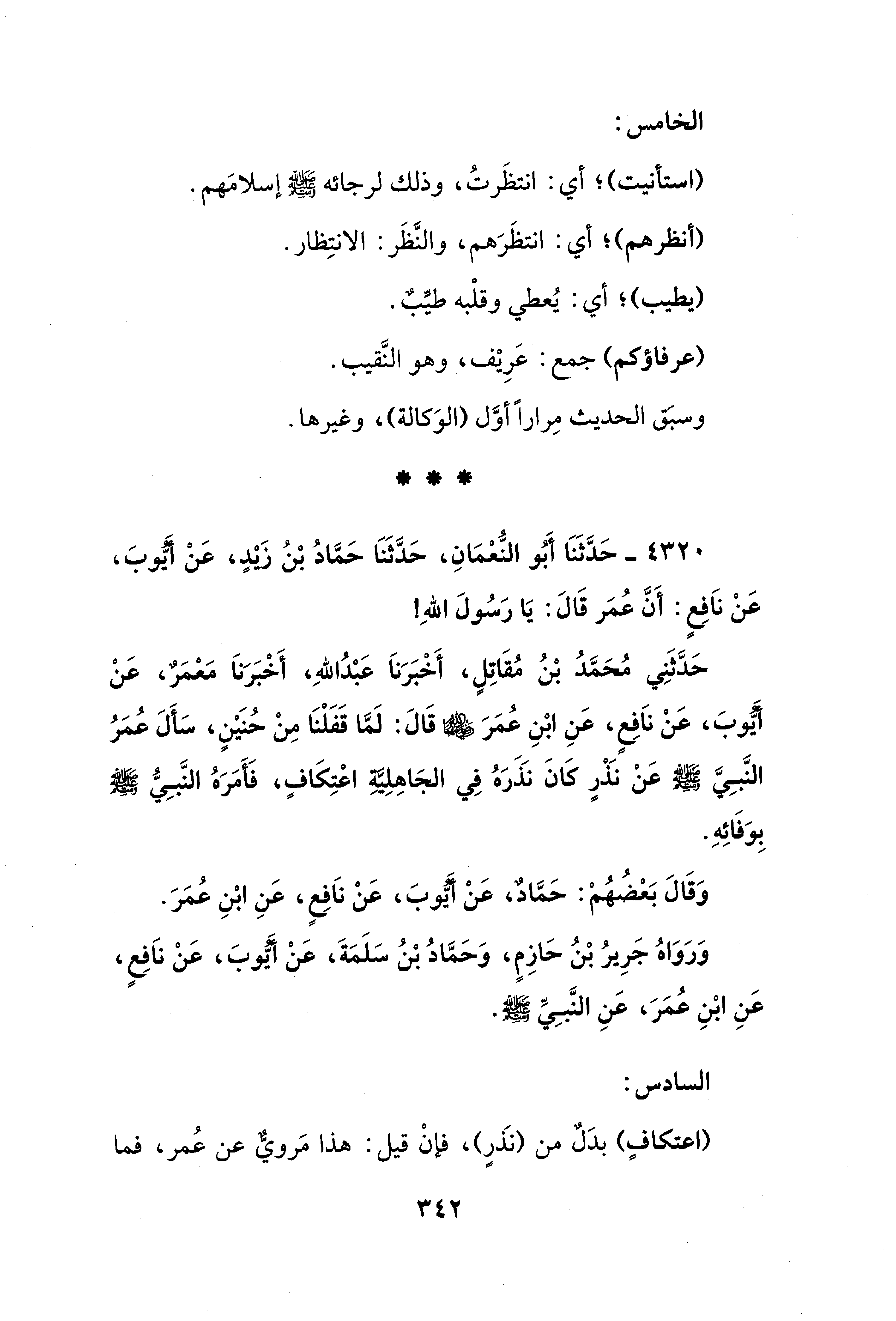 4320 - حَدَّثَنَا أَبُو النُّعْمَانِ، حَدَّثَنَا حَمَّادُ بْنُ زَيْدٍ، عَنْ أَيُّوبَ، عَنْ نَافِعٍ: أَنَّ عُمَر قَالَ: يَا رَسُولَ اللهِ! حَدَّثَنِي مُحَمَّدُ بْنُ مُقَاتِلٍ، أَخْبَرَنَا عَبْدُ اللهِ، أَخْبَرَنَا مَعْمَرٌ، عَنْ أَيُّوبَ، عَنْ نَافِعٍ، عَنِ ابْنِ عُمَرَ - رضي الله عنهما - قَالَ: لَمَّا قَفَلْنَا مِنْ حُنَيْنٍ، سَأَلَ عُمَرُ النَّبِيَّ - صلى الله عليه وسلم - عَنْ نَذْرٍ كانَ نَذَرَهُ في الجَاهِلِيَّةِ اعْتِكَافٍ، فَأَمَرَهُ النَّبِيُّ - صلى الله عليه وسلم - بِوَفَائِهِ.
