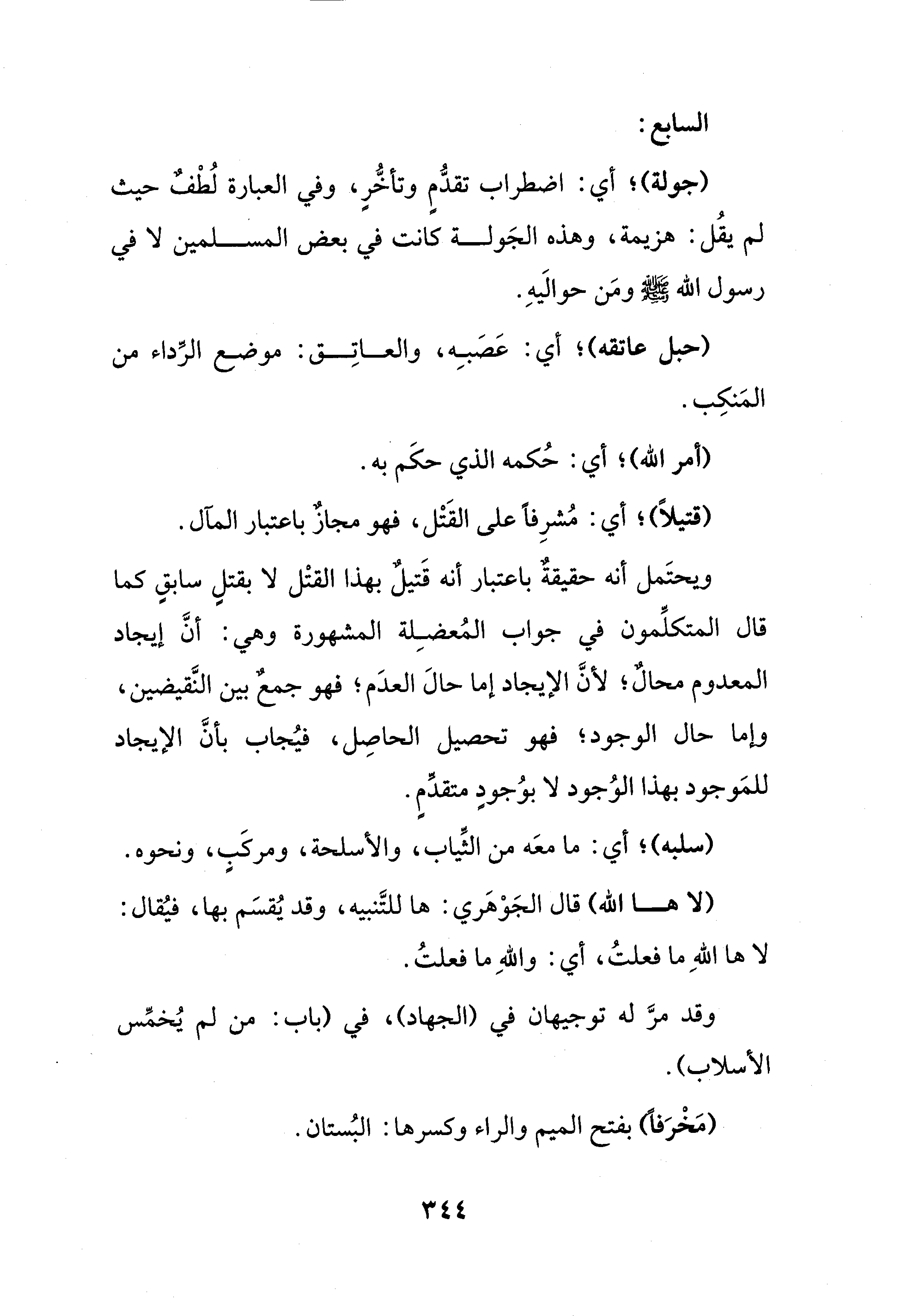 ويحتَمل أنَّه حقيقةٌ باعتبار أنَّه قَتيلٌ بهذا القتْل لا بقتلٍ سابقٍ كما قال المتكلِّمون في جواب المُعضِلة المشهورة وهي: أنَّ إيجاد المعدوم محالٌ؛ لأنَّ الإيجاد إما حالَ العدَم؛ فهو جمعٌ بين النَّقيضين، وإما حال الوجود؛ فهو تحصيل الحاصِل، فيُجاب بأنَّ الإيجاد للمَوجود بهذا الوُجود لا بوُجودٍ متقدِّمٍ.