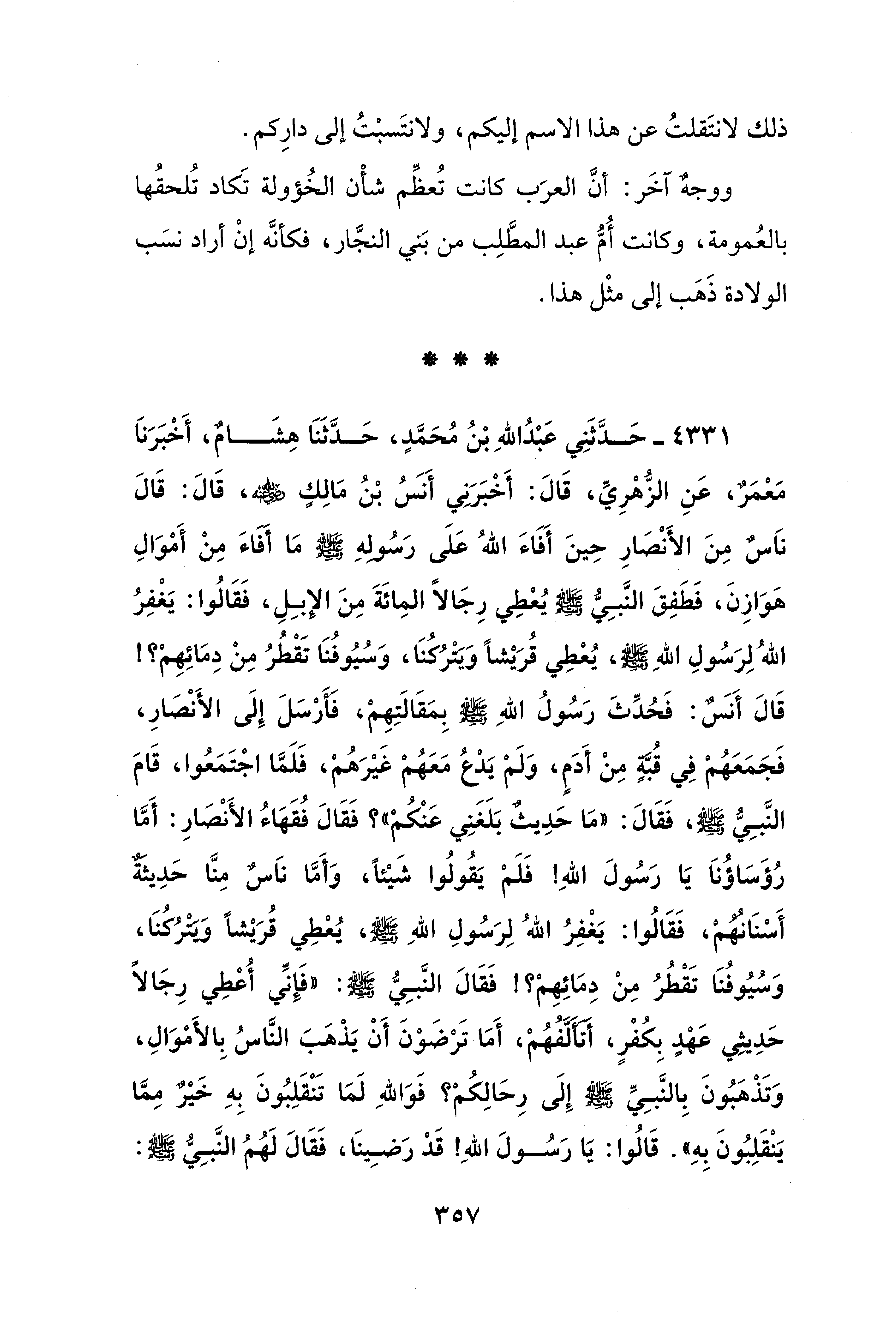 4331 - حَدَّثَنِي عَبْدُ اللهِ بْنُ مُحَمَّدٍ، حَدَّثَنَا هِشَامٌ، أَخْبَرَنَا مَعْمَرٌ، عَنِ الزُّهْرِيِّ، قَالَ: أَخْبَرَني أَنسُ بْنُ مَالِكٍ - رضي الله عنه -، قَالَ: قَالَ نَاسٌ مِنَ الأَنْصَارِ حِينَ أَفَاءَ اللهُ عَلَى رَسُولِهِ - صلى الله عليه وسلم - مَا أَفَاءَ مِنْ أَمْوَالِ هَوَازِنَ، فَطَفِقَ النَّبِيُّ - صلى الله عليه وسلم - يُعْطِي رِجَالًا المِائَةَ مِنَ الإبِلِ، فَقَالُوا: يَغْفِرُ اللهُ لِرَسُولِ اللهِ - صلى الله عليه وسلم -، يُعْطِي قُرَيْشًا وَيَتْرُكُنَا، وَسُيُوفُنَا تَقْطُرُ مِنْ دِمَائِهِمْ؟! قَالَ أَنسٌ: فَحُدِّثَ رَسُولُ اللهِ - صلى الله عليه وسلم - بِمَقَالَتِهِمْ، فَأَرْسَلَ إِلَى الأَنْصَارِ، فَجَمَعَهُمْ في قُبَّةٍ مِنْ أَدَمٍ، وَلَمْ يَدْعُ مَعَهُمْ غَيْرَهُمْ، فَلَمَّا اجْتَمَعُوا، قَامَ النَّبِيُّ - صلى الله عليه وسلم -، فَقَالَ: "مَا حَدِيثٌ بَلَغَنِي عَنْكُمْ"؟؛ فَقَالَ فُقَهَاءُ الأَنْصَارِ: أَمَّا رُؤَسَاؤُنَا يَا رَسُولَ اللهِ! فَلَمْ يَقُولُوا شَيْئًا، وَأَمَّا نَاسٌ مِنَّا حَدِيثَةٌ أَسْنَانُهُمْ، فَقَالُوا: يَغْفِرُ اللهُ لِرَسُولِ اللهِ - صلى الله عليه وسلم -، يُعْطِي قُرَيْشًا وَيَتْرُكُنَا، وَسُيُوفُنَا تَقْطُرُ مِنْ دِمَائِهِمْ؟! فَقَالَ النَّبِيُّ - صلى الله عليه وسلم -: "فَإِنِّي أُعْطِي رِجَالًا حَدِيثِي عَهْدٍ بِكُفْرٍ، أَتَأَلَّفُهُمْ، أَمَا تَرْضَوْنَ أَنْ يَذْهَبَ النَّاسُ بِالأَمْوَالِ، وَتَذْهَبُونَ بِالنَّبِيِّ - صلى الله عليه وسلم - إِلَى رِحَالِكُمْ؟ فَوَاللهِ لَمَا تَنْقَلِبُونَ بِهِ خيرٌ مِمَّا يَنْقَلِبُونَ بِهِ". قَالُوا: يَا رَسُولَ اللهِ! قَدْ رَضِينَا، فَقَالَ لَهُمُ النَّبِيُّ - صلى الله عليه وسلم -: