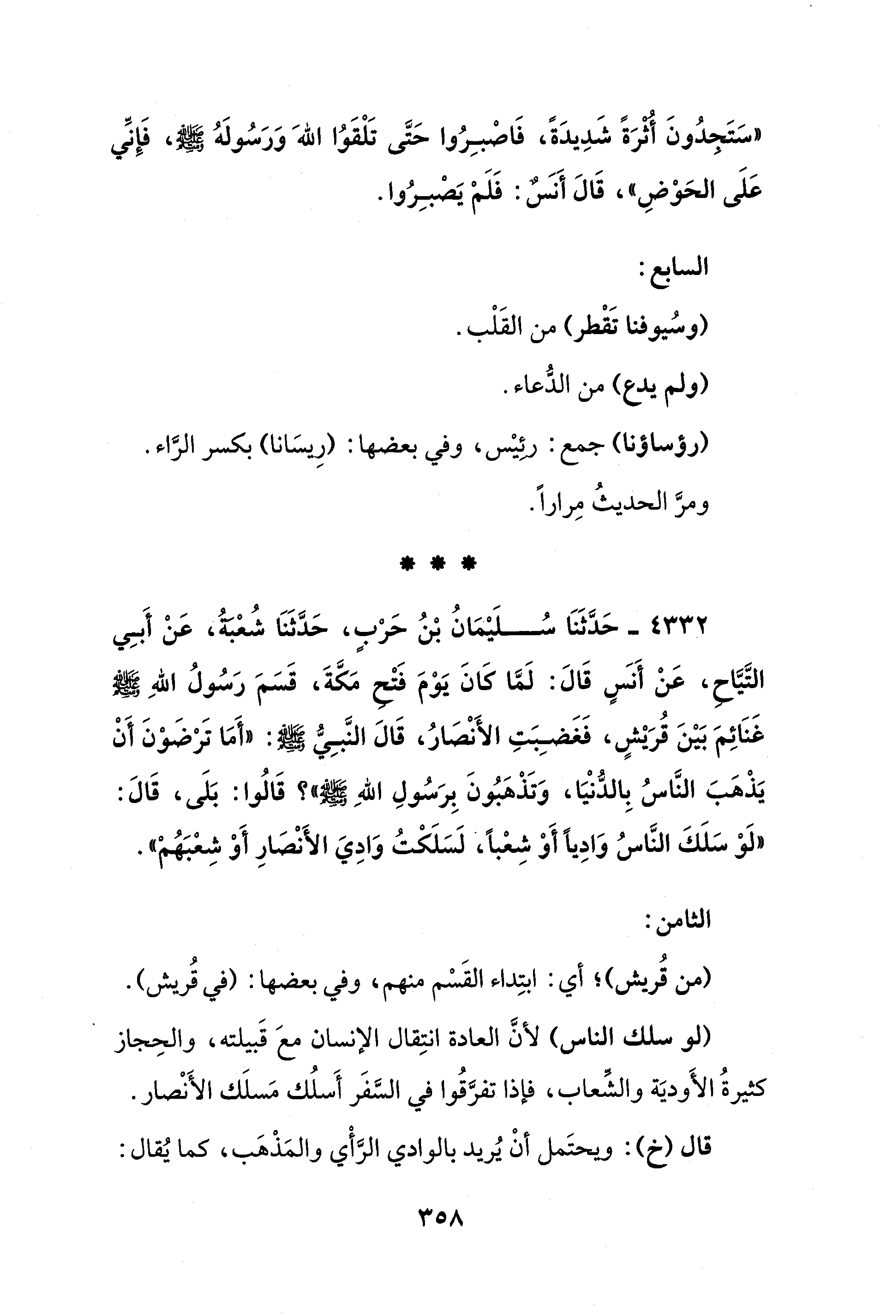 4332 - حَدَّثَنَا سُلَيْمَانُ بْنُ حَرْبٍ، حَدَّثَنَا شُعْبَة، عَنْ أَبِي التَّيَّاحِ، عَنْ أَنسٍ قَالَ: لَمَّا كَانَ يَوْمَ فَتْح مَكَّةَ، قَسَمَ رَسُولُ اللهِ - صلى الله عليه وسلم - غَنَائِمَ بَيْنَ قُرَيْشٍ، فَغَضِبَتِ الأَنْصَارُ، قَالَ النَّبِيُّ - صلى الله عليه وسلم -: "أَمَا تَرْضَوْنَ أَنْ يَذْهَبَ النَّاسُ بِالدُّنْيَا، وَتَذْهَبُونَ بِرَسُولِ اللهِ - صلى الله عليه وسلم -"؟ قَالُوا: بَلَى، قَالَ: "لَوْ سَلَكَ النَّاسُ وَادِيًا أَوْ شِعْبًا، لَسَلَكْتُ وَادِيَ الأَنْصَارِ أَوْ شِعْبَهُمْ".