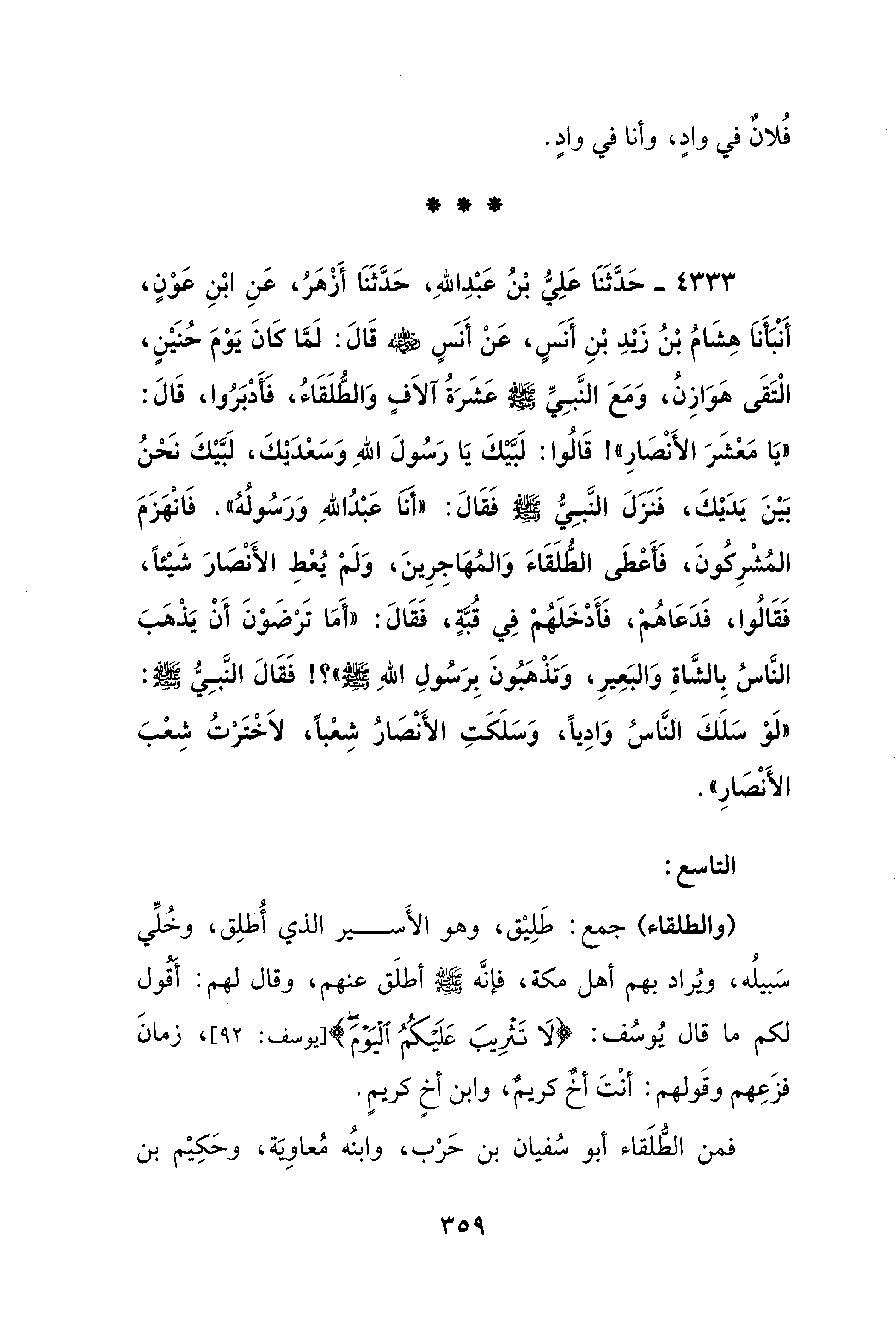 4333 - حَدَّثَنَا عَلِيُّ بْنُ عَبْدِ اللهِ، حَدَّثَنَا أَزْهَرُ، عَنِ ابْنِ عَوْنٍ، أَنْبَأَنَا هِشَامُ بْنُ زيدِ بْنِ أَنسٍ، عَنْ أَنسٍ - رضي الله عنه - قَالَ: لَمَّا كَانَ يَوْمَ حُنَيْنٍ، الْتَقَى هَوَازِنُ، وَمَعَ النَّبِيِّ - صلى الله عليه وسلم - عَشَرَةُ آلَافٍ وَالطُّلَقَاءُ، فَأَدْبَرُوا، قَالَ: "يَا مَعْشَرَ الأَنْصَارِ" قَالُوا: لَبَّيْكَ يَا رَسُولَ اللهِ وَسَعْدَيْكَ، لَبَّيْكَ نَحْنُ بَيْنَ يَدَيْكَ، فَنَزَلَ النَّبِيُّ - صلى الله عليه وسلم - فَقَالَ: "أَنَا عَبْدُ اللهِ وَرَسُولُهُ". فَانْهَزَمَ المُشْرِكُونَ، فَأَعْطَى الطُّلَقَاءَ وَالمُهَاجِرِينَ، وَلَمْ يُعْطِ الأَنْصَارَ شَيْئًا، فَقَالُوا، فَدَعَاهُمْ، فَأَدْخَلَهُمْ في قُبَّةٍ، فَقَالَ: "أَمَا تَرْضَوْنَ أَنْ يَذْهَبَ النَّاسُ بِالشَّاةِ وَالبَعِيرِ، وَتَذْهَبُونَ بِرَسُولِ اللهِ - صلى الله عليه وسلم -؟! فَقَالَ النَّبِيُّ - صلى الله عليه وسلم -: "لَوْ سَلَكَ النَّاسُ وَادِيًا، وَسَلَكَتِ الأَنْصَارُ شِعْبًا، لَاخْتَرْتُ شِعْبَ الأَنْصَارِ".