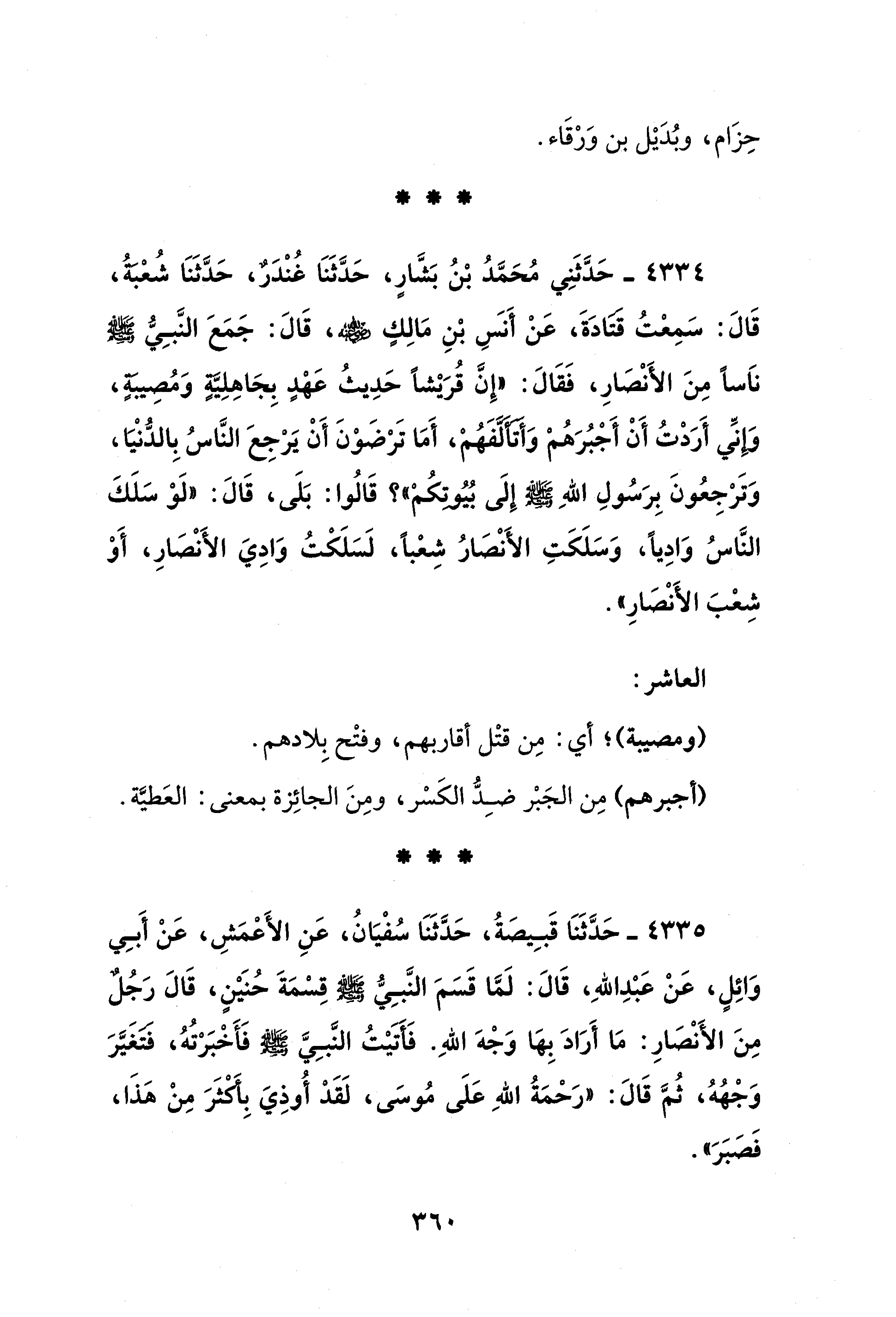 4334 - حَدَّثَنِي مُحَمَّدُ بْنُ بَشَّارٍ، حَدَّثَنَا غُنْدَرٌ، حَدَّثَنَا شُعْبَة، قَالَ: سَمِعْتُ قتادَةَ، عَنْ أَنس بْنِ مَالِكٍ - رضي الله عنه -، قَالَ: جَمَعَ النَّبِي - صلى الله عليه وسلم - نَاسًا مِنَ الأَنْصَارِ، فَقَالَ: "إِنَّ قُرَيْشًا حَدِيثُ عَهْدٍ بِجَاهِلِيَّةٍ وَمُصِيبةٍ، وَإِنِّي أَرَدْتُ أَنْ أَجْبُرَهُمْ وَأَتَأَلَّفَهُمْ، أَمَا تَرْضَوْنَ أَنْ يَرْجِعَ النَّاسُ بِالدُّنْيَا، وَتَرْجِعُونَ بِرَسُولِ اللهِ - صلى الله عليه وسلم - إِلَى بُيُوتكُمْ"؟ قَالُوا: بَلَى، قَالَ: "لَوْ سَلَك النَّاسُ وَادِيًا، وَسَلَكَتِ الأَنْصَارُ شِعْبًا، لَسَلَكْتُ وَادِيَ الأَنْصَارِ، أَوْ شِعْبَ الأَنْصَارِ".