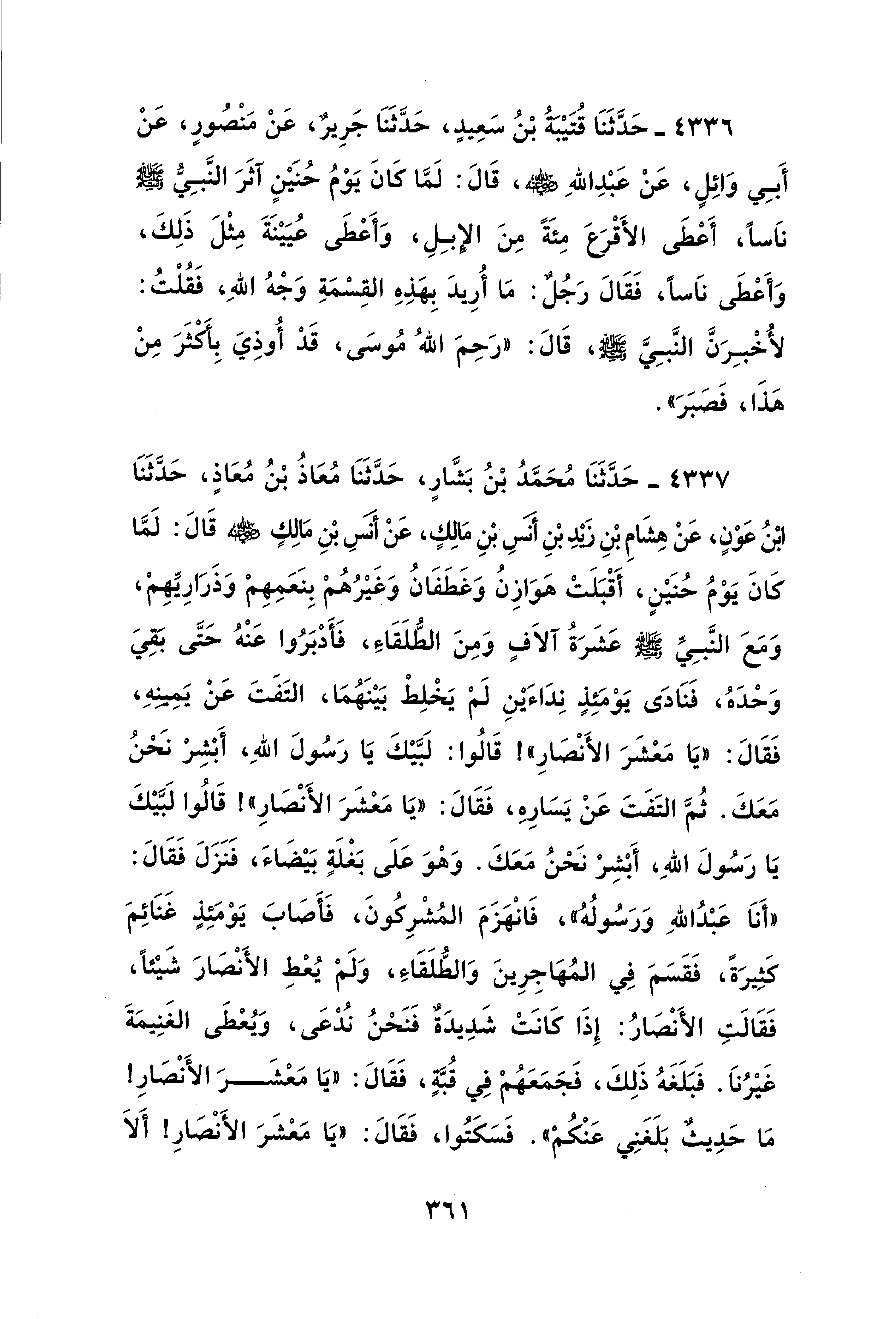 4336 - حَدَّثَنَا قُتَيْبَةُ بْنُ سَعِيدٍ، حَدَّثَنَا جَرِيرٌ، عَنْ مَنْصُورٍ، عَنْ أَبِي وَائِلٍ، عَنْ عَبْدِ اللهِ - رضي الله عنه -، قَالَ: لَمَّا كَانَ يَوْمُ حُنَيْنٍ آثَرَ النَّبِيُّ - صلى الله عليه وسلم - نَاسًا، أَعْطَى الأَقْرَعَ مِئَةً مِنَ الإبِلِ، وَأَعْطَى عُيَيْنَةَ مِثْلَ ذَلِكَ، وَأَعْطَى نَاسًا، فَقَالَ رَجُلٌ: مَا أُرِيدَ بِهَذِهِ القِسْمَةِ وَجْهُ اللهِ، فَقُلْتُ: لأُخْبِرَنَّ النَّبِيَّ - صلى الله عليه وسلم -، قَالَ: "رَحِمَ اللهُ مُوسَى، قَدْ أُوذِيَ بِأكْثَرَ مِنْ هَذَا، فَصَبَرَ". 4337 - حَدَّثَنَا مُحَمَّدُ بْنُ بَشَّارٍ، حَدَّثَنَا مُعَاذُ بْنُ مُعَاذٍ، حَدَّثَنَا ابْنُ عَوْنٍ، عَنْ هِشَامِ بْنِ زيدِ بْنِ أنَس بْنِ مَالِكٍ، عَنْ أنس بْنِ مَالِكٍ - رضي الله عنه - قَالَ: لَمَّا كَانَ يَوْمُ حُنَيْنٍ، أَقْبَلَتْ هَوَازِنُ وَغَطَفَانُ وَغَيْرُهُمْ بِنَعَمِهِمْ وَذَرَارِيِّهِمْ، وَمَعَ النَّبِيِّ - صلى الله عليه وسلم - عَشَرَةُ آلَافٍ وَمِنَ الطُّلَقَاءِ، فَأَدْبَرُوا عَنْهُ حَتَّى بَقِيَ وَحْدَهُ، فَنَادَى يَوْمَئِذٍ نِدَاءَيْنِ لَمْ يَخْلِطْ بَيْنَهُمَا، التَفَتَ عَنْ يَمِينهِ، فَقَالَ: "يَا مَعْشَرَ الأَنْصَارِ"! قَالُوا: لَبَّيْكَ يَا رَسُولَ اللهِ، أَبْشِرْ نَحْنُ مَعَكَ. ثُمَّ التَفَتَ عَنْ يَسَارهِ، فَقَالَ: "يَا مَعْشَرَ الأَنْصَارِ"! قَالُوا لَبَّيْكَ يَا رَسُولَ اللهِ، أَبْشِرْ نَحْنُ مَعَكَ. وَهْوَ عَلَى بَغْلَةٍ بَيْضَاءَ، فَنَزَلَ فَقَالَ: "أَنَا عَبْدُ اللهِ وَرَسُولُهُ"، فَانْهَزَمَ المُشْرِكُونَ، فَأَصَابَ يَوْمَئِذٍ غَنَائِمَ كَثِيرَةً، فَقَسَمَ في المُهَاجِرِينَ وَالطُّلَقَاءِ، وَلَمْ يُعْطِ الأَنْصَارَ شَيْئًا، فَقَالَتِ الأَنْصَارُ: إِذَا كَانَتْ شَدِيدَةٌ فَنَحْنُ نُدْعَى، وَيُعْطَى الغَنِيمَةَ غَيْرُنَا. فَبَلَغَهُ ذَلِكَ، فَجَمَعَهُمْ في قُبَّةٍ، فَقَالَ: "يَا مَعْشَرَ الأَنْصَارِ! مَا حَدِيثٌ بَلَغَنِي عَنْكُمْ". فَسَكَتُوا، فَقَالَ: "يَا مَعْشَرَ الأَنْصَارِ! أَلَا