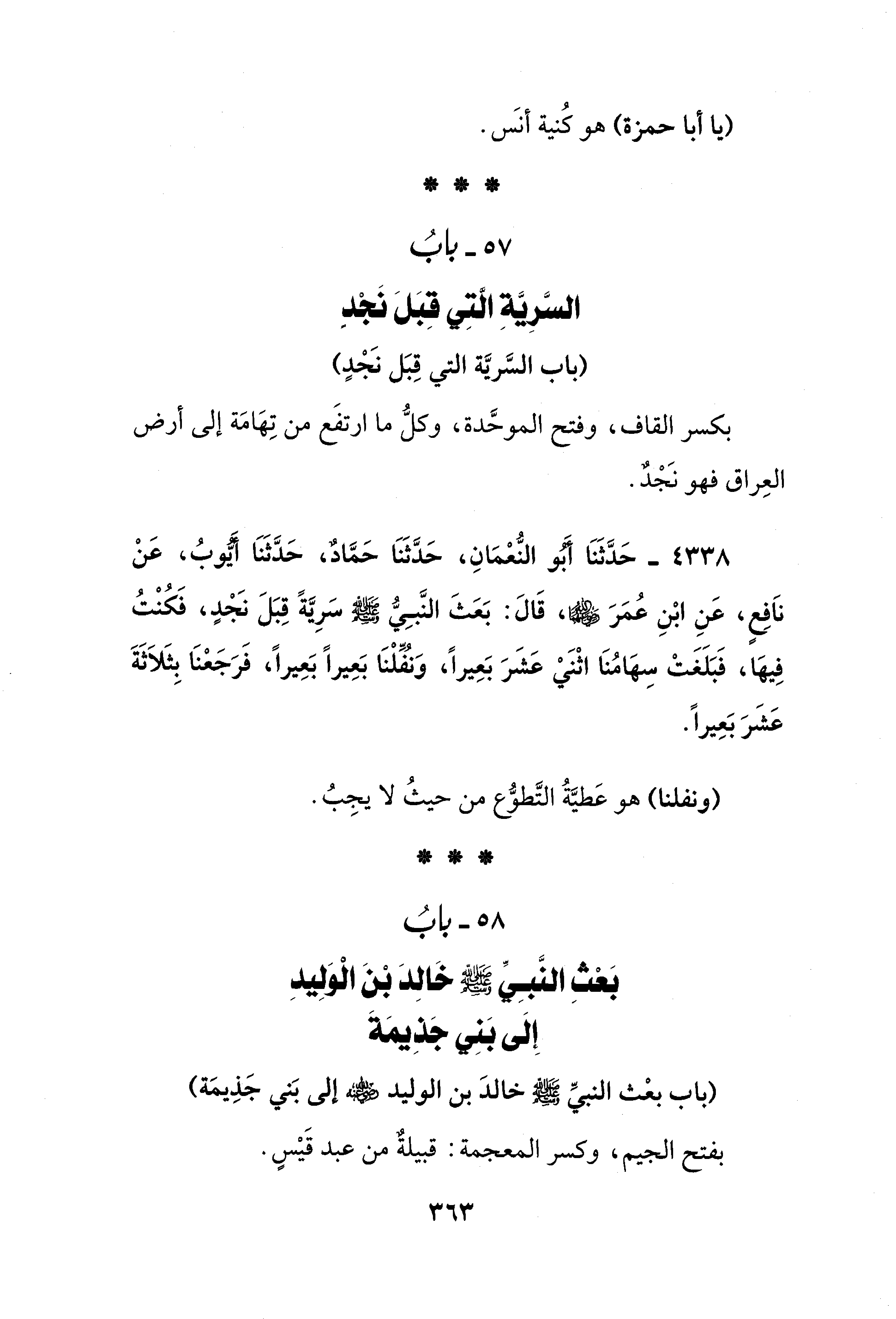 4338 - حَدَّثَنَا أَبُو النُّعْمَانِ، حَدَّثَنَا حَمَّاد، حَدَّثَنَا أَيُّوبُ، عَنْ نَافِعٍ، عَنِ ابْنِ عُمَرَ - رضي الله عنهما -، قَالَ: بَعَثَ النَّبِيُّ - صلى الله عليه وسلم - سَرِيَّةً قِبَلَ نَجْدٍ، فَكُنْتُ فِيهَا، فَبَلَغَتْ سِهَامُنَا اثْنَيْ عَشَرَ بَعِيرًا، وَنُفِّلْنَا بَعِيرًا بَعِيرًا، فَرَجَعْنَا بِثَلَاثَةَ عَشَرَ بَعِيرًا.
