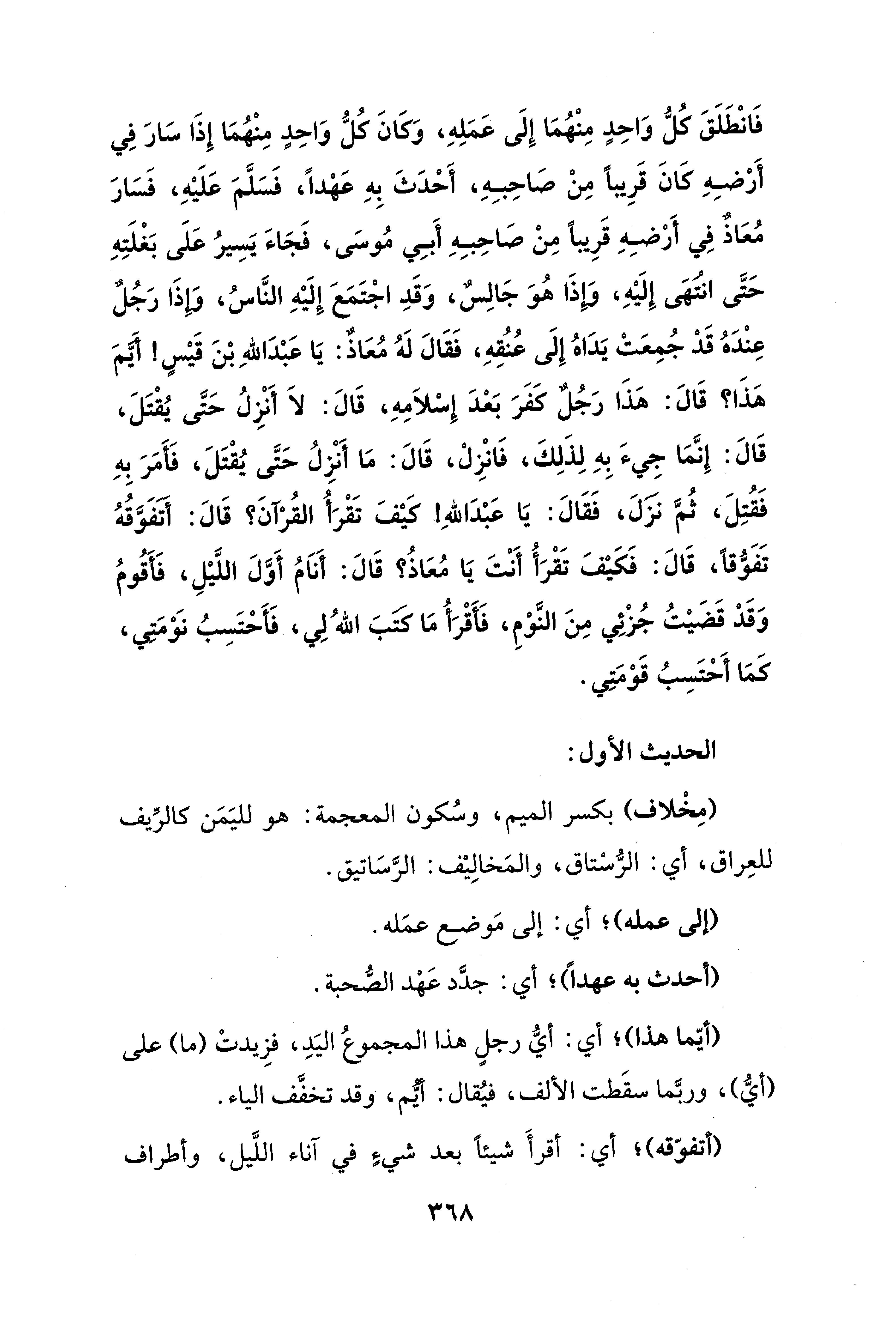 فَانْطَلَقَ كُلُّ وَاحِدٍ مِنْهُمَا إِلَى عَمَلِهِ، وَكَانَ كُلُّ وَاحِدٍ مِنْهُمَا إِذَا سَارَ في أَرْضِهِ كَانَ قَرِيبًا مِنْ صَاحِبِهِ، أَحْدَثَ بِهِ عَهْدًا، فَسَلَّمَ عَلَيْهِ، فَسَارَ مُعَاذٌ في أَرْضِهِ قَرِيبًا مِنْ صَاحِبِهِ أَبِي مُوسَى، فَجَاءَ يَسِيرُ عَلَى بَغْلَتِهِ حَتَّى انْتَهَى إِلَيْهِ، وَإِذَا هُوَ جَالِسٌ، وَقَدِ اجْتَمَعَ إِلَيْهِ النَّاسُ، وَإِذَا رَجُلٌ عِنْدَهُ قَدْ جُمِعَتْ يَدَاهُ إِلَى عُنُقِهِ، فَقَالَ لَهُ مُعَاذٌ: يَا عَبْدَ اللهِ بْنَ قَيْسٍ! أَيَّمَ هَذَا؟ قَالَ: هَذَا رَجُلٌ كفَرَ بَعْدَ إِسْلَامِهِ، قَالَ: لَا أَنْزِلُ حَتَّى يُقْتَلَ، قَالَ: إِنَّمَا جِيءَ بِهِ لِذَلِكَ، فَانْزِلْ، قَالَ: مَا أَنْزِلُ حَتَّى يُقْتَلَ، فَأَمَرَ بِهِ فَقُتِلَ، ثُمَّ نزَلَ، فَقَالَ: يَا عَبْدَ اللهِ! كيْفَ تَقْرَأُ القُرْآنَ؟ قَالَ: أَتَفَوَّقُهُ تَفَوُّقًا، قَالَ: فَكَيْفَ تَقْرَأُ أَنْتَ يَا مُعَاذُ؟ قَالَ: أَنَامُ أَوَّلَ اللَّيْلِ، فَأَقُومُ وَقَدْ قَضَيْتُ جُزْئِي مِنَ النَّوْمِ، فَأَقْرَأُ مَا كتَبَ اللهُ لِي، فَأَحْتَسِبُ نَوْمَتِي، كَمَا أَحْتَسِبُ قَوْمَتِي.