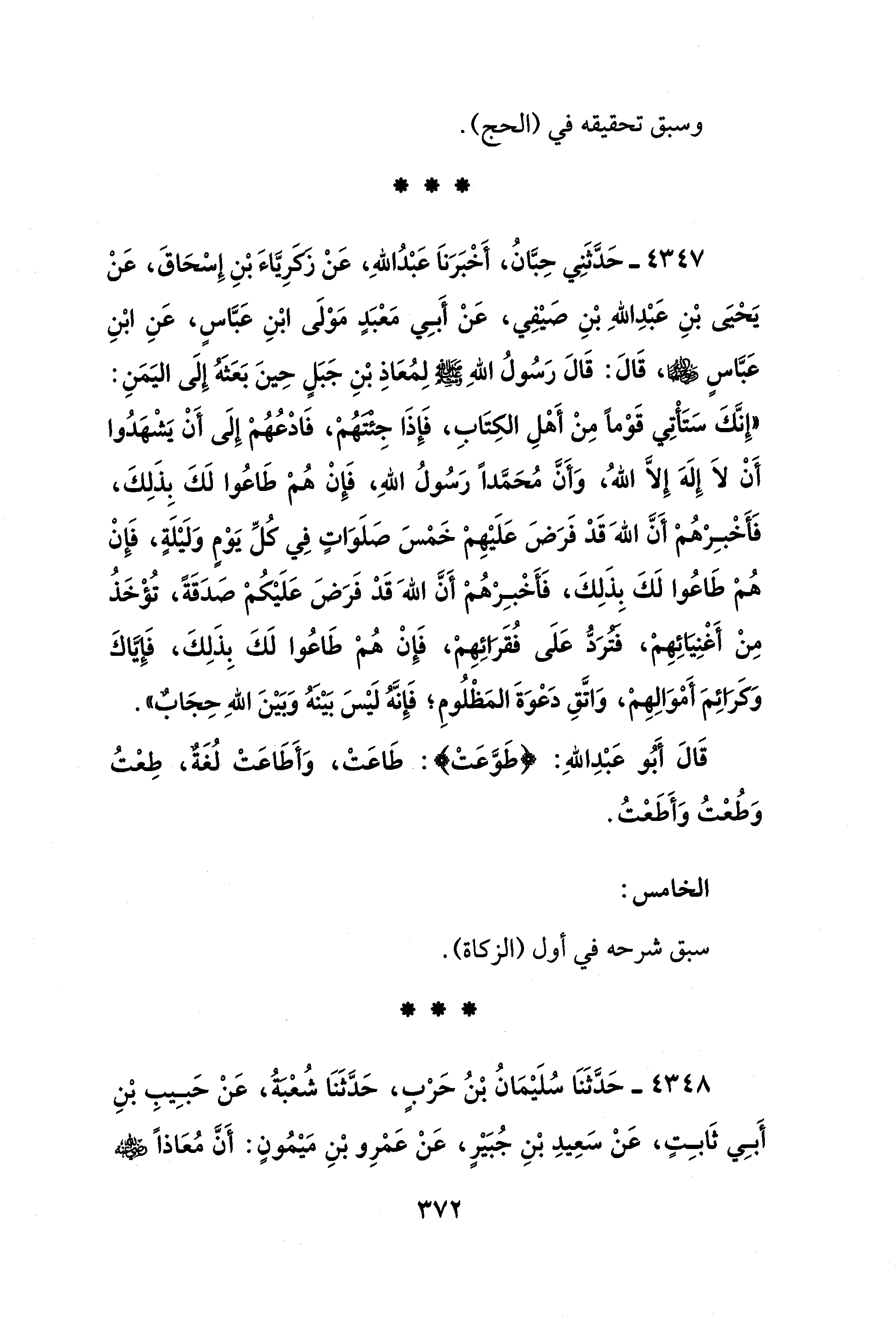 4347 - حَدَّثَنِي حِبَّانُ، أَخْبَرَنَا عَبْدُ اللهِ، عَنْ زَكَرِيَّاءَ بْنِ إِسْحَاقَ، عَنْ يَحْيَى بْنِ عَبْدِ اللهِ بْنِ صَيْفِي، عَنْ أَبِي مَعْبَدٍ مَوْلَى ابْنِ عَبَّاسٍ، عَنِ ابْنِ عَبَّاسٍ - رضي الله عنهما -، قَالَ: قَالَ رَسُولُ اللهِ - صلى الله عليه وسلم - لِمُعَاذِ بْنِ جَبَلٍ حِينَ بَعَثَهُ إِلَى اليَمَنِ: "إِنَّكَ سَتَأْتِي قَوْمًا مِنْ أَهْلِ الكِتَابِ، فَإِذَا جِئتهُمْ، فَادْعُهُمْ إِلَى أَنْ يَشْهَدُوا أَنْ لَا إِلَهَ إلا اللهُ، وَأَنَّ مُحَمَّدًا رَسُولُ اللهِ، فَإِنْ هُمْ طَاعُوا لَكَ بِذَلِكَ، فَأَخْبِرْهُمْ أَنَّ الله قَدْ فَرَضَ عَلَيْهِمْ خَمْسَ صلَوَاتٍ في كُلِّ يَوْمٍ وَلَيْلَةٍ، فَإِنْ هُمْ طَاعُوا لَكَ بِذَلِكَ، فَأَخْبِرْهُمْ أَنَّ الله قَدْ فَرَضَ عَلَيْكُمْ صَدَقَةً، تُؤْخَذُ مِنْ أَغْنِيَائِهِمْ، فَتُرَدُّ عَلَى فُقَرَائِهِمْ، فَإِنْ هُمْ طَاعُوا لَكَ بِذَلِكَ، فَإِيَّاكَ وَكَرَائِمَ أَمْوَالِهِمْ، وَاتَّقِ دَعْوَةَ المَظْلُومِ؛ فَإِنَّهُ لَيْسَ بَيْنَهُ وَبَيْنَ اللهِ حِجَابٌ".