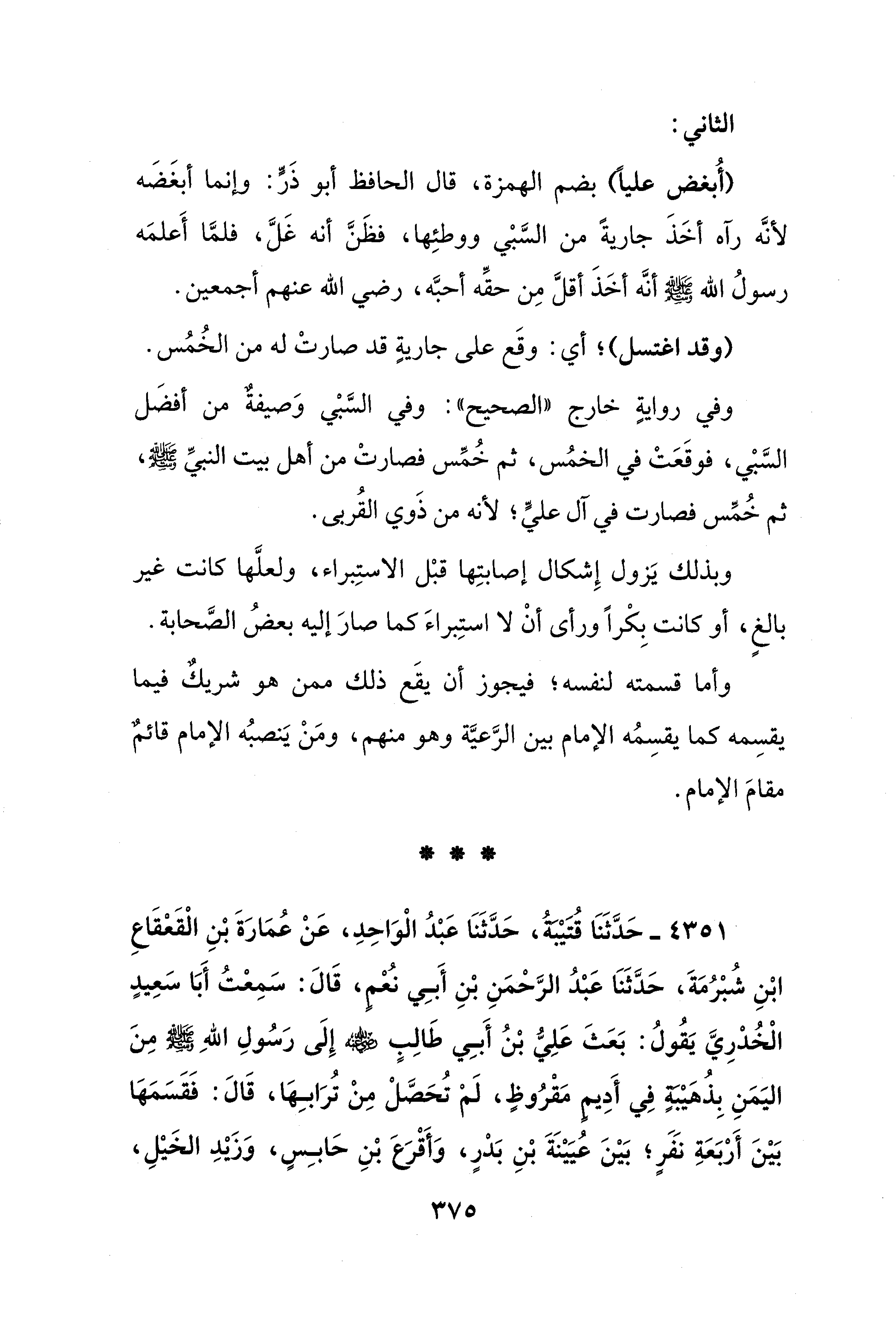 4351 - حَدَّثَنَا قتيْبَةُ، حَدَّثَنَا عَبْدُ الْوَاحِدِ، عَنْ عُمَارَةَ بْنِ الْقَعْقَاعِ بْنِ شُبْرُمَةَ، حَدَّثَنَا عَبْدُ الرَّحْمَنِ بْنِ أَبِي نُعْمٍ، قَالَ: سَمِعْتُ أَبَا سَعِيدٍ الْخُدْرِيَّ يَقُولُ: بَعَثَ عَلِيُّ بْنُ أَبِي طَالِبٍ - رضي الله عنه - إِلَى رَسُولِ اللهِ - صلى الله عليه وسلم - مِنَ اليَمَنِ بِذُهَيْبَةٍ في أَدِيمٍ مَقْرُوظٍ، لَمْ تُحَصَّلْ مِنْ تُرَابِهَا، قَالَ: فَقَسَمَهَا بَيْنَ أَرْبَعَةِ نَفَرٍ؛ بَيْنَ عُيَيْنَةَ بْنِ بَدْرٍ، وَأَقْرَعَ بْنِ حَابِسٍ، وَزَيْدِ الخَيْلِ،