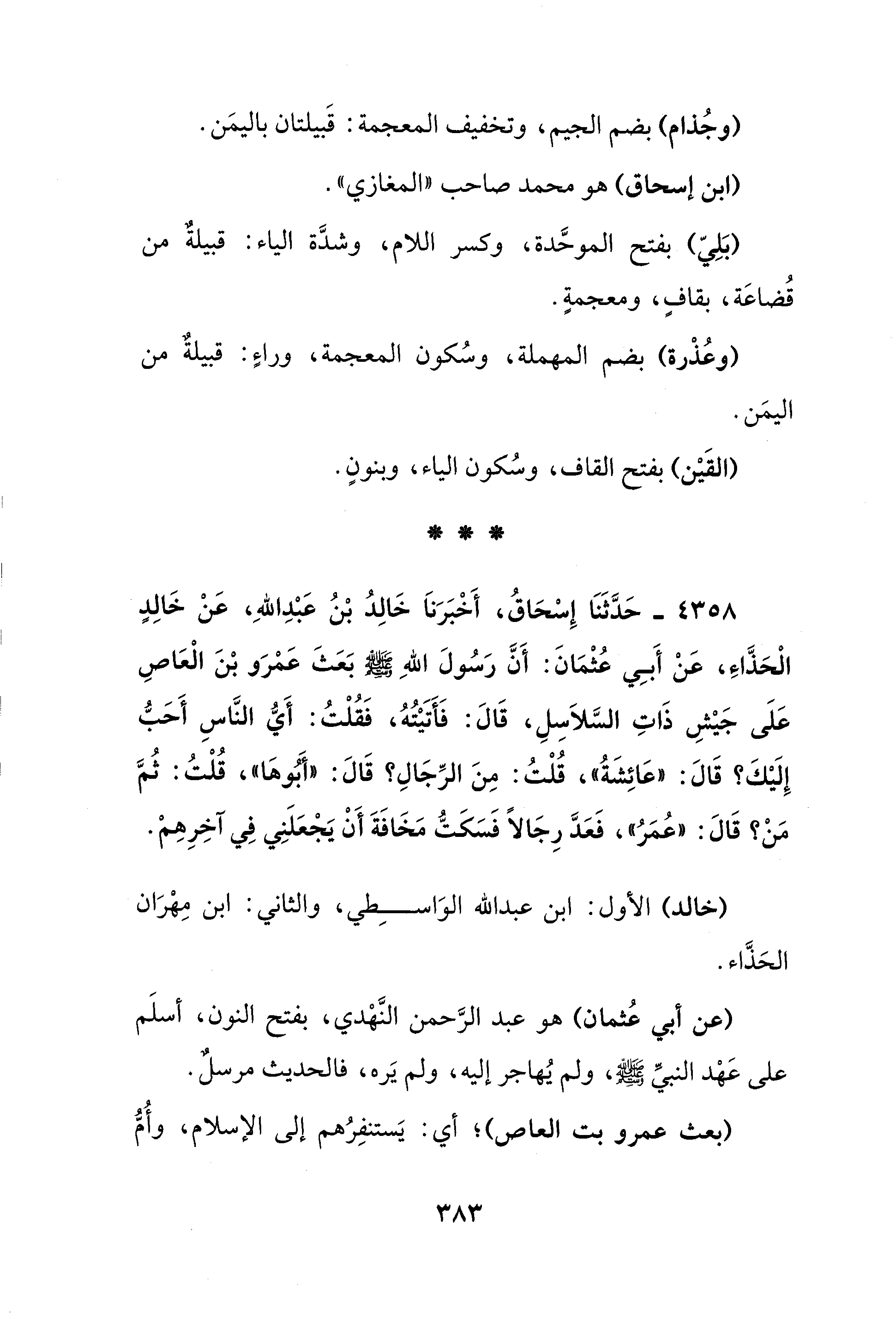 4358 - حَدَّثَنَا إِسْحَاقُ، أَخْبَرَنَا خَالِدُ بْنُ عَبْدِ اللهِ، عَنْ خَالِدٍ الْحَذَّاءِ، عَنْ أَبِي عُثْمَانَ: أَنَّ رَسُولَ اللهِ - صلى الله عليه وسلم - بَعَثَ عَمْرَو بْنَ الْعَاصِ عَلَى جَيْشِ ذَاتِ السَّلَاسِلِ، قَالَ: فَأَتَيْتُهُ، فَقُلْتُ: أَيُّ النَّاسِ أَحَبُّ إِلَيْكَ؟ قَالَ: "عَائِشَةُ"، قُلْتُ: مِنَ الرِّجَالِ؟ قَالَ: "أَبُوهَا"، قُلْتُ: ثُمَّ مَنْ؟ قَالَ: "عُمَرُ"، فَعَدَّ رِجَالًا فَسَكَتُّ مَخَافَةَ أَنْ يَجْعَلَنِي في آخِرِهِمْ.