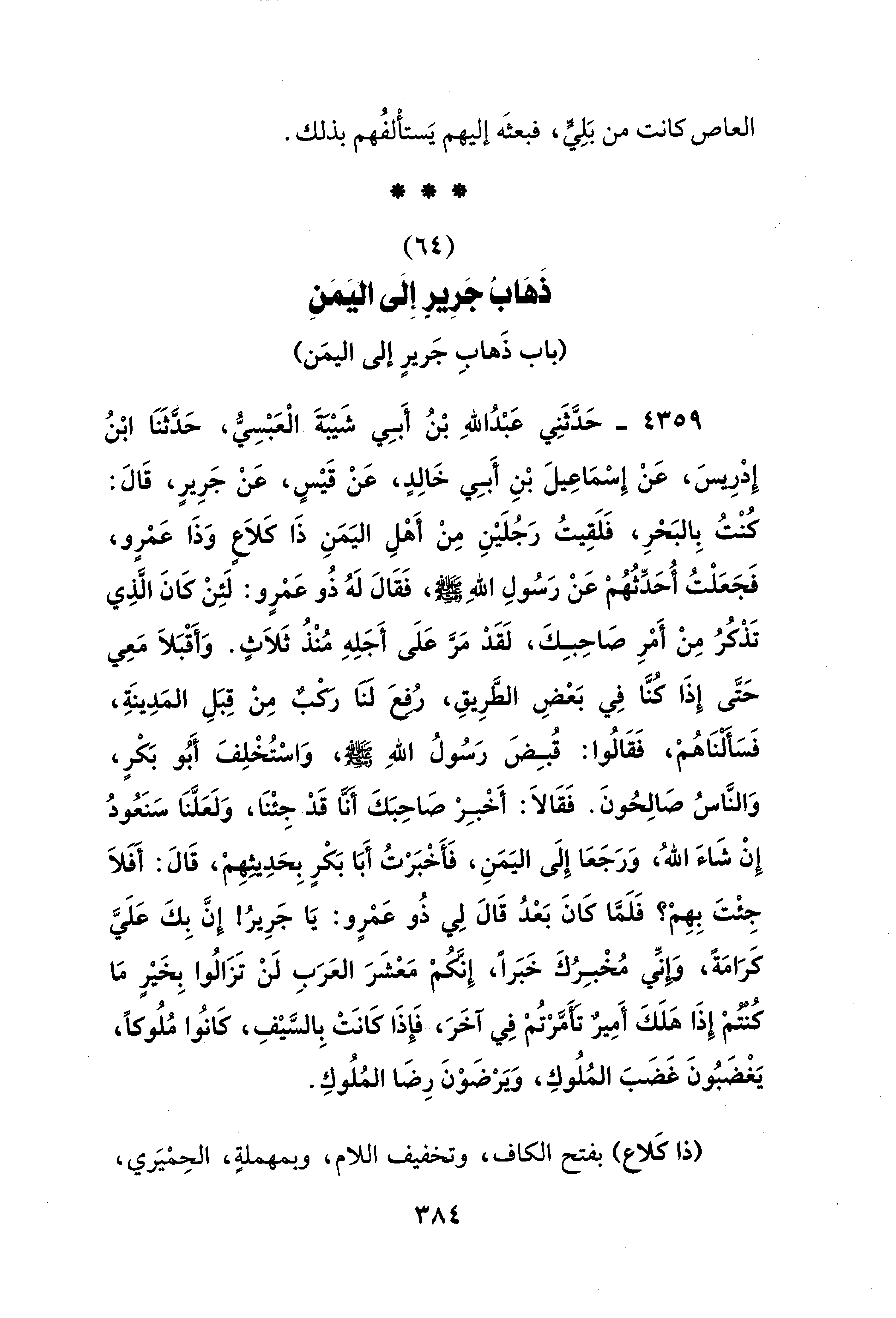 4359 - حَدَّثَنِي عَبْدُ اللهِ بْنُ أَبِي شَيْبَةَ الْعَبْسِيُّ، حَدَّثَنَا ابْنُ إدْرِيس، عَنْ إِسْمَاعِيلَ بْنِ أَبِي خَالِدٍ، عَنْ قَيْسٍ، عَنْ جَرِيرٍ، قَالَ: كنْتُ بِالبَحْرِ، فَلَقِيتُ رَجُلَيْنِ مِنْ أَهْلِ اليَمَنِ ذَا كَلَاعٍ وَذَا عَمْرٍو، فَجَعَلْتُ أُحَدِّثُهُمْ عَنْ رَسُولِ اللهِ - صلى الله عليه وسلم -، فَقَالَ لَهُ ذُو عَمْرٍو: لَئِنْ كَانَ الَّذِي تَذْكُرُ مِنْ أَمْرِ صَاحِبِكَ، لَقَدْ مَرَّ عَلَى أَجَلِهِ مُنْذُ ثَلَاثٍ. وَأَقْبَلَا مَعِي حَتَّى إِذَا كُنَّا في بَعْضِ الطَّرِيقِ، رُفِعَ لَنَا رَكبٌ مِنْ قِبَلِ المَدِينَةِ، فَسَأَلْنَاهُمْ، فَقَالُوا: قُبِضَ رَسُولُ اللهِ - صلى الله عليه وسلم -، وَاسْتُخْلِفَ أَبُو بَكْرٍ، وَالنَّاسُ صَالِحُونَ. فَقَالَا: أَخْبِرْ صَاحِبَكَ أَنَّا قَدْ جِئْنَا، وَلَعَلَّنَا سَنَعُودُ إِنْ شَاءَ اللهُ، وَرَجَعَا إِلَى اليَمَنِ، فَأَخْبَرْتُ أَبَا بَكْرٍ بِحَدِيثِهِمْ، قَالَ: أَفَلَا جِئْتَ بِهِمْ؟ فَلَمَّا كَانَ بَعْدُ قَالَ لِي ذُو عَمْرٍو: يَا جَرِيرُ! إِنَّ بِكَ عَلَيَّ كَرَامَةً، وإِنِّي مُخْبِرُكَ خَبَرًا، إِنَّكمْ مَعْشَرَ العَرَبِ لَنْ تَزَالُوا بِخَيْرٍ مَا كُنتمْ إِذَا هَلَكَ أَميرٌ تَأَمَّرْتُمْ في آخَرَ، فَإِذَا كَانَتْ بِالسَّيْفِ، كَانُوا مُلُوكًا، يَغْضَبُونَ غَضَبَ المُلُوكِ، وَيَرْضَوْنَ رِضَا المُلُوكِ.