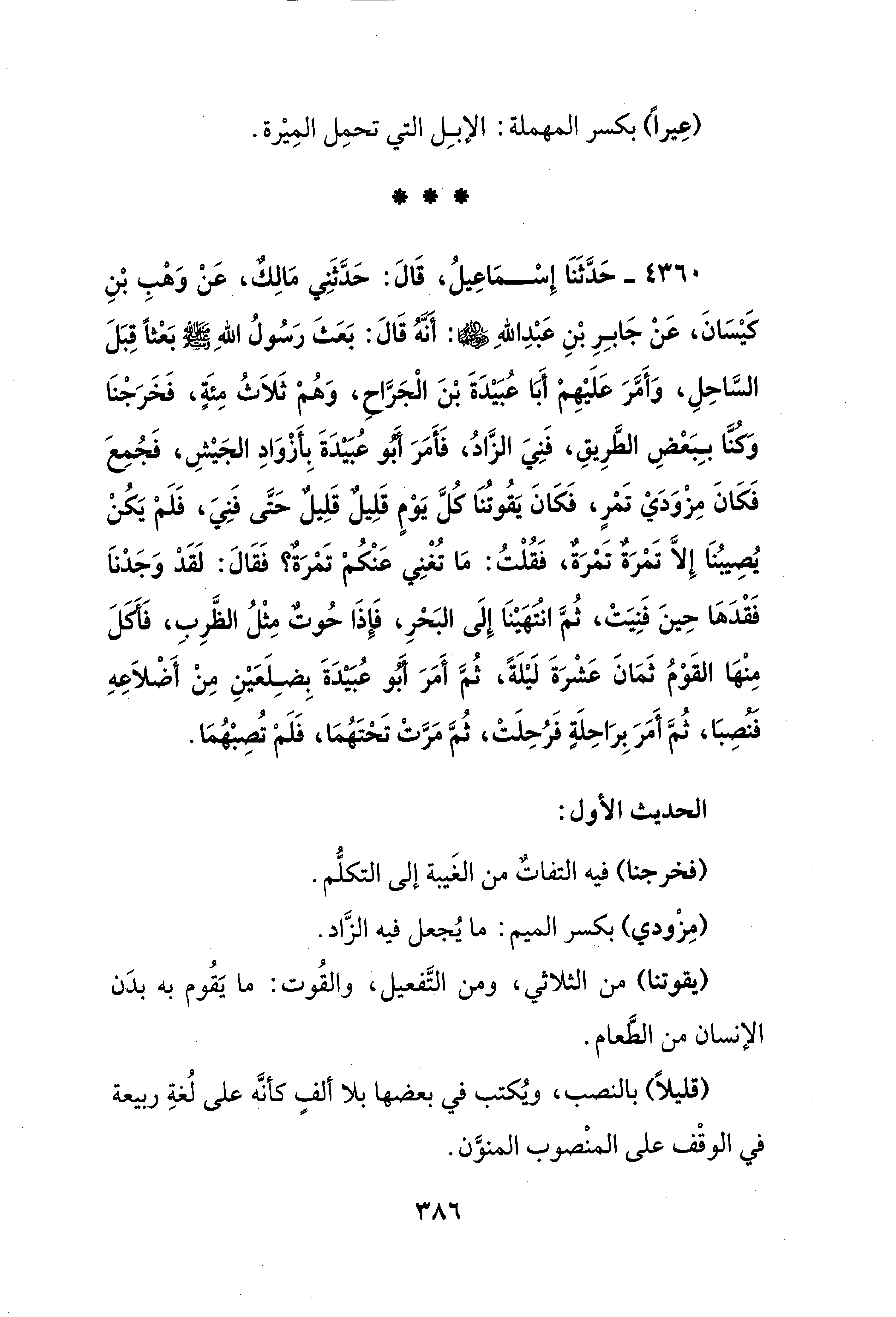 4360 - حَدَّثَنَا إِسْمَاعِيلُ، قَالَ: حَدَّثَنِي مَالِكٌ، عَنْ وَهْبِ بْنِ كَيْسَانَ، عَنْ جَابِرِ بْنِ عَبْدِ اللهِ - رضي الله عنهما -: أنَّهُ قَالَ: بَعَثَ رَسُولُ اللهِ - صلى الله عليه وسلم - بَعْثًا قِبَلَ السَّاحِلِ، وَأَمَّرَ عَلَيْهِمْ أَبَا عُبَيْدَةَ بْنَ الْجَرَّاحِ، وَهُمْ ثَلَاثُ مِئَةٍ، فَخَرَجْنَا وَكنَّا بِبَعْضِ الطَّرِيقِ، فَنِيَ الزَّادُ، فَأَمَرَ أَبُو عُبَيْدَةَ بِأَزْوَادِ الجَيْشِ، فَجُمِعَ فَكَانَ مِزْوَدَيْ تَمْرٍ، فَكَانَ يَقُوتُنَا كُلَّ يَوْمٍ قَلِيلٌ قَلِيلٌ حَتَّى فَنِيَ، فَلَمْ يَكُنْ يُصِيبُنَا إلا تَمْرَةٌ تَمْرَةٌ، فَقُلْتُ: مَا تُغْنِي عَنْكُمْ تَمْرَةٌ؟ فَقَالَ: لَقَدْ وَجَدْنَا فَقْدَهَا حِينَ فَنِيَتْ، ثُمَّ انتهَيْنَا إِلَى البَحْرِ، فَإِذَا حُوتٌ مِثْلُ الظَّرِبِ، فَأَكَلَ مِنْهَا القَوْمُ ثَمَانَ عَشْرَةَ لَيْلَةً، ثُمَّ أَمَرَ أَبُو عُبَيْدَةَ بِضِلَعَيْنِ مِنْ أَضْلَاعِهِ فنصِبَا، ثُمَّ أَمَرَ بِرَاحِلَةٍ فَرُحِلَتْ، ثُمَّ مَرَّتْ تَحْتَهُمَا، فَلَمْ تُصِبْهُمَا.