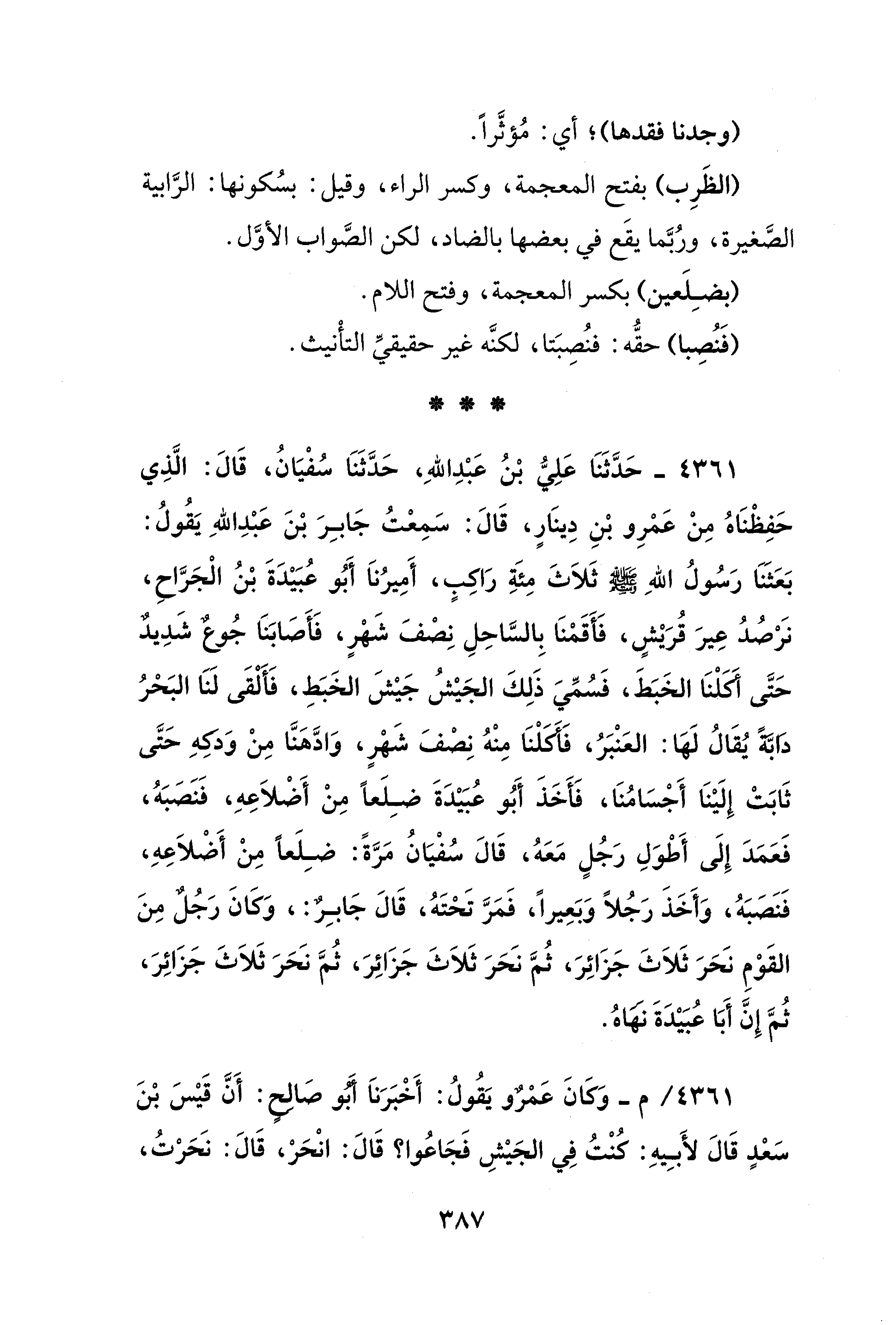 4361 - حَدَّثَنَا عَلِيُّ بْنُ عَبْدِ اللهِ، حَدَّثَنَا سُفْيَانُ، قَالَ: الَّذِي حَفِظْنَاهُ مِنْ عَمْرِو بْنِ دِينَارٍ، قَالَ: سَمِعْتُ جَابِرَ بْنَ عَبْدِ اللهِ يَقُولُ: بَعَثَنَا رَسُولُ اللهِ - صلى الله عليه وسلم - ثَلَاثَ مِئَةِ رَاكِبٍ، أَمِيرُنَا أَبُو عُبَيْدَةَ بْنُ الْجَرَّاحِ، نَرْصُدُ عِيرَ قُرَيْشٍ، فَأَقَمْنَا بِالسَّاحِلِ نِصْفَ شَهْرٍ، فَأَصَابَنَا جُوعٌ شَدِيدٌ حَتَّى أَكَلْنَا الخَبَطَ، فَسُمِّيَ ذَلِكَ الجَيْشُ جَيْشَ الخَبَطِ، فَألْقَى لَنَا البَحْرُ دَابَّةً يُقَالُ لَهَا: العَنْبَرُ، فَأَكَلْنَا مِنْهُ نِصْفَ شَهْرٍ، وَادَّهَنَّا مِنْ وَدكِهِ حَتَّى ثَابَتْ إِلَيْنَا أَجْسَامُنَا، فَأَخَذَ أَبُو عُبَيْدَةَ ضِلَعًا مِنْ أَضْلَاعِهِ، فَنَصَبَهُ، فَعَمَدَ إِلَى أَطْوَلِ رَجُلٍ مَعَهُ، قَالَ سُفْيَانُ مَرَّةً: ضِلَعًا مِنْ أَضْلَاعِهِ، فَنَصَبَهُ، وَأَخَذَ رَجُلًا وَبَعِيرًا، فَمَرَّ تَحْتَهُ، قَالَ جَابرٌ: وَكَانَ رَجُلٌ مِنَ القَوْمِ نَحَرَ ثَلَاثَ جَزَائِرَ، ثُمَّ نَحَرَ ثَلَاثَ جَزَائِرَ، ثُمَّ نَحَرَ ثَلَاثَ جَزَائِرَ، ثُمَّ إِنَّ أَبَا عُبَيْدَةَ نَهَاهُ.