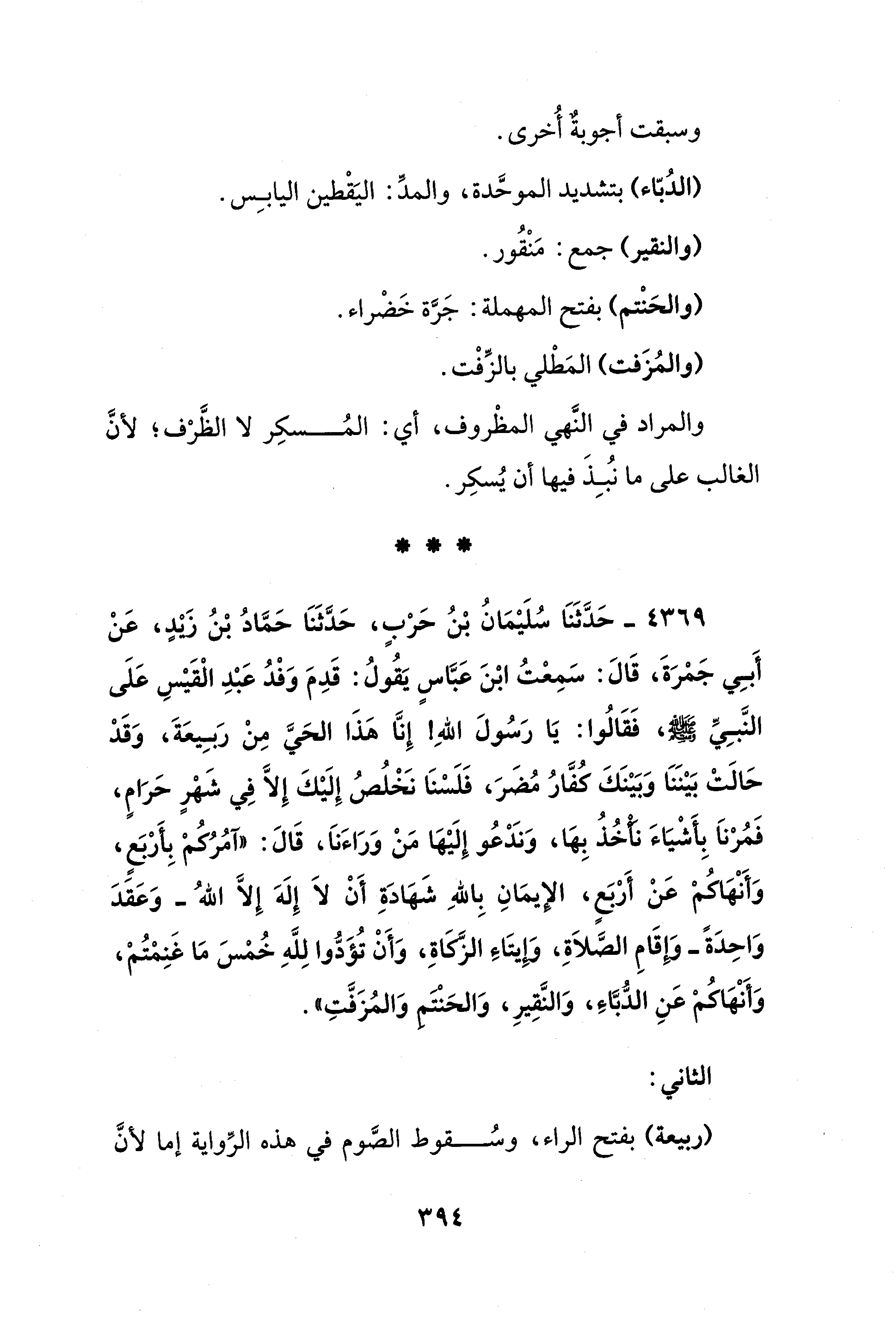 4369 - حَدَّثَنَا سُلَيْمَانُ بْنُ حَرْبٍ، حَدَّثَنَا حَمَّادُ بْنُ زَيْدٍ، عَنْ أَبِي جَمْرَةَ، قَالَ: سَمِعْتُ ابْنَ عَبَّاسٍ يَقُولُ: قَدِمَ وَفْدُ عَبْدِ الْقَيْسِ عَلَى النَّبِيِّ - صلى الله عليه وسلم -، فَقَالُوا: يَا رَسُولَ اللهِ! إِنَّا هَذَا الحَيَّ مِنْ رَبِيعَةَ، وَقَدْ حَالَتْ بَيْنَنَا وَبَيْنَكَ كفَّارُ مُضَرَ، فَلَسْنَا نَخْلُصُ إِلَيْكَ إلا في شَهْرٍ حَرَامٍ، فَمُرْنَا بِأَشْيَاءَ نَأْحُذُ بِهَا، وَنَدْعُو إِلَيْهَا مَنْ وَرَاءَنَا، قَالَ: "آمُرُكُمْ بِأَرْبَعٍ، وَأَنْهَاكُمْ عَنْ أَرْبَعٍ، الإيمَانِ بِاللهِ شَهَادَةِ أَنْ لَا إِلَهَ إلا اللهُ -وَعَقَدَ وَاحِدَةً- وَإِقَامِ الصَّلَاةِ، وَإِيتَاءِ الزَّكَاةِ، وَأَنْ تُؤَدُّوا لِلَّهِ خُمْسَ مَا غَنِمْتُمْ، وَأَنْهَاكُمْ عَنِ الدُّبَّاءِ، وَالنَّقِيرِ، وَالحَنْتَم وَالمُزَفَّتِ".