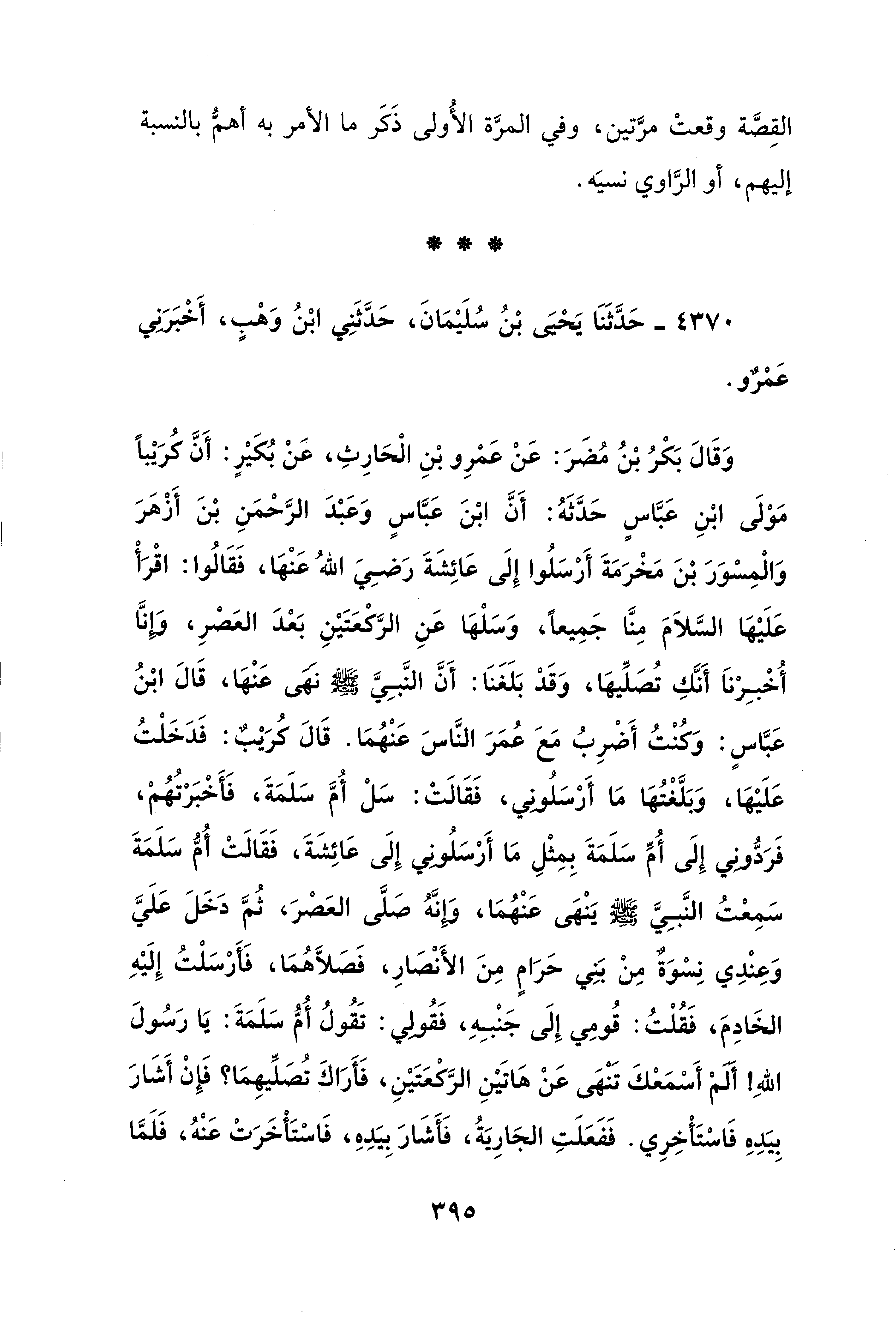 وَقَالَ بَكْرُ بْنُ مُضَرَ: عَنْ عَمْرِو بْنِ الْحَارِثِ، عَنْ بُكَيْرٍ: أَنَّ كُرَيْبًا مَوْلَى ابْنِ عَبَّاسٍ حَدَّثَهُ: أَنَّ ابْنَ عَبَّاسٍ وَعَبْدَ الرَّحْمَنِ بْنَ أَزْهَرَ وَالْمِسْوَرَ بْنَ مَخْرَمَةَ أَرْسَلُوا إِلَى عَائِشَةَ رَضِيَ اللهُ عَنْهَا، فَقَالُوا: اقْرَأْ عَلَيْهَا السَّلَامَ مِنَّا جَمِيعًا، وَسَلْهَا عَنِ الرَّكعَتَيْنِ بَعْدَ العَصْرِ، وَإِنَّا أُخْبِرْنَا أَنَّكِ تُصَلِّيهَا، وَقَدْ بَلَغَنَا: أَنَّ النَّبِيَّ - صلى الله عليه وسلم - نهى عَنْهَا، قَالَ ابْنُ عَبَّاسٍ: وَكُنْتُ أَضْرِبُ مَعَ عُمَرَ النَّاسَ عَنْهُمَا. قَالَ كُرَيْبٌ: فَدَخَلْتُ عَلَيْهَا، وَبَلَّغْتُهَا مَا أَرْسَلُونِي، فَقَالَتْ: سَلْ أُمَّ سَلَمَةَ، فَأَخْبَرْتُهُمْ، فَرَدُّوني إِلَى أُمِّ سَلَمَةَ بِمِثْلِ مَا أَرْسَلُوني إِلَى عَائِشَةَ، فَقَالَتْ أُمُّ سَلَمَةَ سَمِعْتُ النَّبِيَّ - صلى الله عليه وسلم - يَنْهَى عَنْهُمَا، وإِنَّهُ صَلَّى العَصْرَ، ثُمَّ دَخَلَ عَلَيَّ وَعِنْدِي نِسْوَةٌ مِنْ بَنِي حَرَامٍ مِنَ الأَنْصَارِ، فَصَلَّاهُمَا، فَأَرْسَلْتُ إِلَيْهِ الخَادِمَ، فَقُلْتُ: قُومِي إِلَى جَنْبِهِ، فَقُولِي: تَقُولُ أُمُّ سَلَمَةَ: يَا رَسُولَ اللهِ! ألمْ أَسْمَعْكَ تنهَى عَنْ هَاتَيْنِ الرَّكْعَتَيْنِ، فَأَرَاكَ تُصَلِّيهِمَا؟ فَإِنْ أَشَارَ بِيَدِهِ فَاسْتَأْخِرِي. فَفَعَلَتِ الجَارِيَةُ، فَأَشَارَ بِيَدِهِ، فَاسْتَأْخَرَتْ عَنْهُ، فَلَمَّا