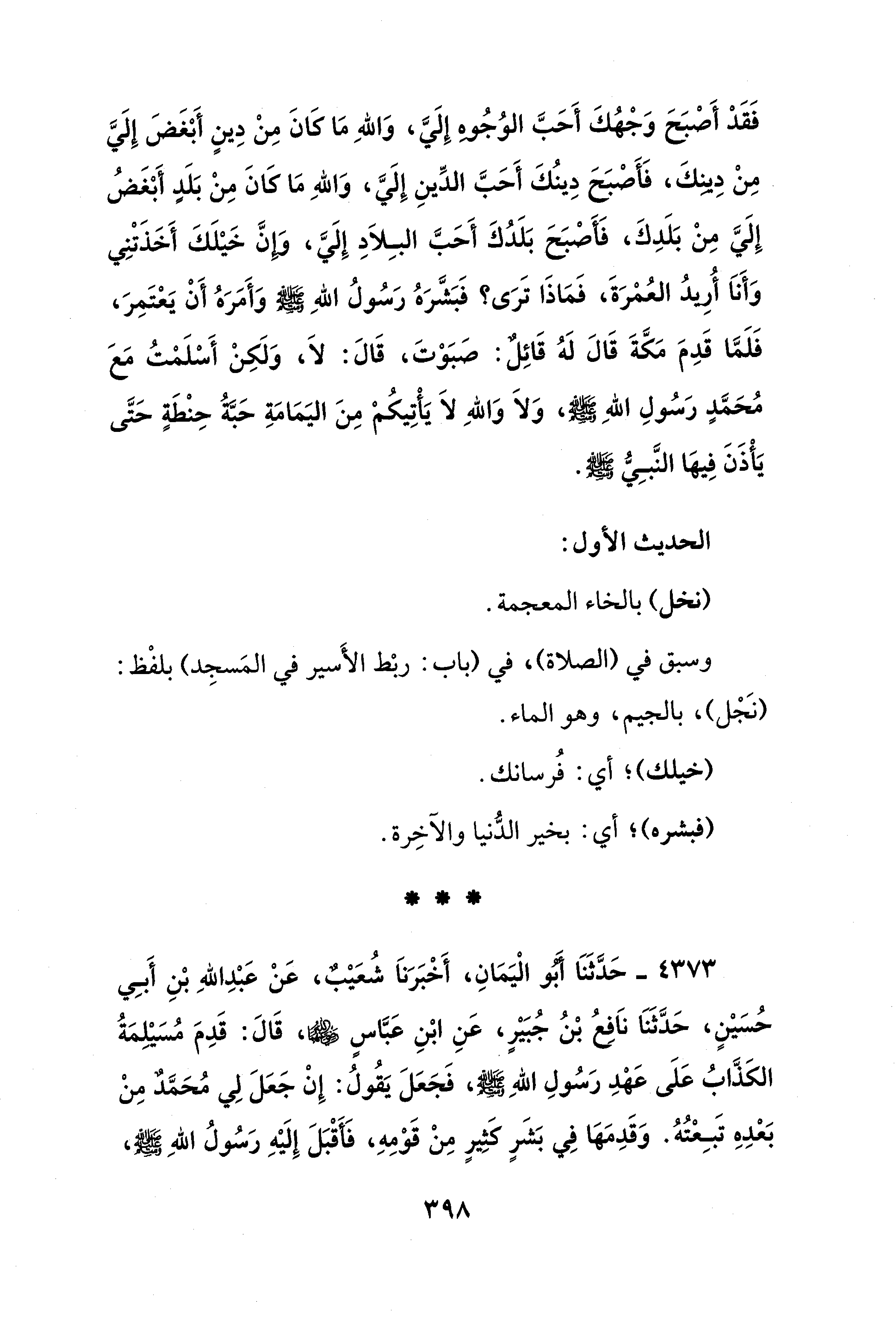 4373 - حَدَّثَنَا أَبُو الْيَمَانِ، أَخْبَرَنَا شُعَيْبٌ، عَنْ عَبْدِ اللهِ بْنِ أَبِي حُسَيْنٍ، حَدَّثَنَا نَافِعُ بْنُ جُبَيْرٍ، عَنِ ابْنِ عَبَّاسٍ - رضي الله عنهما -، قَالَ: قَدِمَ مُسَيْلِمَةُ الكَذَّابُ عَلَى عَهْدِ رَسُولِ اللهِ - صلى الله عليه وسلم -، فَجَعَلَ يَقُولُ: إِنْ جَعَلَ لِي مُحَمَّدٌ مِنْ بَعْدِهِ تَبِعْتُهُ. وَقَدِمَهَا في بَشَرٍ كَثِيرٍ مِنْ قَوْمِهِ، فَأَقْبَلَ إِلَيْهِ رَسُولُ اللهِ - صلى الله عليه وسلم -،