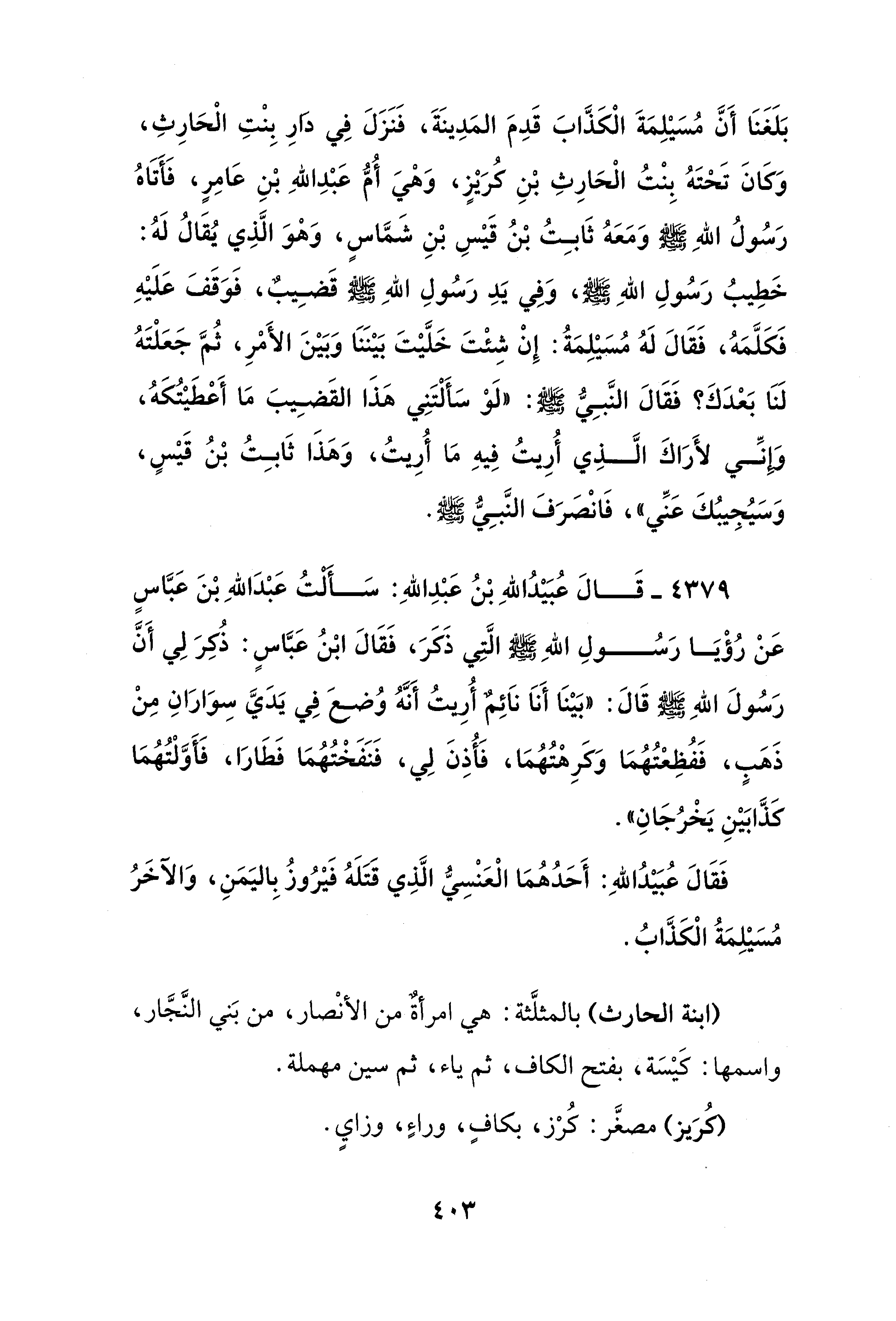 4379 - قَالَ عُبَيْدُ اللهِ بْنُ عَبْدِ اللهِ: سَأَلْتُ عَبْدَ اللهِ بْنَ عَبَّاسٍ عَنْ رُؤْيَا رَسُولِ اللهِ - صلى الله عليه وسلم - الَّتِي ذَكَرَ، فَقَالَ ابْنُ عَبَّاسٍ: ذُكِرَ لِي أَنَّ رَسُولَ اللهِ - صلى الله عليه وسلم - قَالَ: "بَيْنَا أَنَا نَائِمٌ أُرِيتُ أَنَّهُ وُضعَ في يَدَيَّ سِوَارَانِ مِنْ ذَهَبٍ، فَفُظِعْتُهُمَا وَكَرِهْتُهُمَا، فَأُذِنَ لِي، فَنَفَخْتُهُمَا فَطَارَا، فَأَوَّلْتُهُمَا كَذَّابَيْنِ يَخْرُجَانِ".