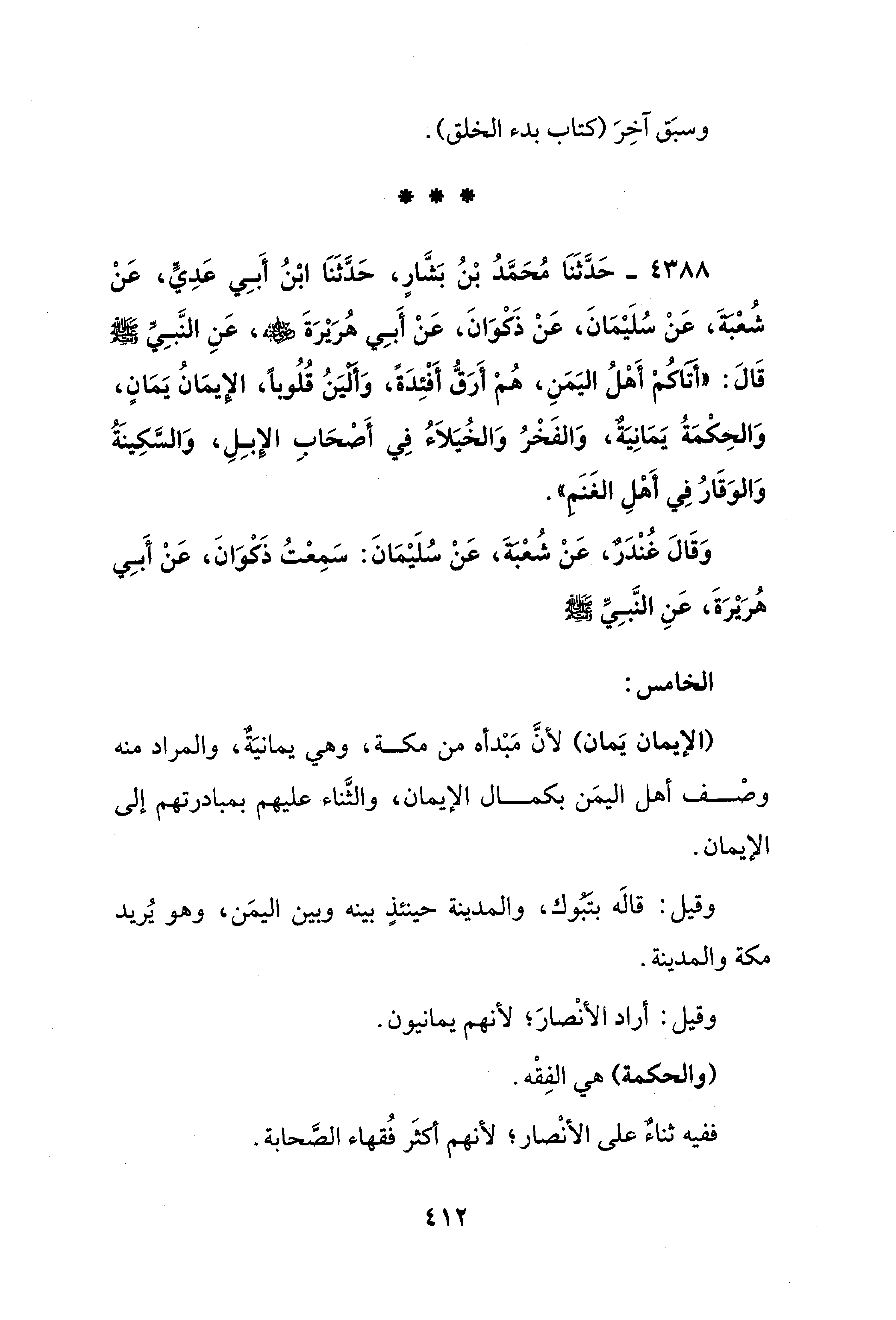 4388 - حَدَّثَنَا مُحَمَّدُ بْنُ بَشَّارٍ، حَدَّثَنَا ابْنُ أَبِي عَدِيٍّ، عَنْ شُعْبة، عَنْ سُلَيْمَانَ، عَنْ ذَكْوَانَ، عَنْ أَبِي هُرَيْرَةَ - رضي الله عنه -، عَنِ النَّبِيِّ - صلى الله عليه وسلم - قَالَ: "أَتَاكُمْ أَهْلُ اليَمَنِ، هُمْ أَرَقُّ أَفْئِدَةً، وَأليَنُ قُلُوبًا، الإيمَانُ يَمَانٍ، وَالحِكْمَةُ يَمَانِيَةٌ، وَالفَخْرُ وَالخُيَلَاءُ في أَصْحَابِ الإبِلِ، وَالسَّكِينَةُ وَالوَقَارُ في أَهْلِ الغَنَمِ".