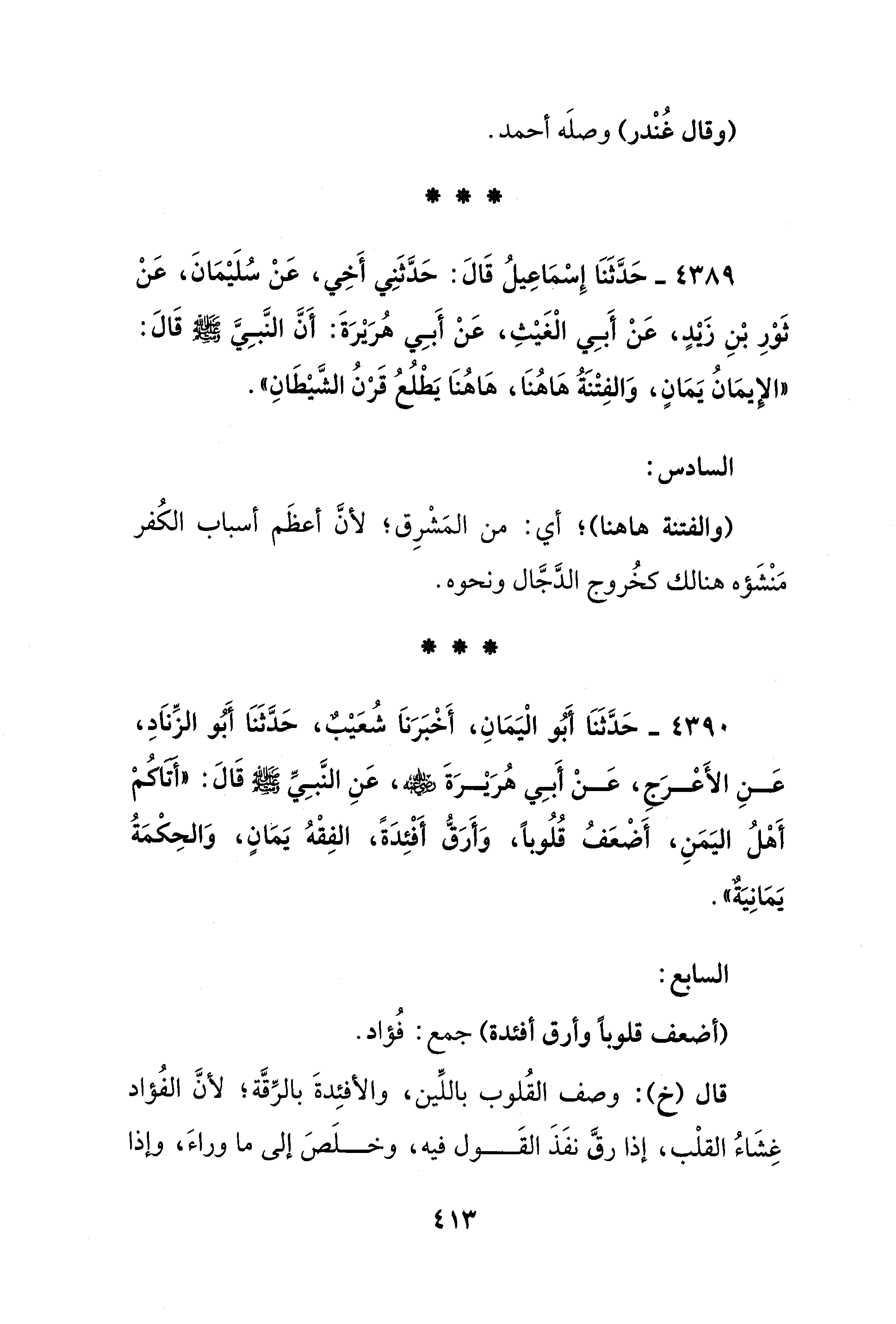 4390 - حَدَّثَنَا أَبُو الْيَمَانِ، أَخْبَرَنَا شُعَيبٌ، حَدَّثَنَا أَبُو الزِّنَادِ، عَنِ الأَعْرَجِ، عَنْ أَبِي هُرَيْرَةَ - رضي الله عنه -، عَنِ النَّبِيِّ - صلى الله عليه وسلم - قَالَ: "أَتَاكُمْ أَهْلُ اليَمَنِ، أَضْعَفُ قُلُوبًا، وَأَرَقُّ أَفْئِدَةً، الفِقْهُ يَمَانٍ، وَالحِكْمَةُ يَمَانِيَةٌ".
