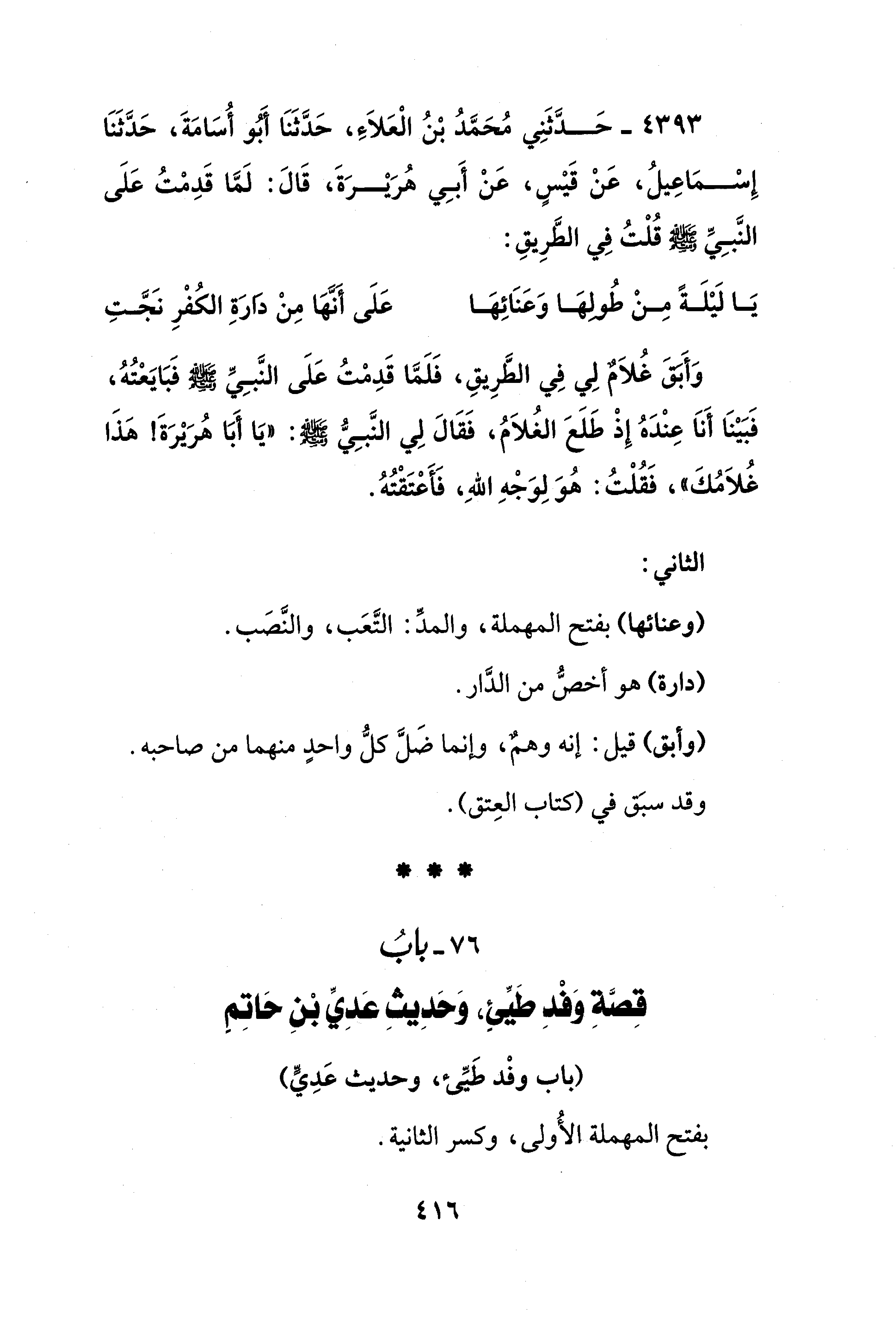 4393 - حَدَّثَنِي مُحَمَّدُ بْنُ الْعَلَاءِ، حَدَّثَنَا أَبُو أُسَامَةَ، حَدَّثَنَا إِسْمَاعِيلُ، عَنْ قَيْسٍ، عَنْ أَبِي هُرَيْرَةَ، قَالَ: لَمَّا قَدِمْتُ عَلَى النَّبِيِّ - صلى الله عليه وسلم - قُلْتُ في الطَّرِيقِ: