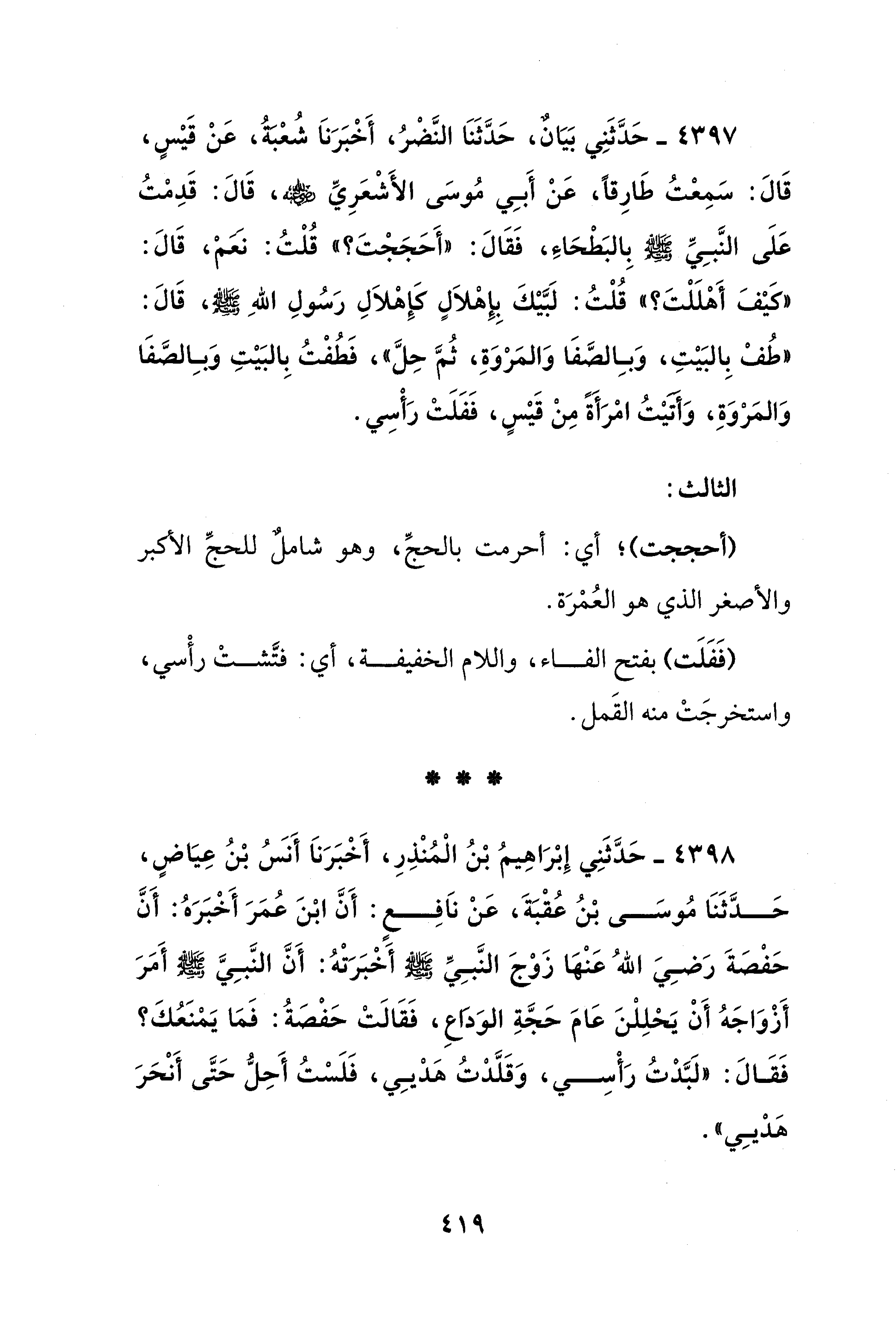 4397 - حَدَّثَنِي بَيَانٌ، حَدَّثَنَا النَّضْرُ، أَخْبَرَنَا شُعْبَةُ، عَنْ قَيْسٍ، قَالَ: سَمِعْتُ طَارِقًا، عَنْ أَبِي مُوسَى الأَشْعَرِيِّ - رضي الله عنه -، قَالَ: قَدِمْتُ عَلَى النَّبِيِّ - صلى الله عليه وسلم -، بِالبَطْحَاءِ، فَقَالَ: "أَحَجَجْتَ؟ " قُلْتُ: نعمْ، قَالَ: "كَيْفَ أَهْلَلْتَ؟ " قُلْتُ: لَبَّيْكَ بِإِهْلَالٍ كإِهْلَالِ رَسُولِ اللهِ - صلى الله عليه وسلم -، قَالَ: "طُفْ بِالبَيْتِ، وَبِالصَّفَا وَالمَرْوَةِ، ثُمَّ حِلَّ"، فَطُفْتُ بِالبَيْتِ وَبِالصَّفَا وَالمَرْوَةِ، وَأَتيْتُ امْرَأةً مِنْ قَيْسٍ، فَفَلَتْ رَأْسِي.