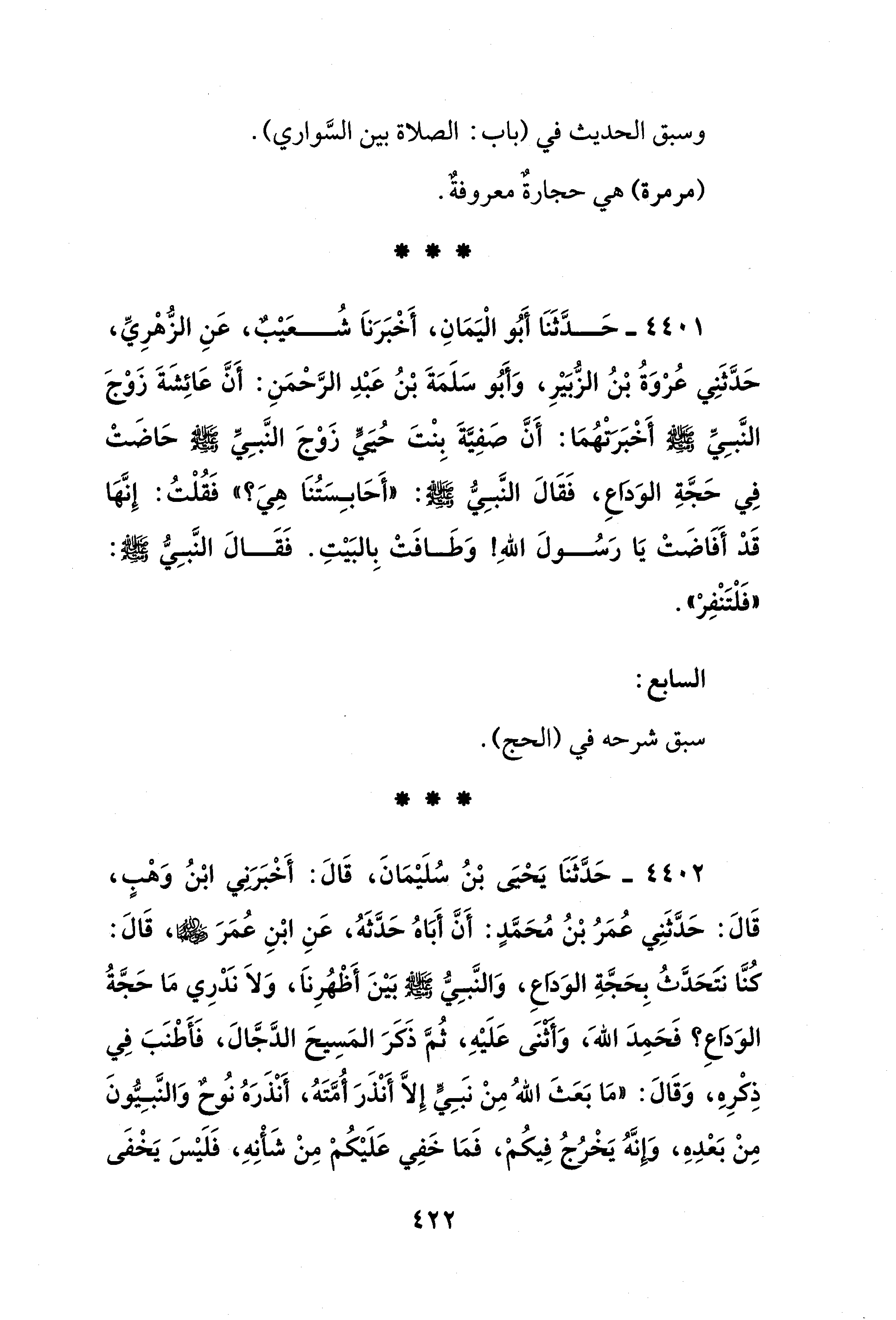 4402 - حَدَّثَنَا يَحْيَى بْنُ سُلَيْمَانَ، قَالَ: أَخْبَرَني ابْنُ وَهْبٍ، قَالَ: حَدَّثَنِي عُمَرُ بْنُ مُحَمَّدٍ: أَنَّ أَبَاهُ حَدَّثَهُ، عَنِ ابْنِ عُمَرَ - رضي الله عنهما -، قَالَ: كُنَّا نتَحَدَّثُ بِحَجَّةِ الوَدَاعِ، وَالنَّبِيُّ - صلى الله عليه وسلم - بَيْنَ أَظْهُرِنَا، وَلَا نَدْرِي مَا حَجَّةُ الوَدَاعِ؟ فَحَمِدَ الله، وَأثنَى عَلَيْهِ، ثُمَّ ذَكَرَ المَسِيحَ الدَّجَّالَ، فَأَطْنَبَ في ذِكْرِهِ، وَقَالَ: "مَا بَعَثَ اللهُ مِنْ نبَيٍّ إلا أَنْذَرَ أُمَّتَهُ، أَنْذَرَهُ نُوحٌ وَالنَّبِيُّونَ مِنْ بَعْدِهِ، وَإِنَّهُ يَخْرُجُ فِيكُمْ، فَمَا خَفِي عَلَيْكُمْ مِنْ شَأْنِهِ، فَلَيْسَ يَخْفَى