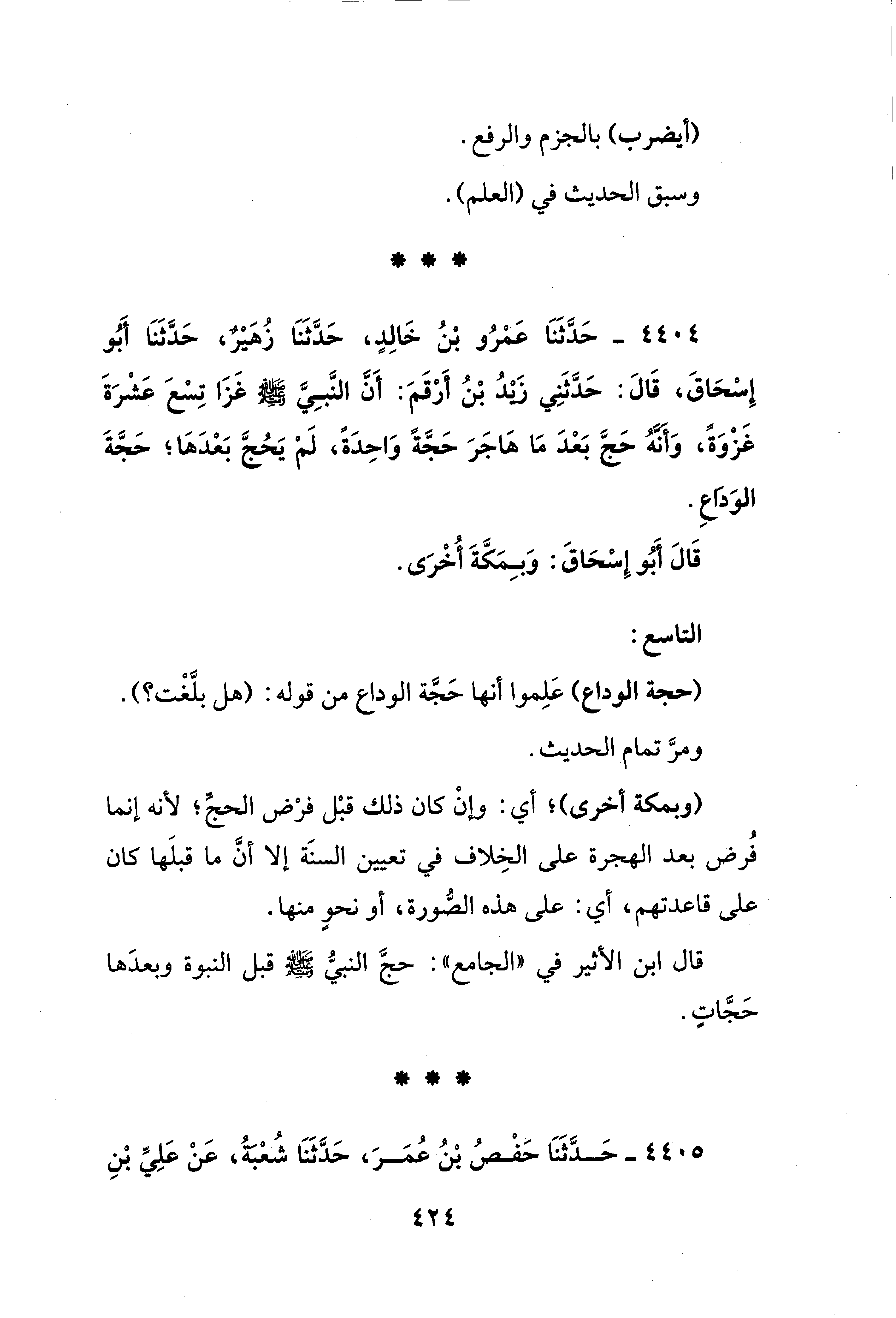 4404 - حَدَّثَنَا عَمْرُو بْنُ خَالِدٍ، حَدَّثَنَا زُهَيْرٌ، حَدَّثَنَا أَبُو إِسْحَاقَ، قَالَ: حَدَّثَنِي زيدُ بْنُ أرْقَمَ: أَنَّ النَّبِيَّ - صلى الله عليه وسلم - غَزَا تِسْعَ عَشْرَةَ غَزْوَةً، وَأَنَّهُ حَجَّ بَعْدَ مَا هَاجَرَ حَجَّةً وَاحِدَةً، لَمْ يَحُجَّ بَعْدَهَا؛ حَجَّةَ الوَدَاعِ.