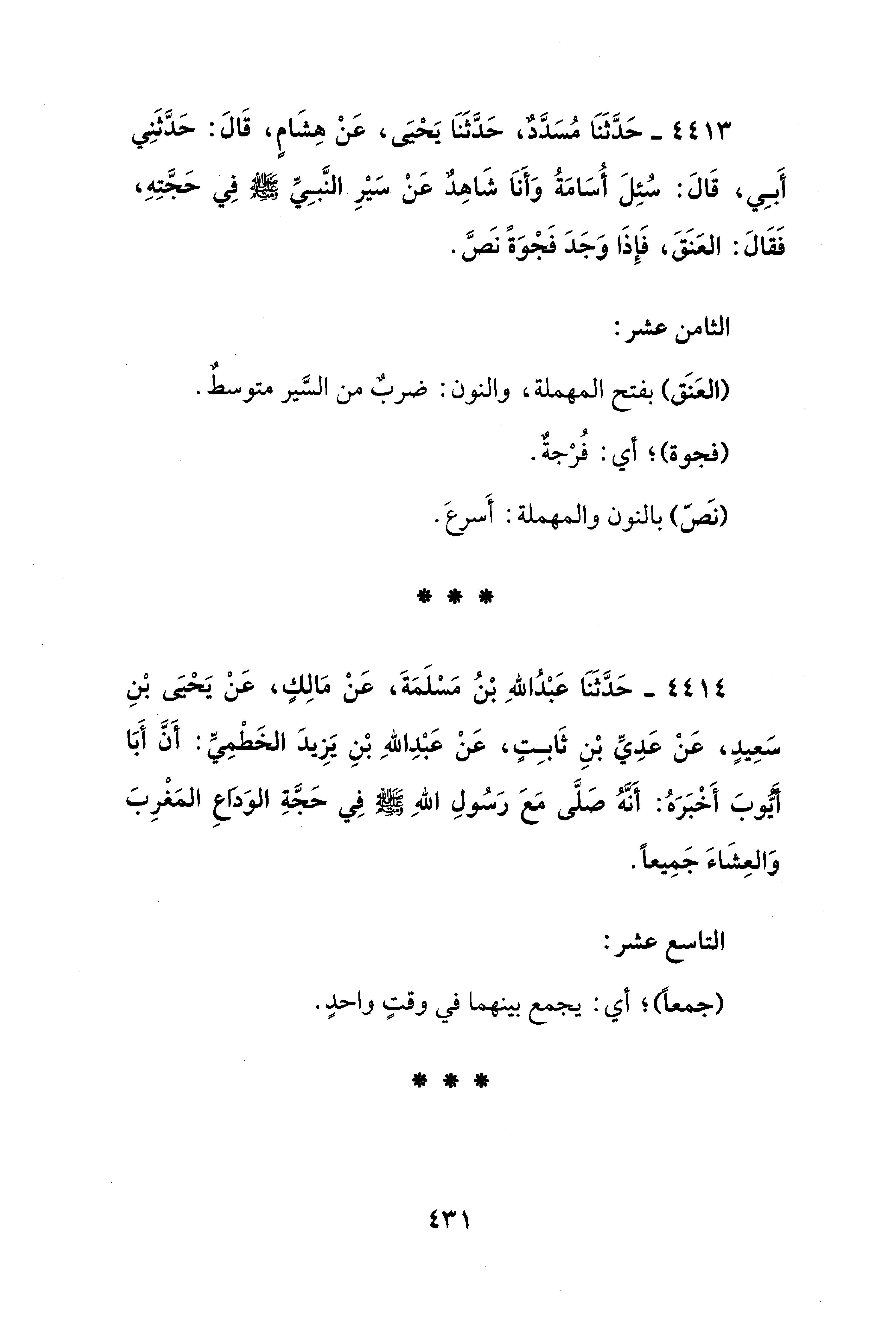 4413 - حَدَّثَنَا مُسَدَّدٌ، حَدَّثَنَا يَحْيَى، عَنْ هِشَامٍ، قَالَ: حَدَّثَنِي أَبِي، قَالَ: سُئِلَ أُسَامَةُ وَأَنَا شَاهِدٌ عَنْ سَيْرِ النَّبِيِّ - صلى الله عليه وسلم - في حَجَّتِهِ، فَقَالَ: العَنَقَ، فَإِذَا وَجَدَ فَجْوَةً نَصَّ.