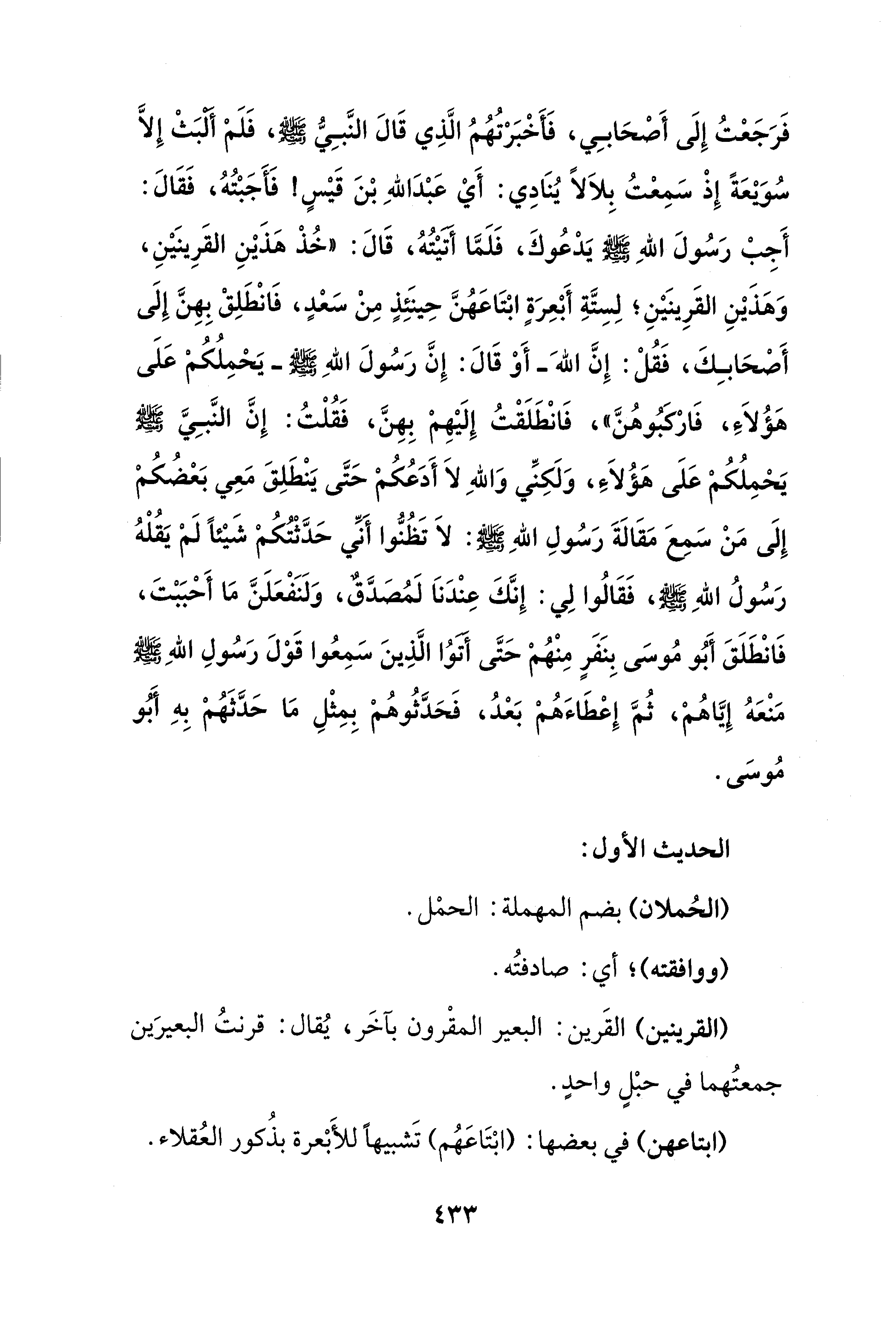 فَرَجَعْتُ إِلَى أَصْحَابِي، فَأَخْبَرْتُهُمُ الَّذِي قَالَ النَّبِيُّ - صلى الله عليه وسلم -، فَلَمْ ألْبَثْ إلا سُوَيْعَةً إِذْ سَمِعْتُ بِلَالًا يُنَادِي: أَيْ عَبْدَ اللهِ بْنَ قَيْسٍ! فَأَجَبْتُهُ، فَقَالَ: أَجِبْ رَسُولَ اللهِ - صلى الله عليه وسلم - يَدْعُوكَ، فَلَمَّا أَتَيْتُهُ، قَالَ: "خُذْ هَذَيْنِ القَرِينَيْنِ، وَهَذَيْنِ القَرِينَيْنِ؛ لِسِتَّةِ أَبْعِرَةٍ ابْتَاعَهُنَّ حِينَئِذٍ مِنْ سَعْدٍ، فَانْطَلِقْ بِهِنَّ إِلَى أَصْحَابِكَ، فَقُلْ: إِنَّ الله -أَوْ قَالَ: إِنَّ رَسُولَ اللهِ - صلى الله عليه وسلم - يَحْمِلُكُمْ عَلَى هَؤُلَاءِ، فَارْكَبُوهُنَّ"، فَانْطَلَقْتُ إِلَيْهِمْ بِهِنَّ، فَقُلْتُ: إِنَّ النَّبِيَّ - صلى الله عليه وسلم - يَحْمِلُكُمْ عَلَى هَؤُلَاءِ، وَلَكِنِّي وَاللهِ لَا أَدَعُكُمْ حَتَّى يَنْطَلِقَ مَعِي بَعْضُكُمْ إِلَى مَنْ سَمِعَ مَقَالَةَ رَسُولِ اللهِ - صلى الله عليه وسلم -: لَا تَظُنُّوا أَنِّي حَدَّثْتُكُمْ شَيْئًا لَمْ يَقُلْهُ رَسُولُ اللهِ - صلى الله عليه وسلم -، فَقَالُوا لِي: إِنَّكَ عِنْدَنَا لَمُصَدَّقٌ، وَلَنَفْعَلَنَّ مَا أَحْبَبْتَ، فَانْطَلَقَ أَبُو مُوسَى بِنَفَرٍ مِنْهُمْ حَتَّى أَتَوُا الَّذِينَ سَمِعُوا قَوْلَ رَسُولِ اللهِ - صلى الله عليه وسلم - مَنْعَهُ إِيَّاهُمْ، ثُمَّ إِعْطَاءَهُمْ بَعْدُ، فَحَدَّثُوهُمْ بِمِثْلِ مَا حَدَّثَهُمْ بِهِ أَبُو مُوسَى.