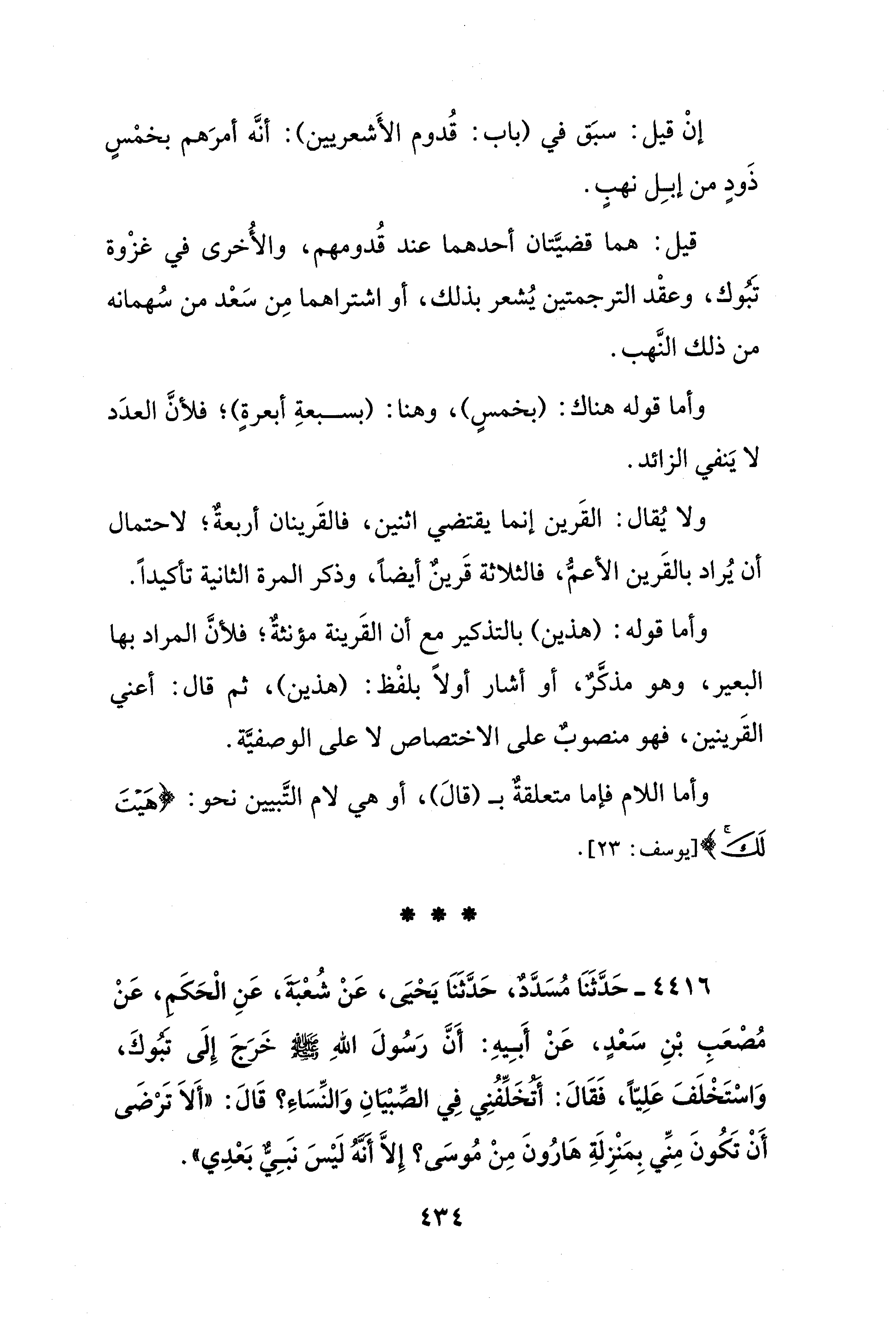 4416 - حَدَّثَنَا مُسَدَّدٌ، حَدَّثَنَا يَحْيَى، عَنْ شُعْبَةَ، عَنِ الْحَكَمِ، عَنْ مُصْعَبِ بْنِ سَعْدٍ، عَنْ أَبِيهِ: أَنَّ رَسُولَ اللهِ - صلى الله عليه وسلم - خَرَجَ إِلَى تَبُوكَ، وَاسْتَخْلَفَ عَلِيًّا، فَقَالَ: أَتُخَلِّفُنِي في الصِّبْيَانِ وَالنِّسَاءِ؟ قَالَ: "أَلَا تَرْضَى أَنْ تَكُونَ مِنِّي بِمَنْزِلَةِ هَارُونَ مِنْ مُوسَى؟ إلا أنَّهُ لَيْسَ نبَيٌّ بَعْدِي".