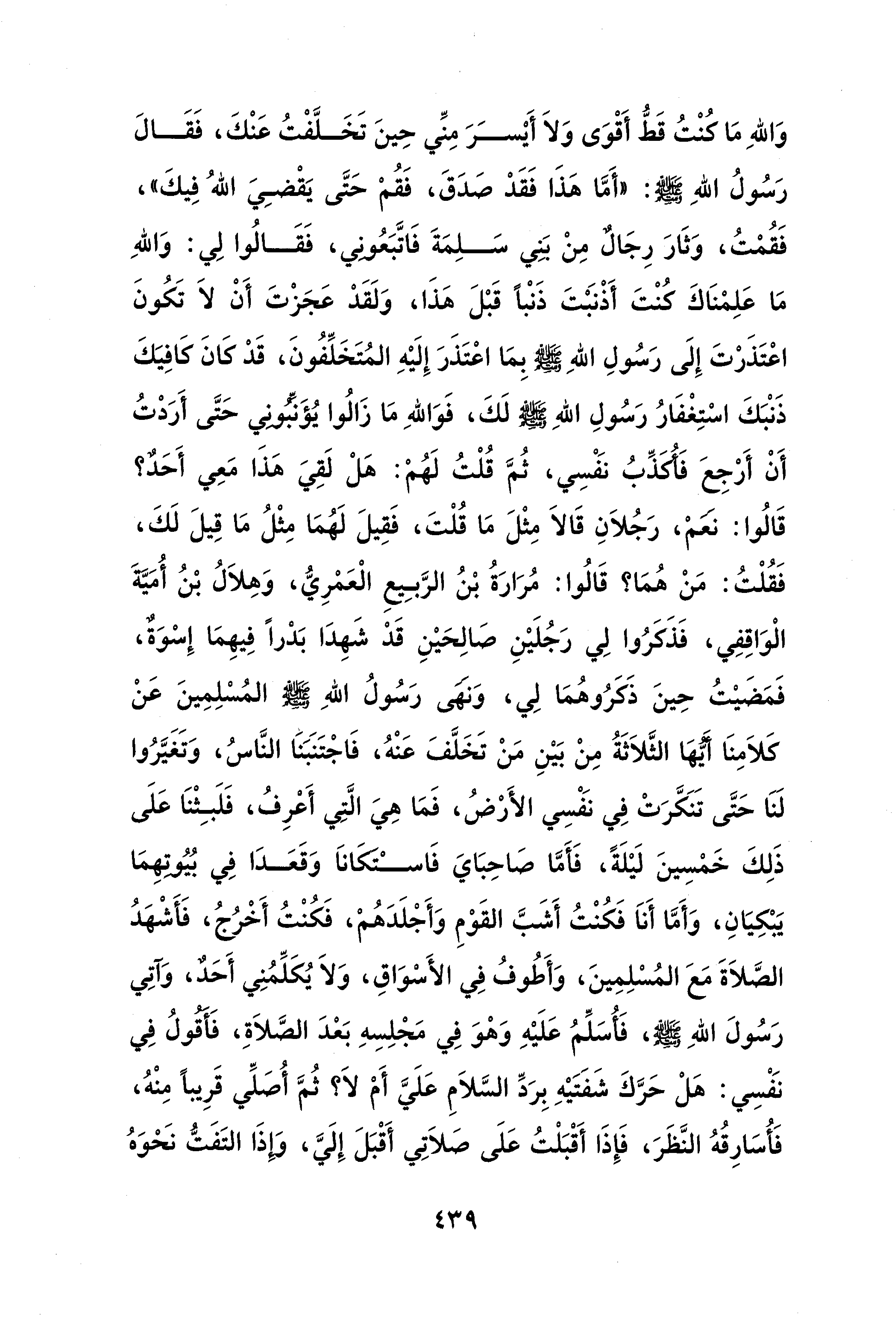 وَاللهِ مَا كُنْتُ قَطُّ أَقْوَى وَلَا أَيْسَرَ مِنِّي حِينَ تَخَلَّفْتُ عَنْكَ، فَقَالَ رَسُولُ اللهِ - صلى الله عليه وسلم -: "أَمَّا هَذَا فَقَدْ صَدَقَ، فَقُمْ حَتَّى يَقْضِيَ اللهُ فِيكَ"، فَقُمْتُ، وَثَارَ رِجَالٌ مِنْ بَنِي سَلِمَةَ فَاتَّبَعُونِي، فَقَالُوا لِي: وَاللهِ مَا عَلِمْنَاكَ كنْتَ أَذْنبتَ ذَنْبًا قَبْلَ هَذَا، وَلَقَدْ عَجَزْتَ أَنْ لَا تَكُونَ اعْتَذَرْتَ إِلَى رَسُولِ اللهِ - صلى الله عليه وسلم - بِمَا اعْتَذَرَ إِلَيْهِ المُتَخَلِّفُونَ، قَدْ كَانَ كَافِيَكَ ذَنْبَكَ اسْتِغْفَارُ رَسُولِ اللهِ - صلى الله عليه وسلم - لَكَ، فَوَاللهِ مَا زَالُوا يُؤَنِّبُونِي حَتَّى أَرَدْتُ أَنْ أَرْجِعَ فَأُكَذِّبُ نَفْسِي، ثُمَّ قُلْتُ لَهُمْ: هَلْ لَقِيَ هَذَا مَعِي أَحَدٌ؟ قَالُوا: نعم، رَجُلَانِ قَالَا مِثْلَ مَا قُلْتَ، فَقِيلَ لَهُمَا مِثْلُ مَا قِيلَ لَكَ، فَقُلْتُ: مَنْ هُمَا؟ قَالُوا: مُرَارَةُ بْنُ الرَّبِيعِ الْعَمْرِيُّ، وَهِلَالُ بْنُ أُمَيَّةَ الْوَاقِفِي، فَذَكَرُوا لِي رَجُلَيْنِ صَالِحَيْنِ قَدْ شَهِدَا بَدْرًا فِيهِمَا إِسْوَةٌ، فَمَضَيْتُ حِينَ ذَكَرُوهُمَا لِي، وَنهى رَسُولُ اللهِ - صلى الله عليه وسلم - المُسْلِمِينَ عَنْ كَلَامِنَا أَيُّهَا الثَّلَاثَةُ مِنْ بَيْنِ مَنْ تَخَلَّفَ عَنْهُ، فَاجْتَنَبَنَا النَّاسُ، وَتَغَيَّرُوا لَنَا حَتَّى تَنَكَّرَتْ في نَفْسِي الأَرْضُ، فَمَا هِيَ الَّتِي أَعْرِفُ، فَلَبِثْنَا عَلَى ذَلِكَ خَمْسِينَ لَيْلَةً، فَأَمَّا صَاحِبَايَ فَاسْتكَانَا وَقَعَدَا في بُيُوتِهِمَا يَبْكِيَانِ، وَأَمَّا أَنَا فَكُنْتُ أَشَبَّ القَوْمِ وَأَجْلَدَهُمْ، فَكُنْتُ أَخْرُجُ، فَأَشْهَدُ الصَّلَاةَ مَعَ المُسْلِمِينَ، وَأَطُوفُ في الأَسْوَاقِ، وَلَا يُكَلِّمُنِي أَحَدٌ، وَآتِي رَسُولَ اللهِ - صلى الله عليه وسلم -، فَأُسَلِّمُ عَلَيْهِ وَهْوَ في مَجْلِسِهِ بَعْدَ الصَّلَاةِ، فَأَقُولُ في نَفْسِي: هَلْ حَرَّكَ شَفَتَيْهِ بِرَدِّ السَّلَامِ عَلَيَّ أَمْ لَا؟ ثُمَّ أُصَلِّي قَرِيبًا مِنْهُ، فَأُسَارِقُهُ النَّظَرَ، فَإِذَا أَقْبَلْتُ عَلَى صَلَاتِي أَقْبَلَ إِلَيَّ، وَإِذَا التَفَتُّ نَحْوَهُ