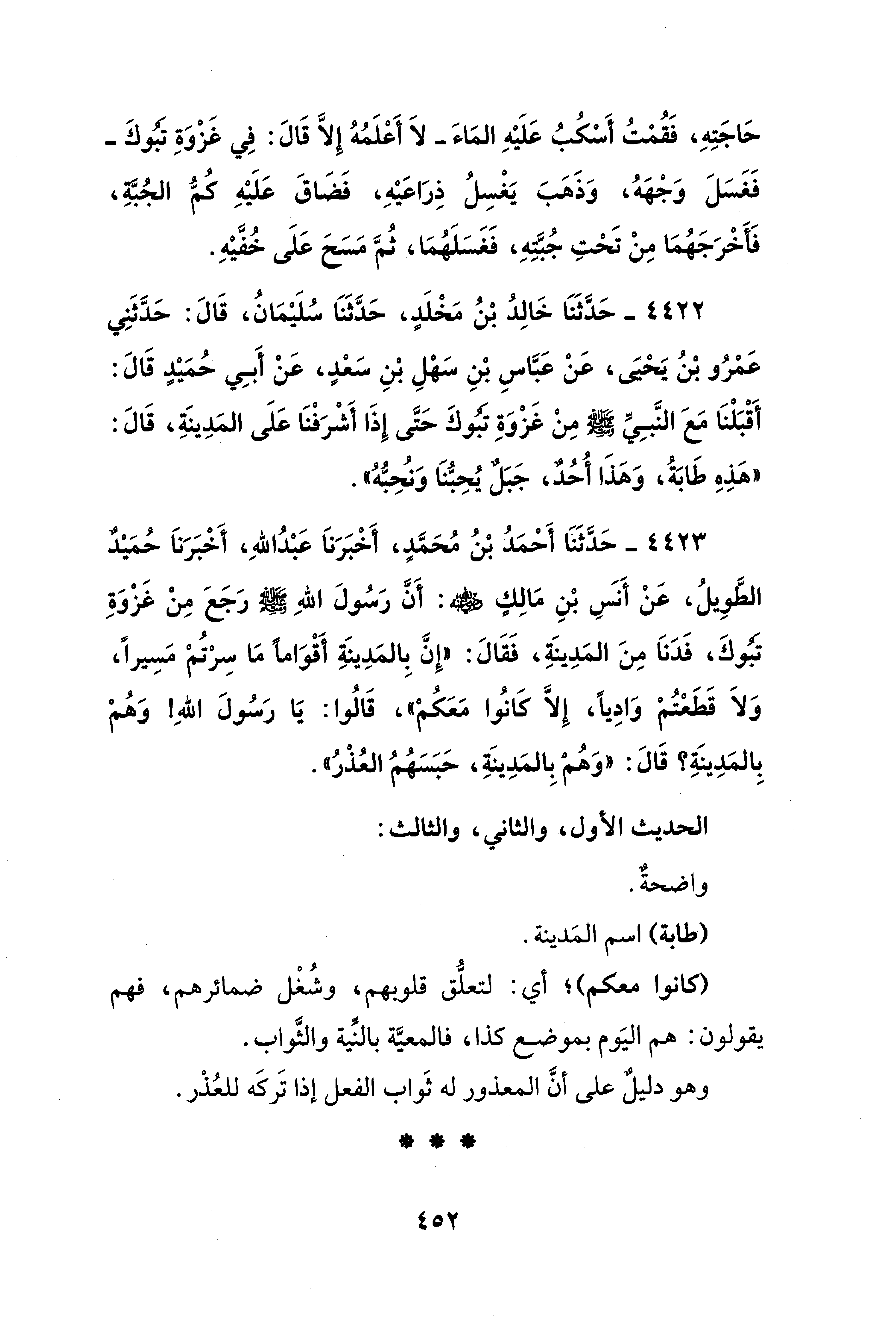 4423 - حَدّثَنَا أَحْمَدُ بْنُ مُحَمَّدٍ، أَخْبَرَنَا عَبْدُ اللهِ، أَخْبَرَنَا حُمَيْدٌ الطَّوِيلُ، عَنْ أَنسِ بْنِ مالك - رضي الله عنه -: أَنَّ رَسُولَ اللهِ - صلى الله عليه وسلم - رَجَعَ مِنْ غَزْوَةِ تَبُوكَ، فَدَنَا مِنَ المَدِينَةِ، فَقَالَ: "إِنَّ بِالمَدِينَةِ أَقْوَامًا مَا سِرْتُمْ مَسِيرًا، وَلَا قَطَعْتُمْ وَادِيًا، إلا كَانُوا مَعَكُمْ" قَالُوا: يَا رَسُولَ اللهِ! وَهُمْ بِالمَدِينَةِ؟ قَالَ: "وَهُمْ بِالمَدِينَةِ، حَبَسَهُمُ العُذْرُ".