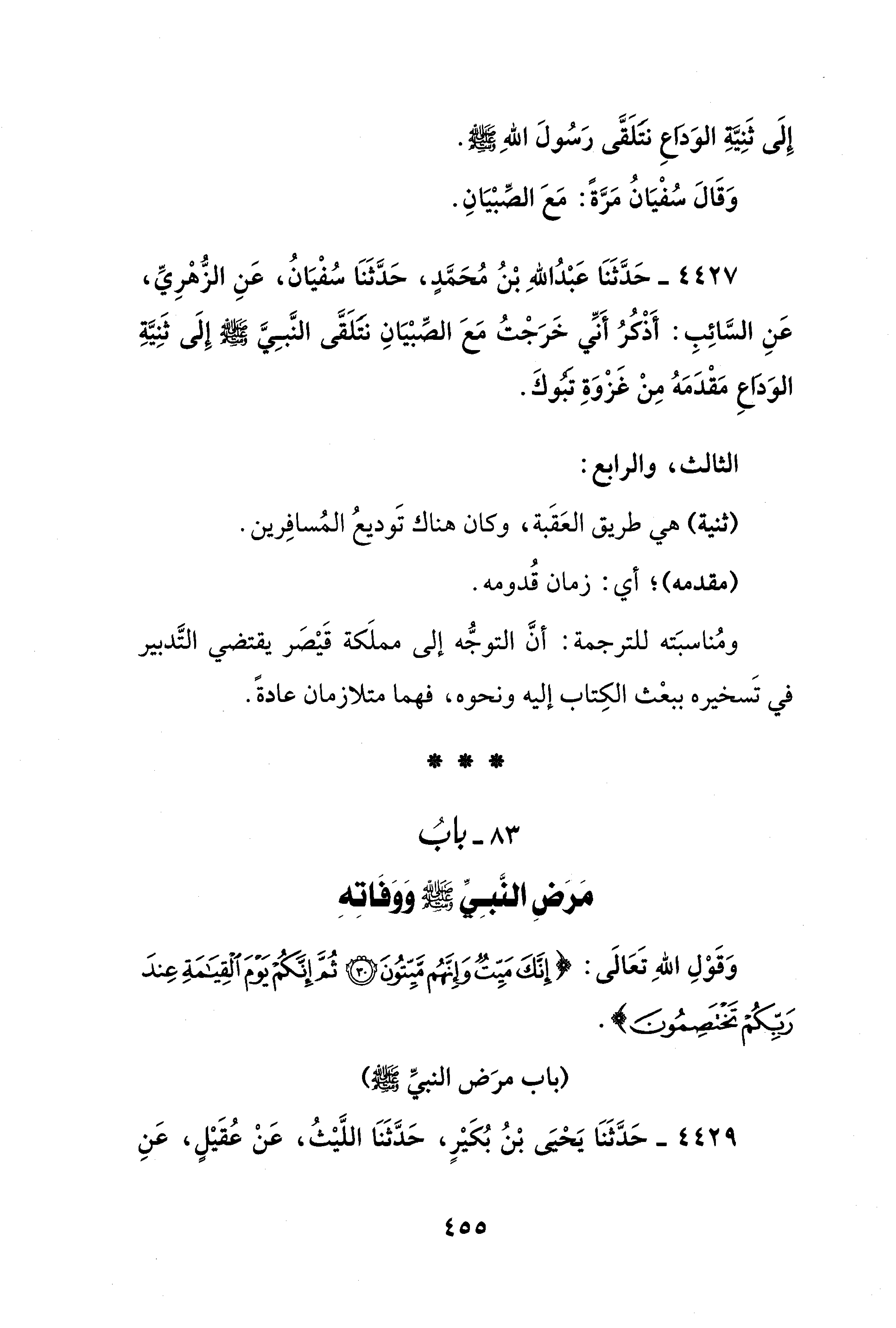 4427 - حَدَّثَنَا عَبْدُ اللهِ بْنُ مُحَمَّدٍ، حَدَّثَنَا سُفْيَانُ، عَنِ الزُّهْرِيِّ، عَنِ السَّائِبِ: أَذْكُرُ أَنِّي خَرَجْتُ مَعَ الصِّبْيَانِ نتَلَقَّى النَّبِيَّ - صلى الله عليه وسلم - إِلَى ثَنِيَّةِ الوَدَاعِ مَقْدَمَهُ مِنْ غَزْوَةِ تبوكَ.