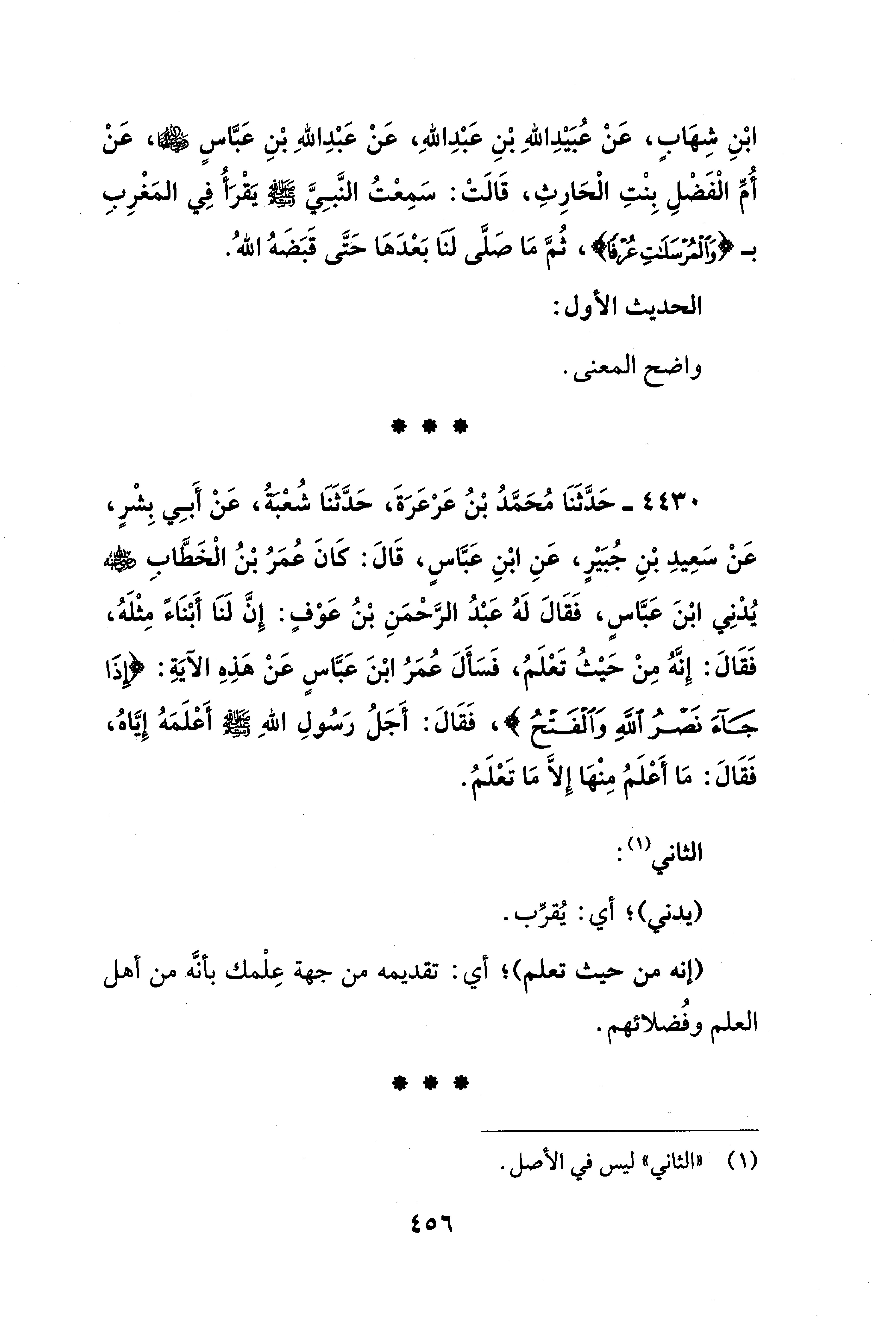 4430 - حَدَّثَنَا مُحَمَّدُ بْنُ عَرْعَرَةَ، حَدَّثَنَا شُعْبَةُ، عَنْ أَبِي بِشْرٍ، عَنْ سَعِيدِ بْنِ جُبَيْرٍ، عَنِ ابْنِ عَبَّاسٍ، قَالَ: كَانَ عُمَرُ بْنُ الْخَطَّابِ - رضي الله عنه - يُدْنِي ابْنَ عَبَّاسٍ، فَقَالَ لَهُ عَبْدُ الرَّحْمَنِ بْنُ عَوْفٍ: إِنَّ لنا أَبنَاءً مِثْلَهُ، فَقَالَ: إِنَّهُ مِنْ حَيْثُ تَعْلَمُ، فَسَأَلَ عُمَرُ ابْنَ عَبَّاس عَنْ هَذِهِ الَآيَةِ: {إِذَا جَاءَ نَصْرُ اللَّهِ وَالْفَتْحُ}، فَقَالَ: أَجَلُ رَسُولِ اللهِ - صلى الله عليه وسلم - أَعْلَمَهُ إِيَّاهُ، فَقَالَ: مَا أَعْلَمُ مِنْهَا إلا مَا تَعْلَمُ.