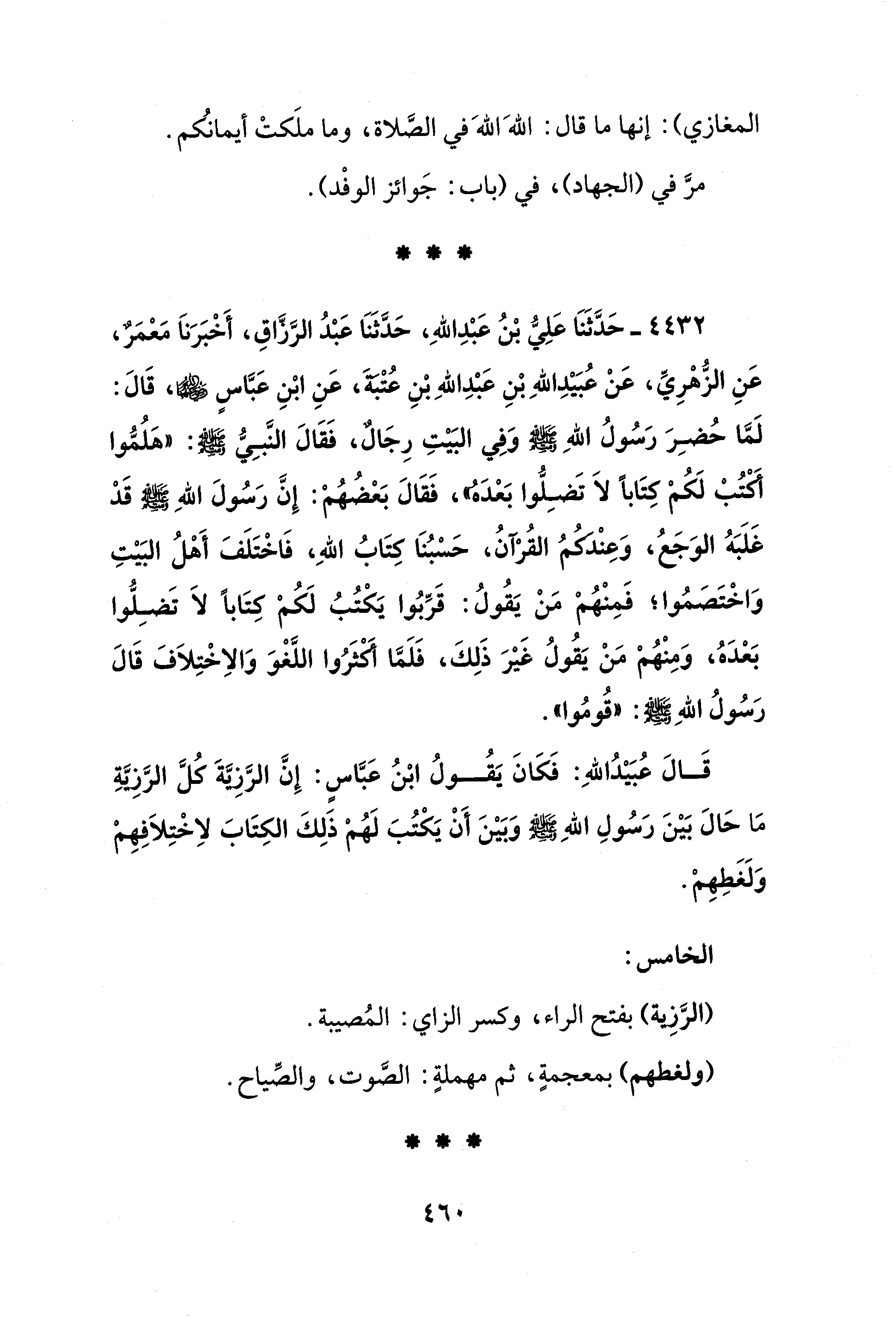 4432 - حَدَّثَنَا عَلِيُّ بْنُ عَبْدِ اللهِ، حَدَّثنا عَبْدُ الرَّزَاقِ، أَخْبَرَنَا مَعْمَرٌ، عَنِ الزُّهْرِيِّ، عَنْ عُبَيْدِ اللهِ بْنِ عَبْدِ اللهِ بْنِ عُتْبَةَ، عَنِ ابْنِ عَبَّاسٍ - رضي الله عنهما -، قَالَ: لَمَّا حُضِرَ رَسُولُ اللهِ - صلى الله عليه وسلم - وَفي البَيْتِ رِجَالٌ، فَقَالَ النَّبي - صلى الله عليه وسلم -: "هَلُمُّوا أَكتُبْ لَكُمْ كِتَابًا لَا تَضِلُّوا بَعْدَهُ"، فَقَالَ بَعْضُهُمْ: إِنَّ رَسُولَ اللهِ - صلى الله عليه وسلم - قَدْ غَلَبَهُ الوَجَعُ، وَعِنْدَكُمُ القُرْآنُ، حَسْبُنَا كِتَابُ اللهِ، فَاخْتَلَفَ أَهْلُ البَيْتِ وَاخْتَصَمُوا؛ فَمِنْهُمْ مَنْ يَقُولُ: قَرِّبُوا يَكْتُبُ لَكُمْ كِتَابًا لَا تَضِلُّوا بَعْدَهُ، وَمِنْهُمْ مَنْ يَقُولُ غير ذَلِكَ، فَلَمَّا أَكثَرُوا اللَّغْوَ وَالاِخْتِلَافَ قَالَ رَسُولُ اللهِ - صلى الله عليه وسلم -: "قُومُوا".