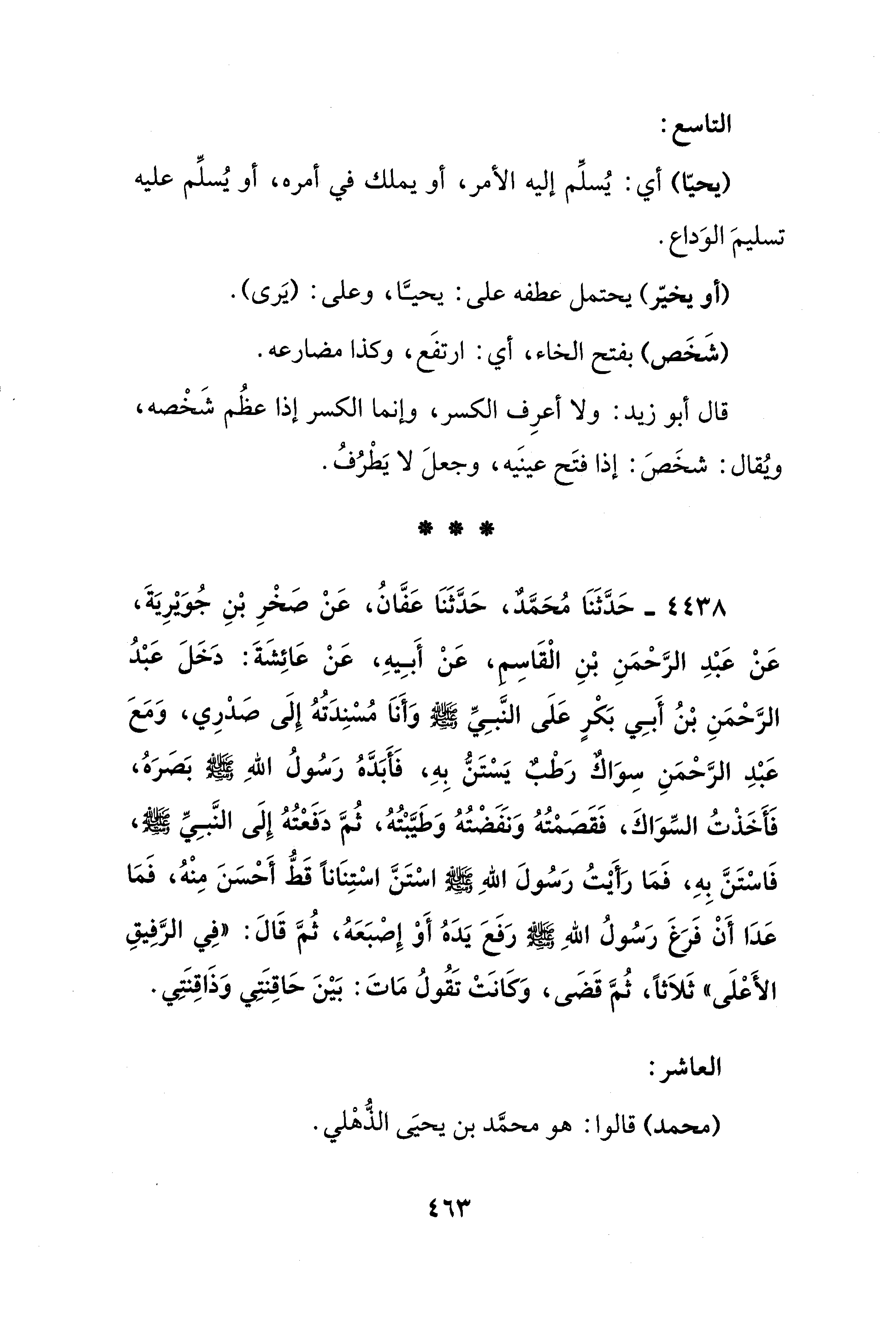 4438 - حَدَّثَنَا مُحَمَّد، حَدَّثَنَا عَفَّانُ، عَنْ صَخْرِ بْنِ جُويرِيَةَ، عَنْ عَبْدِ الرَّحْمَنِ بْنِ الْقَاسِم، عَنْ أَبِيهِ، عَنْ عَائِشَةَ: دَخَلَ عَبْدُ الرَّحْمَنِ بْنُ أَبِي بَكْرٍ عَلَى النَّبِيّ - صلى الله عليه وسلم - وَأَنَا مُسْنِدَتُهُ إِلَى صَدْرِي، وَمَعَ عَبدِ الرَّحْمَنِ سِوَاكٌ رَطْبٌ يَسْتَنُّ بِهِ، فَأَبَدَّهُ رَسُولُ اللهِ - صلى الله عليه وسلم - بَصَرَهُ، فَأَخَذْتُ السِّوَاكَ، فَقَصَمْتُهُ وَنَفَضْتُهُ وَطَيَّبْتُهُ، ثُمَّ دَفَعْتُهُ إِلَى النَّبِيِّ - صلى الله عليه وسلم -، فَاسْتَنَّ بِهِ، فَمَا رَأَيْتُ رَسُولَ اللهِ - صلى الله عليه وسلم - اسْتَنَّ اسْتِنَانًا قَطُّ أَحْسَنَ مِنْهُ، فَمَا عَدَا أَنْ فَرَغَ رَسُولُ اللهِ - صلى الله عليه وسلم - رَفَعَ يَدَهُ أَوْ إِصْبَعَهُ، ثُمَّ قَالَ: "في الرَّفِيقِ الأَعْلَى" ثَلَاثًا، ثُمَّ قَضَى، وَكَانَتْ تَقُولُ مَاتَ: بَيْنَ حَاقِنَتِي وَذَاقِنَتِي.